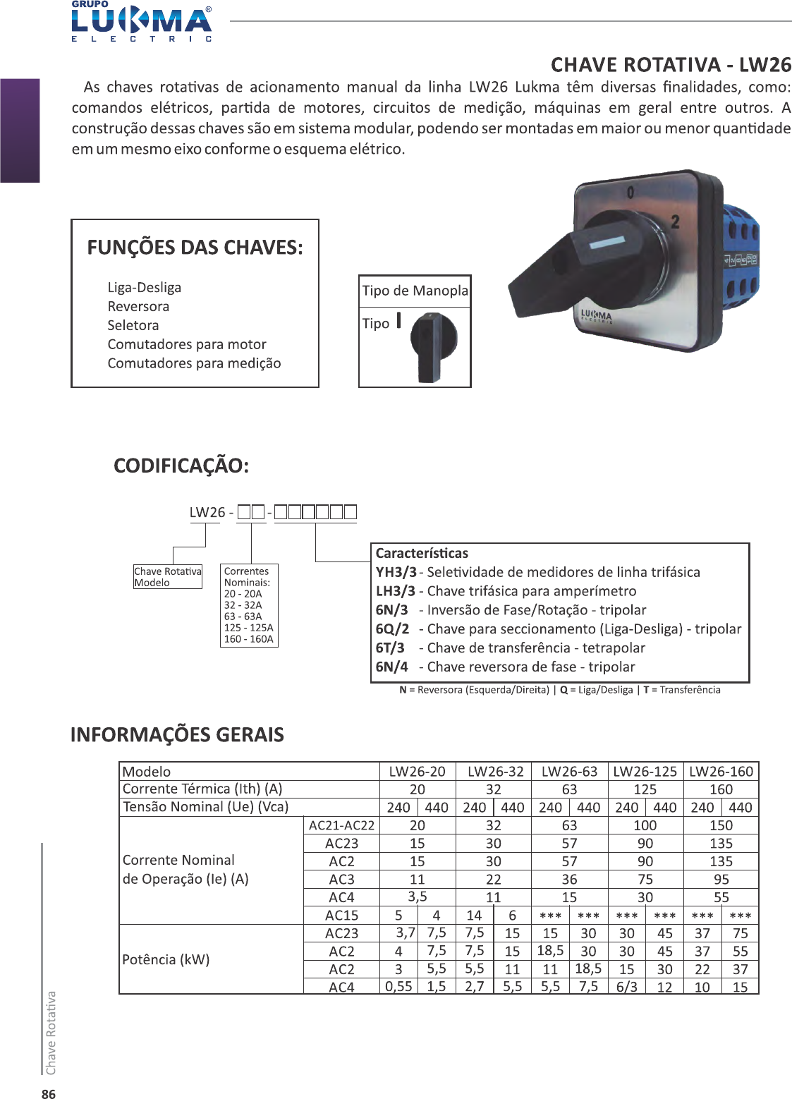 As informações contidas podem sofrer alterações que não afetarão o desempenho e função do produto. Imagens ilustrativas. Revisão: 05/2022 | LUKMA ELECTRIC: +55 17 2138-5050. E-mail: sac@lukma.com | www.lukma.com D2 ø4.5 ø4.5 ø4.5 ø4.5 ø4.5 ø4.5 ø4.5 ø4.5 ø6 ø6 ø6 ø6LW26 - 6T/3 - TRANSF. QUADRADA MODELO PLACA FRONTAL DIMENSÃO INSTALAÇÃO A B E FC L LW26 - 20 6 Q/2 LW26 - 20 6 N/3 LW26 - 32 6 Q/2 LW26 - 32 6 N/3 LW26 - 63 6 Q/2 LW26 - 63 6 N/3 QUADRADA QUADRADA QUADRADA QUADRADA QUADRADA QUADRADA QUADRADA QUADRADA RETANGULAR 48 48 64 64 64 64 48 48 64 64 64 64 43 43 58 58 66 66 41 52 56 68 72 94 36 36 48 48 48 48 36 36 48 48 48 48 REF. 25001 25002 25003 25004 25005 25006 25007 25008 25014 25015 25016 25017 LW26 - AMP LH3/3 LW26 - VOLT YH3/3 LW26 - 6N/3 - REVERS. LW26 - 6N/3 - REVERS. LW26 - 6T/4 - TRANSF. 48 60 43 52 36 36 48 60 43 52 36 36 88 88 84 116 68 68 88 88 88 133 68 68 88 88 84 142 68 68 ø8.5 D1 ø8.5 ø10 ø10 ø10 ø10 ø8.5 ø8.5 ø13 ø13 ø13 ø1388 88 88 166 68 68 QUADRADA RETANGULAR REF.: MODELO: CARACTERÍSTICAS CORRENTES POSIÇÕES Chave para seccionamento trifásico (liga-desliga) Inversão de fase/rotação em sistema trifásico Chave para seccionamento trifásico (liga-desliga) Inversão de fase/rotação em sistema trifásico Chave de transferência - tetrapolar Chave para seccionamento trifásico (liga-desliga) Inversão de fase/rotação em sistema trifásico Chave de transferência - tetrapolar Sele�vidade de medidores de linha em sistemas trifásicos Sele�vidade de medidores de linha em sistemas trifásicos Inversão de fase/rotação em sistema trifásico Inversão de fase/rotação em sistema trifásico Chave de transferência - tetrapolar Chave de transferência - tetrapolar 2 POS. 3 POS. 2 POS. 3 POS. 3 POS. 2 POS. 3 POS. 3 POS. 3 POS. 3 POS. 3 POS. 3 POS. 3 POS. 3 POS. 25001 25002 25003 25004 25029 25005 25006 25030 25007 25008 25014 25015 25016 25017 As informações contidas podem sofrer alterações que não afetarão o desempenho e função do produto. Imagens ilustrativas. Revisão: 05/2022 | LUKMA ELECTRIC: +55 17 2138-5050. E-mail: sac@lukma.com | www.lukma.com CHAVE SECCIONADORA CHAVE REVERSORA CHAVE SECCIONADORA CHAVE REVERSORA CHAVE SECCIONADORA CHAVE REVERSORA COMUT. AMPERÍMETRO COMUT. VOLTÍMETRO CHAVE REVERSORA CHAVE REVERSORA CHAVE TRANSFERÊNCIA CHAVE TRANSFERÊNCIA As informações contidas podem sofrer alterações que não afetarão o desempenho e função do produto. Imagens ilustrativas. Revisão: 05/2022 | LUKMA ELECTRIC: +55 17 2138-5050. E-mail: sac@lukma.com | www.lukma.com As informações contidas podem sofrer alterações que não afetarão o desempenho e função do produto. Imagens ilustrativas. Revisão: 05/2022 | LUKMA ELECTRIC: +55 17 2138-5050. E-mail: sac@lukma.com | www.lukma.com As informações contidas podem sofrer alterações que não afetarão o desempenho e função do produto. Imagens ilustrativas. Revisão: 05/2022 | LUKMA ELECTRIC: +55 17 2138-5050. E-mail: sac@lukma.com | www.lukma.com As informações contidas podem sofrer alterações que não afetarão o desempenho e função do produto. Imagens ilustrativas. Revisão: 05/2022 | LUKMA ELECTRIC: +55 17 2138-5050. E-mail: sac@lukma.com | www.lukma.com Página 1 Página 2 Página 3 Página 4 Página 5 Página 6