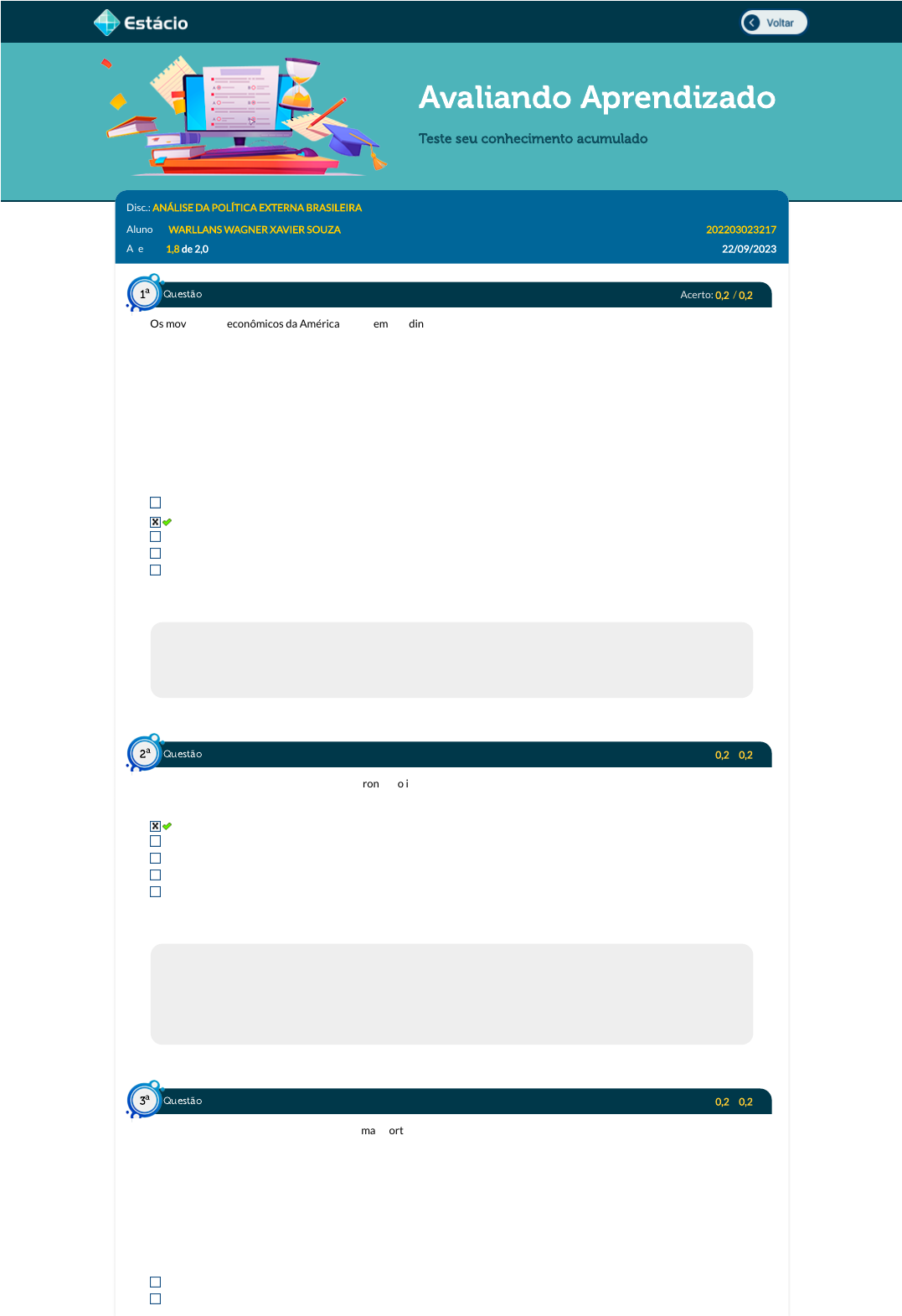22/09/2023, 15:13 Estácio: Alunos https://simulado.estacio.br/alunos/ 1/4 Avaliando Aprendizado Teste seu conhecimento acumulado Disc.: ANÁLISE DA POLÍTICA EXTERNA BRASILEIRA Aluno(a): WARLLANS WAGNER XAVIER SOUZA 202203023217 Acertos: 1,8 de 2,0 22/09/2023 Acerto: 0,2 / 0,2 Os movimentos econômicos da América Latina em sua dinâmica desenvolvimentista foi muito in�uenciada pela CEPAL. Sobre a CEPAL, avalie as a�rmativas abaixo. I - O Brasil é membro da CEPAL, foi um de seus apoiadores e sua política econômica sofreu in�uência cepalina, sendo uma estrutura que visava criar foco e discussão comum para economias diversas. II - A CEPAL é considerada como uma ferramenta de disseminação do comunismo na América Latina e, por isso, o Brasil nunca fez parte, pois ainda que tivesse o interesse, a possibilidade de se afastar dos Estados Unidos era vista como um perigo. III - O pensamento cepalino desenvolvimentista consiste num conjunto de ideias neoliberais apelidadas de Consenso de Washington, que defendiam o �m do Estado e da Fronteira, com ampla liberdade econômica. Está(ão) correta(s): Somente I e III. Somente I. Somente II e III. Somente I e II. Somente II. Respondido em 22/09/2023 14:23:24 Explicação: A CEPAL foi criada no âmbito das Nações Unidas e o Brasil foi um dos países apoiadores do projeto. As ideias cepalinas foram disseminadas no Brasil e in�uenciaram a criação de políticas econômicas, a defesa de articulação econômica e defesa dos interesses comuns dos países membros, além da defesa do crescimento econômico e tecnológico. Acerto: 0,2 / 0,2 A guerra do Paraguai foi um embate que confrontou o império do Brasil e a República do Paraguaia. Este con�ito é resultado das dinâmicas políticas e econômicas da região da(s): Cisplatina. Recôncavo Baiano. Missões Jesuíticas. Colônia de Sacramento. Amazônica. Respondido em 22/09/2023 14:29:36 Explicação: A Guerra do Paraguai é resultada das dinâmicas de poder da região da Cisplatina, a Bacia do Rio da Prata. A região do Prata é de alta importância estratégica para os países da região. E este período foi marcado pelas ambições expansionistas brasileiras, a Argentina também possuía intenções semelhantes, cujo interesse era o de controlar o território do antigo vice-reino do Prata, que pertenceu à Espanha antes das independências das ex-colônias. E Paraguai buscava garantir sua soberania e equilibrar a balança de poder na região. Acerto: 0,2 / 0,2 A tentativa de se tornar um jogador mundial mais forte durante o governo Lula foi uma missão do Itamaraty. Sobre o tema, analise as a�rmações abaixo e, em seguida, assinale a alternativa que apresenta corretamente características da política externa brasileira do período. I - Investimentos em países em desenvolvimento de América Latina e África. II - Atuação junto aos BRICS em questões mundiais. III - Atuação nos encontros de clima, buscando estar alinhado com as agendas de clima. Estão corretas as a�rmações. Somente III. Somente I e II. Questão1 a Questão2 a Questão3 a https://simulado.estacio.br/alunos/inicio.asp https://simulado.estacio.br/alunos/inicio.asp javascript:voltar(); javascript:voltar(); 22/09/2023, 15:13 Estácio: Alunos https://simulado.estacio.br/alunos/ 2/4 I, II e III. Somente I. Somente II. Respondido em 22/09/2023 14:41:15 Explicação: O papel de destaque internacional do governo Lula foi fruto do contexto internacional ou das ações políticas efetivas. São opções diplomáticas e objetivos sistemáticos. A nova dinâmica ao sul, o papel dos BRICS, a liderança chinesa, as disputas e fragilidades enfrentadas em outras praças geraram a forte impressão de uma mudança da ordem e um novo papel. A atuação nas agendas internacionais do clima também são marca do governo Lula. Acerto: 0,2 / 0,2 O século XXI apresenta muitos desa�os e oportunidades. A emergente ordem multipolar abre portas enquanto fecha outras. Em face desse contexto, marque a alternativa que melhor de�ne os desa�os brasileiros para este século. Mitigar a desigualdade social e contestar as assimetrias de poder na ordem internacional; fortalecer a democracia e melhorar suas relações com os EUA. Buscar diversi�car suas parcerias estratégicas em direção à cooperação Sul-Sul, além de fortalecer a democracia e diminuir as disparidades socioeconômicas. Reduzir as disparidades sociais, superar as crônicas vulnerabilidades externas, concretizar seu imenso potencial e fortalecer a democracia. Fortalecer a democracia, se tornar uma liderança regional e intensi�car a cooperação Sul-Sul. Fortalecimento da democracia e melhora na relação com os EUA. Respondido em 22/09/2023 14:39:44 Explicação: Atacar as graves disparidades internas e vulnerabilidades externas constituem um objetivo combinado imprescindível para alavancar o projeto de Estado nação brasileiro, mediante a realização de seu potencial e, consequentemente, com o fortalecimento das instituições democráticas, sempre fortalecidas com sociedades mais justas e igualitárias. Esses desa�os surgem em meio a um cenário internacional em transformação, no qual o desa�o geral é a construção de um mundo multipolar que seja mais favorável ao Brasil. As expectativas em torno da PEB são, ao mesmo tempo, recheadas de esperança e niilismo. Acerto: 0,2 / 0,2 Leia as alternativas abaixo: A�rmativa I Havia a expectativa de que a crise do subprime (EUA, 2008) alcançasse as potências econômicas tradicionais e esses Estados cedessem espaço para os BRICS. A�rmativa II Entretanto a falta de uma visão de longo prazo, a desvalorização do perigo que a crise representava e a falta transparência na gestão pública, fez com esses países, de formas diferentes, fossem alcançados pela crise, ainda que tardiamente. Assinale a correta relação entre as a�rmativas: As a�rmativas não estão relacionadas. As duas a�rmativas 
