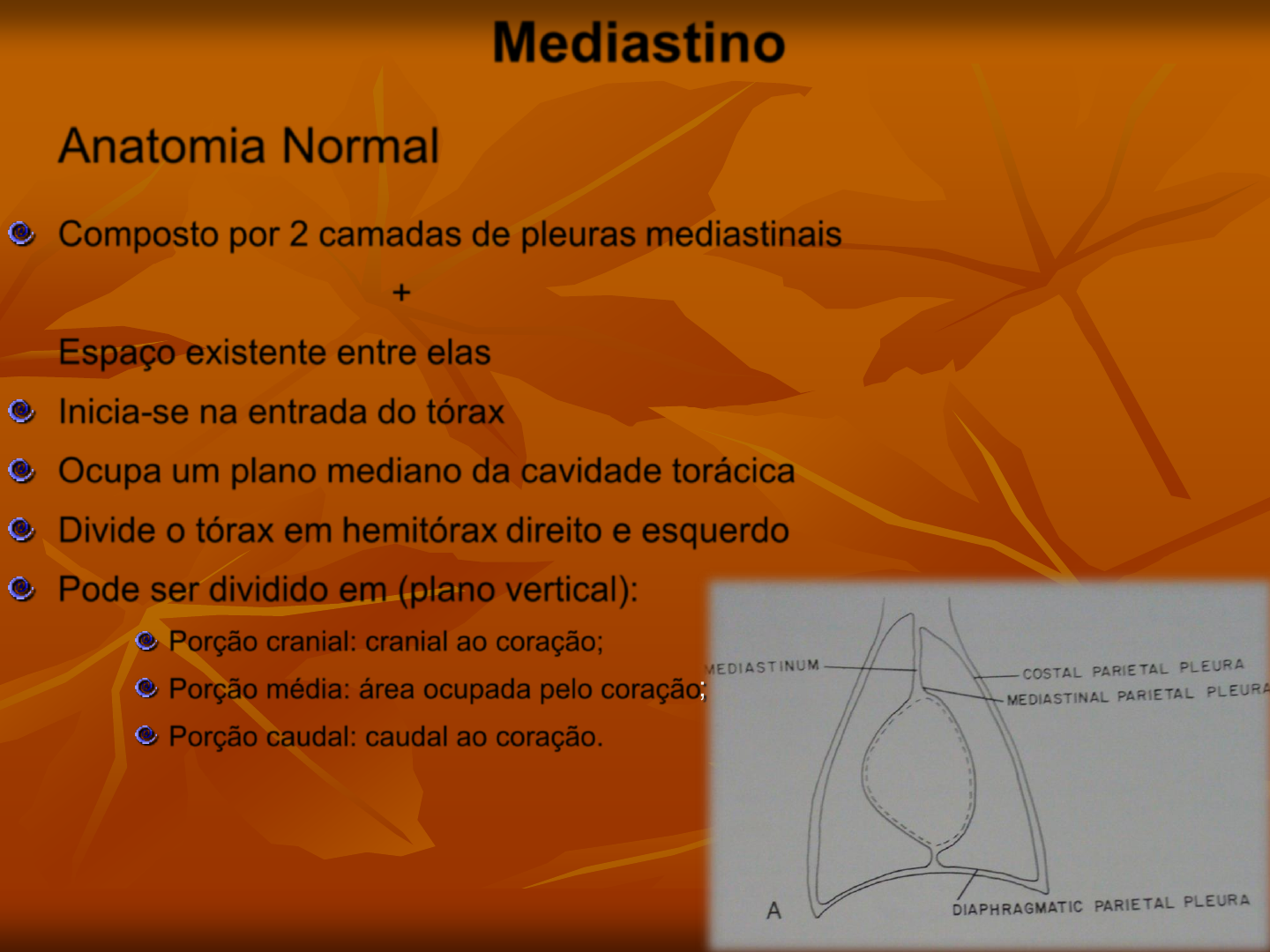 Mediastino Anatomia Normal Composto por 2 camadas de pleuras mediastinais + Espaço existente entre elas Inicia-se na entrada do tórax Ocupa um plano mediano da cavidade torácica Divide o tórax em hemitórax direito e esquerdo Pode ser dividido em (plano vertical): Porção cranial: cranial ao coração; Porção média: área ocupada pelo coração; Porção caudal: caudal ao coração. Mediastino Anatomia Normal Pode ser dividido em (plano horizontal): Porção dorsal; Porção ventral. De acordo com a posição da bifurcação da traquéia. O mediastino não é um espaço sem comunicação: Cranialmente: comunica-se com os planos das fáceas do pescoço, na entrada do tórax; Caudalmente: comunica-se com o espaço retro-peritoneal pelo hiato aórtico; Isto permite a disseminação de doenças mediastinais para o pescoço e abdome e vice-versa Mediastino Mediastino Anatomia Normal Órgãos que podem ser avaliados radiograficamente: Traquéia Coração Veia cava caudal Aorta Timo (em animais jovens) Esôfago (ocasionalmente) Os demais órgãos não podem ser vistos por que: Não são grandes o suficientes; Gordura insuficiente para que haja contraste; Sinal de silhueta (contato entre órgãos, gerando uma imagem única) Mediastino Anatomia Normal Normalmente a melhor projeção é a LL Na VD ocorre sobreposição com as vértebras Normalmente a largura do mediastino nesta projeção é menor que 2x a largura da vértebra adjacente Cuidado com artefatos gerados pelas flexões mediastinais: Cranioventral Caudoventral “Plica vena cava” Cuidado com o Timo (principalmente em animais jovens) Timo Mediastino Patologias Normalmente divididas em 4 grupos: Deslocamento do mediastino Massas mediastinais Líquido livre em mediastino Pneumomediastino Deslocamento do Mediastino Causas: Aumento de volume de lobo(s) pulmonar(s) unilateral: desvio contralateral Diminuição de volume de lobo(s) pulmonar(s) unilateral: desvio ipisilateral Massas intratorácicas: desvio contralateral Mediastino Patologias – Desvio de Mediastino / Massas Mediastinais Melhor avaliação para diagnóstico – projeção VD Cuidado com o posicionamento – falsos positivos Massas Mediastinais Bastante freqüentes Projeção VD fornece a melhor avaliação Cuidado na diferenciação de massas no mediastino e massas pulmonares que encostam/desviam o mediastino Na LL, massas em mediastino cranial normalmente causam desvio dorsal da traquéia O US também pode auxiliar na avaliação do mediastino cranial Mediastino Patologias – Massas Mediastinais Linfonodos existentes no mediastino: Linfonodos do mediastino cranial Linfonodos esternais (caninos – 2; felinos – 1) Linfonodos traqueobronquiais (base do coração) Mediastino Patologias – Pneumomediastino Pneumomediastino É a presença de gás livre no mediastino Este gás vai gerar grande contraste radiográfico, permitindo identificação dos órgãos do local O tamanho do mediastino varia pouco com a presença de gás livre, mesmo quando em grande quantidade Pode evoluir para pneumotórax por ruptura da pleura Mediastino Patologias – Pneumomediastino Pode gerar enfisema de subcutâneo (comunicação cranial) Pode gerar pneumoretroperitôneo (comunicação caudal) Causas de pneumomediastino: Direcionamento de gás livre em subcutâneo de pescoço (ruptura de traquéia, p.ex.) Perfuração na traquéia (porção mediastínica): trauma, neoplasia Perfuração esofágica (neoplasia, trauma, corpo estranho) Direcionamento de gás em região retroperitonel Organismo produtor de gás instalado no mediastino Mediastino Patologias – Pneumomediastino
