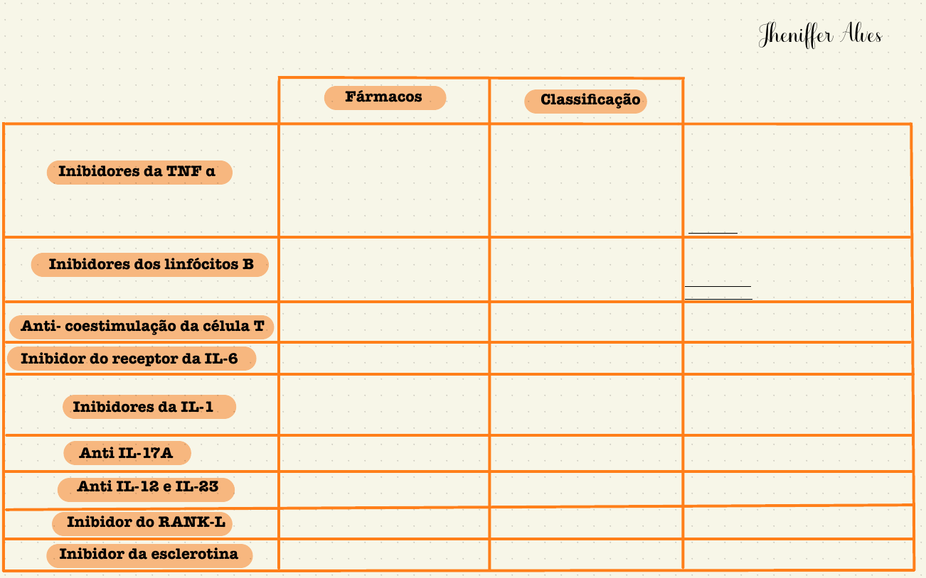 Imunobiológicos Inibidores da TNF α Inibidores dos linfócitos B Anti- coestimulação da célula T Inibidores da IL-1 Anti IL-17A Anti IL-12 e IL-23 Inibidor do RANK-L Inibidor da esclerotina Infliximabe Adalimabe Atanercepte Golimumabe Certolizumabe Rituximabe (CD20) Belimumabe Abatacepte TocilizumabeInibidor do receptor da IL-6 Anakinra Canaquinumabe Rilonacepte Secuquinumabe Ustequinumabe Desosumabe Romosozumabe Quimérico Humano Proteína de fusão Humano Humanizado Quimérico Humano Humanizado Humanizado Antagonista de receptor Humano Proteína de fusão Humano Humano Humano Humanizado Fármacos Classificação ● Promove respostas pró-inflamatórias; ' ● Tratamento de AR, EpA, AIJ; ● Pode ser usada na Doença de Crohn e retocolite; ● Não devem ser utilizadas em processo infeccioso ativo; ● Pode reativar TB latente; Ituximabe é o que + reativa Hepatite B Não fazer vacinação c/ vírus atenuado ou vivo, pois pode reativar a doença (tríplice viral, BCG, febre amarela); Rituximabe: AR, GPA, PAM; Belimumabe: específico para LES Liga-se às moléculas coestimulantes CD80 e CD86 nas células APC’s, bloqueando a interação destas com o CD28 nas células T; Usado em AR, e AIJ IL-6 pró-inflamatória relacionada a febre e perda ponderal em pacientes com doenças autoimunes Antagonista do receptor da IL-1, impede a mesma de se ligar e realizar sua função; AIJ, gota; Se liga e neutraliza as IL-1β α e IL-1 α Redução das ações mediadas pela IL-17A nas doenças inflamatórias e autoimunes; Usado em psoríase, artrite psoriática e espondilite anquilosante Se liga a subunidade p40 das citocinas IL-12 e 23, inibindo a bioatividades das mesmas; Psoríase, artrite psoriática Se liga ao RANK-L impedindo sua ligação ao RANK, inibindo a ativação osteoclasto, e por conseguinte tem efeito antirreabsortivo Usado na osteoporose Jheniffer Alves Imunossupressores e Imunomoduladores São fármacos que podem alterar (exarcebada ou reduzir) a resposta imune, modificando o curso das doenças por corrigir sistemas imunes desbalanceados. Antimaláricos Metotrexato Leflunomida Sulfassalazina Nome do fármaco Reuquinol (sulfato de hidroxicloroquina Tecnomet Arava Azuflin Classificação Imunomodulador Imunossupressor Indicações LES (1ª escolha), AR, osteoartrite erosiva de mãos AR, prevenção de deformidades da AR Imunossupressor Imunossupressor AR Espondiloartrites AR Farmaco cinética Absorção: rápida, VO Excreção: renal, cutânea e intestinal Distribuição: córnea, retina e pele (coloração acinzentada) Administração: VO, IM, SC Excreção: renal Administração: VO Metabólito ativo: teriflunomida (meia vida longa - 2 anos) Excreção: renal e TGI Administração: VO Excreção: 5-ASA intacta pelas fezes Jheniffer Alves Monitoramento Trimestral Anual c/ oftalmologista o/ avaliar risco de toxicidade retiniana W Trimestral Creatininda, ácido fólico 24h após o metotrexato Trimestral Trimestral Hemograma, TGO e TGP Mecanismo de ação Inibe antígenos, impedindo que o processo imunológico; ↓níveis de citocinas pró inflamatórias ; Bloqueio da imunidade inata e adaptativa Interfere na habilidade do ácido fólico; ↑de adenosina; Inibição de proliferação de linfócitos Apoptose de células T ativadas Inibe a síntese de pirimidinas; Inibe metaloproteínas (erosão óssea); Inibe a adesão de leucócitos; Bloqueio da ativação de Jack 1 e 3 Inibição da expressão jTNF; Inibição da formação de osteoclastos; ↓da secreção de citocinas inflamatórias IL-8 Efeitos adversos Miopatia; Neuropatia periférica; Hemólise (clínica de anemia); Hiperpigmentação cutânea; ↓ do limiar convulsivante; Toxicidade retiniana (olho de búfalo) Estomatite; Alopécia reversível; Toxicidade hematológica; Toxicidade hepática; Pneumonite intersticial S C Alopécia reversível; HÁ; Neuropatia periférica; Hepatotoxidade; Toxidade hematológica G Dispepsia/ anorexia; Oligospermia reversível; Pancitopenia; Hepatotoxidade Azatioprina Micofenolato Ciclofosfamida Ciclosporina Nome do fármaco Imuran Micofenolato de mofetila Micofenolato de sódio Genoxal Uromitexan Classificação Imunossupressor Imunossupressor Imunossupressor Imunossupressor Sandimmun Indicações Lúpus Pós transplante LES Pós transplante Vasculites Pós transplante Nefrite lúpica AIJ Terapia paliativa de câncer de mama metastático Doenças autoimunes c/progressão ameaçadora como formas graves e/ ou progressivas de nefrite lúpica e granulomatose de Wegener Farmaco cinética Administração: VO Metabólito ativo: 6-MP (toxicidade hematológica Excreção: renal Administração: VO Metabólito ativo: AMF (ácido micofenólico) Excreção: renal e biliar Administração: EV ou VO Metabólito ativo: mostrada fosforamida e acroleína (causa cistite hemorrágica) Excreção: renal Administração:VO ou tópica (oftalmologia) Excreção: biliar Nefrotóxica Jheniffer Alves Monitoramento Trimestral Creatinina, hemograma, TGO e TGP Trimestral Hemograma Mensal (hemograma de controle, TGO, TGP, creatinina) Trimestral (hemograma, creatinina, transaminases, AU, perfil lipídico, eletrólitos, esferição de PA) Mecanismo de ação ↓da síntese de purina intracelular; ↓ de linfócitos B e T; ↓ da síntese de Igs; Inibição da proliferação e migração de linfócitos; ↓ produção de anticorpos; Indução de apoptose de linfócitos T; Atividade metabólica Ação citotóxica em linfócitos; ↓ de linfócitos B e T; ↓ produção de anticorpos Inibe a calcineurina; ↓ transcrição de genes da IL-2,3,4; ↓ proliferação de linfócitos T Efeitos adversos Hiperplasia gengival; Hirsutismo; HA; Hipercalcemia; Nefro/neuro toxicidade; Alterações metabólicas Supressão medular (pancitopenia); Neoplasias; Hepatotoxidade Leucopenia e anemia; Neoplasias linfoproliferativas (leucemias/linfomas); Hepatotoxidade Alopécia reversível; Infecções; Falência ovariano/infertilidade; Azoospermia; Cist