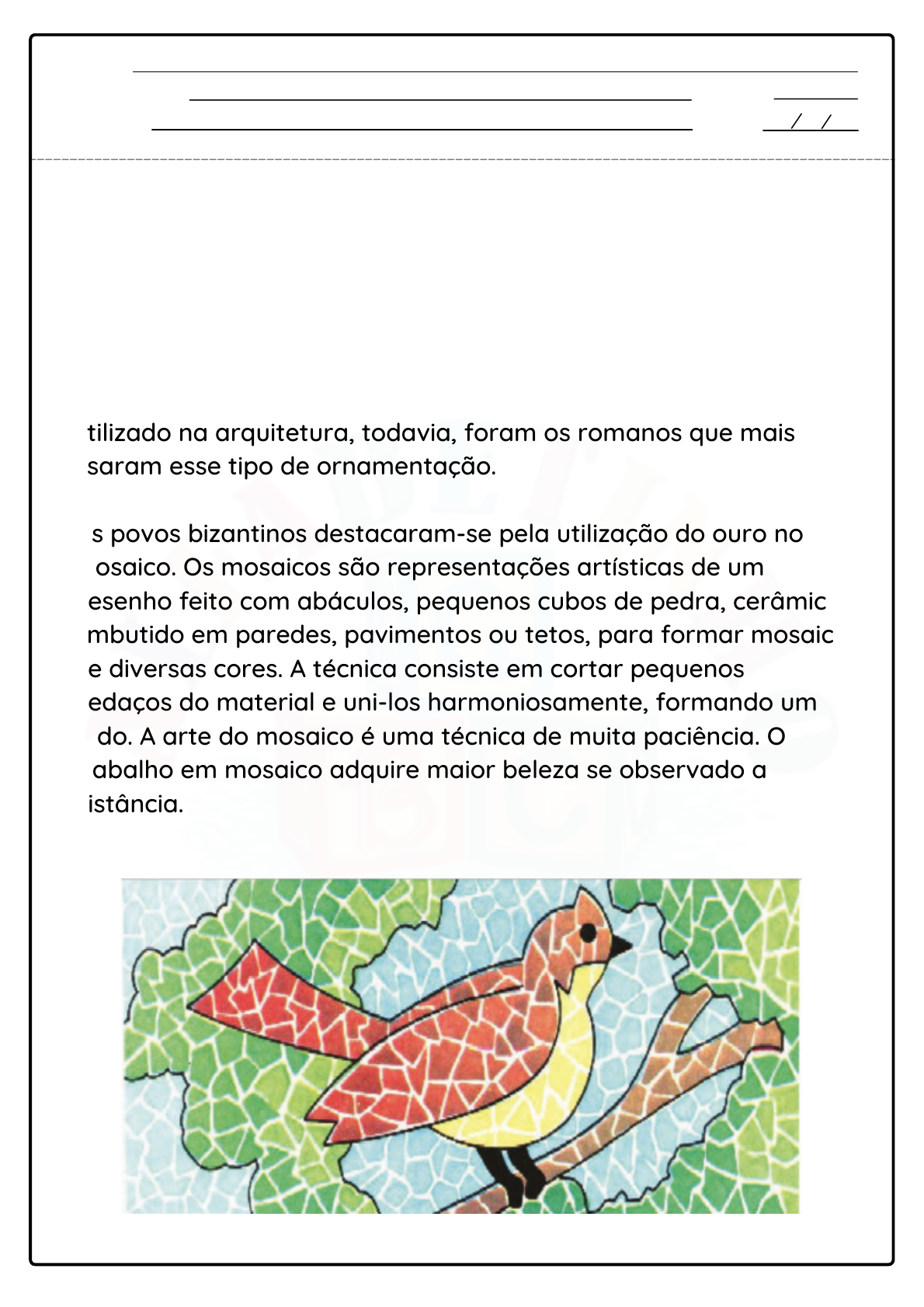 Escola: Professor(a): Turma: Aluno(a): Data: O mosaico é uma das artes decorativas mais antigas. É originário das civilizações egípcias e assíria e estendeu-se por todo Oriente Médio. Na Grécia, o mosaico tomou impulso, sendo bastante utilizado na arquitetura, todavia, foram os romanos que mais usaram esse tipo de ornamentação. Os povos bizantinos destacaram-se pela utilização do ouro no mosaico. Os mosaicos são representações artísticas de um desenho feito com abáculos, pequenos cubos de pedra, cerâmica, embutido em paredes, pavimentos ou tetos, para formar mosaico de diversas cores. A técnica consiste em cortar pequenos pedaços do material e uni-los harmoniosamente, formando um todo. A arte do mosaico é uma técnica de muita paciência. O trabalho em mosaico adquire maior beleza se observado a distância. Objetivos de aprendizagem e desenvolvimento: Habilidades (EF15AR01) MOSAICO Escola: Professor(a): Turma: Aluno(a): Data: Objetivos de aprendizagem e desenvolvimento: Habilidades (EF15AR01) Use essa folha para produzir o seu mosaico! Escola: Professor(a): Turma: Aluno(a): Data: Objetivos de aprendizagem e desenvolvimento: Habilidades (EF15AR07) O artista Ivan Cruz nasceu em 1947 no Rio de Janeiro. Formou-se na escola de belas artes da Universidade do Rio de Janeiro (UFRJ). Organizou em 1999 a mostra temática: "As brincadeiras de infância". Suas obras já ilustraram camisetas , imãs de geladeira e até jogos da memória. Escola: Professor(a): Turma: Aluno(a): Data: Objetivos de aprendizagem e desenvolvimento: Habilidades (EF15AR07) Interpretando as informações do texto: 1) Qual o nome do artista que o texto retrata? 2) Onde esse artista se formou? 3) Como era o nome da mostra que ele organizou? Escola: Professor(a): Turma: Aluno(a): Data: Objetivos de aprendizagem e desenvolvimento: Habilidades (EF15AR01) "Brinquedos e brincadeiras" - Ivan Cruz Faça uma lista dos elementos que compõem essa obra: Escola: Professor(a): Turma: Aluno(a): Data: Objetivos de aprendizagem e desenvolvimento: Habilidades (EF15AR01) "Brinquedos e brincadeiras" - Ivan Cruz 1) Como é o nome da obra? 2) Quem foi o artista que a confeccionou? Escola: Professor(a): Turma: Aluno(a): Data: Objetivos de aprendizagem e desenvolvimento: Habilidades (EF15AR01) Faça uma releitura a partir dessa obra: Escola: Professor(a): Turma: Aluno(a): Data: Objetivos de aprendizagem e desenvolvimento: Habilidades (EF15AR04) Cores primárias AMARELO AZUL VERMELHO Observe novamente e responda Escola: Professor(a): Turma: Aluno(a): Data: Objetivos de aprendizagem e desenvolvimento: Habilidades (EF15AR04) 1) O artista usa essas cores na obra? 2) Em quais elementos essas cores estão presentes? Escola: Professor(a): Turma: Aluno(a): Data: Objetivos de aprendizagem e desenvolvimento: Habilidades (EF15AR04) Com ajuda do seu professor, faça um barquinho de dobradura e cole neste espaço. Use a criatividade para elaborar um plano de fundo para colocá-lo usando apenas as cores primárias. Escola: Professor(a): Turma: Aluno(a): Data: Objetivos de aprendizagem e desenvolvimento: Habilidades (EF15AR04) Essa atividade você poderá fazer num dia de sol, em qualquer lugar da sua casa onde a luz solar projete sombra no seu papel! Você é uma criança ativa? Aposto que você falou sim! As crianças são naturalmente criativas e deixam sempre a imaginação rolar solta. Afinal, o que é criatividade? Ser criativo é ser capaz de encontrar soluções para se divertir sozinho, descobrir maneiras diferentes de usar a mesma coisa, conseguir enxergar uma figura em uma nuvem e imaginar um animal com um simples objeto. Para isso, iremos precisar de um brinquedo, lápis, borracha e material para decorar seu desenho. Na próxima folha, você vai colocar o brinquedo escolhido em qualquer parte do papel e com o lápis, contorne toda sombra do brinquedo que está sendo projetada no papel. Agora você tem uma forma desenhada observe-a e imagine uma figura neste desenho. Avalie essa figura, que forma ela tem? O que poderia ser e onde está? Dê vida a este contorno e complete o desenho. Escola: Professor(a): Turma: Aluno(a): Data: Objetivos de aprendizagem e desenvolvimento: Habilidades (EF15AR04) SOMBRA CRIATIVA Escola: Professor(a): Turma: Aluno(a): Data: Objetivos de aprendizagem e desenvolvimento: Habilidades (EF15AR02) Crie um desenho usando as formas geométricas: Escola: Professor(a): Turma: Aluno(a): Data: Objetivos de aprendizagem e desenvolvimento: Habilidades (EF15AR02) Procure em jornais e revistas objetos que tenham as seguintes formas e cole ao lado de cada uma: Escola: Professor(a): Turma: Aluno(a): Data: Objetivos de aprendizagem e desenvolvimento: Habilidades (EF15AR04) Coloque seu dedo na tinta colorida e vá criando desenhos como bichinhos, flores, frutas etc. Escola: Professor(a): Turma: Aluno(a): Data: Objetivos de aprendizagem e desenvolvimento: Habilidades (EF15AR24) Observeesta obra de Ivan Cruz e liste as brincadeiras que você identificar Escola: Professor(a): Turma: Aluno(a): Data: Objetivos de aprendizagem e desenvolvimento: Habilidades (EF15AR24) Leia as frases e pinte a que está de acordo com a cena retratada pelo artista Ivan Cruz: AS CRIANÇAS BRINCAM DE PETECA AS CRIANÇAS BRINCAM DE PIPA OS MENINOS JOGAM PIÃO OS MENINOS JOGAM BOLA AS CRIANÇAS BRINCAM DE ESTÁTUA AS CRIANÇAS BRINCAM DE CABRA-CEGA Escola: Professor(a): Turma: Aluno(a): Data: Objetivos de aprendizagem e desenvolvimento: Habilidades (EF15AR24) (EF15AR04) Utilize essa folha para produzir o seu mosaico Escola: Professor(a): Turma: Aluno(a): Data: Objetivos de aprendizagem e desenvolvimento: Habilidades (EF15AR24) Observe a obra "Brincadeira de criança" do artista Ivan Cruz: 1) Qual é a brincadeira retratada na obra? 2) Quem está brincando? E onde? 3) Quais cores o artista utiliza na obra? 4) Você gostou da obra? Por que? Escola: Professor(a): Turma: Aluno(a): Data: Objetivos de aprendizagem e desenvolvimento: Habilidades (EF15AR24) O