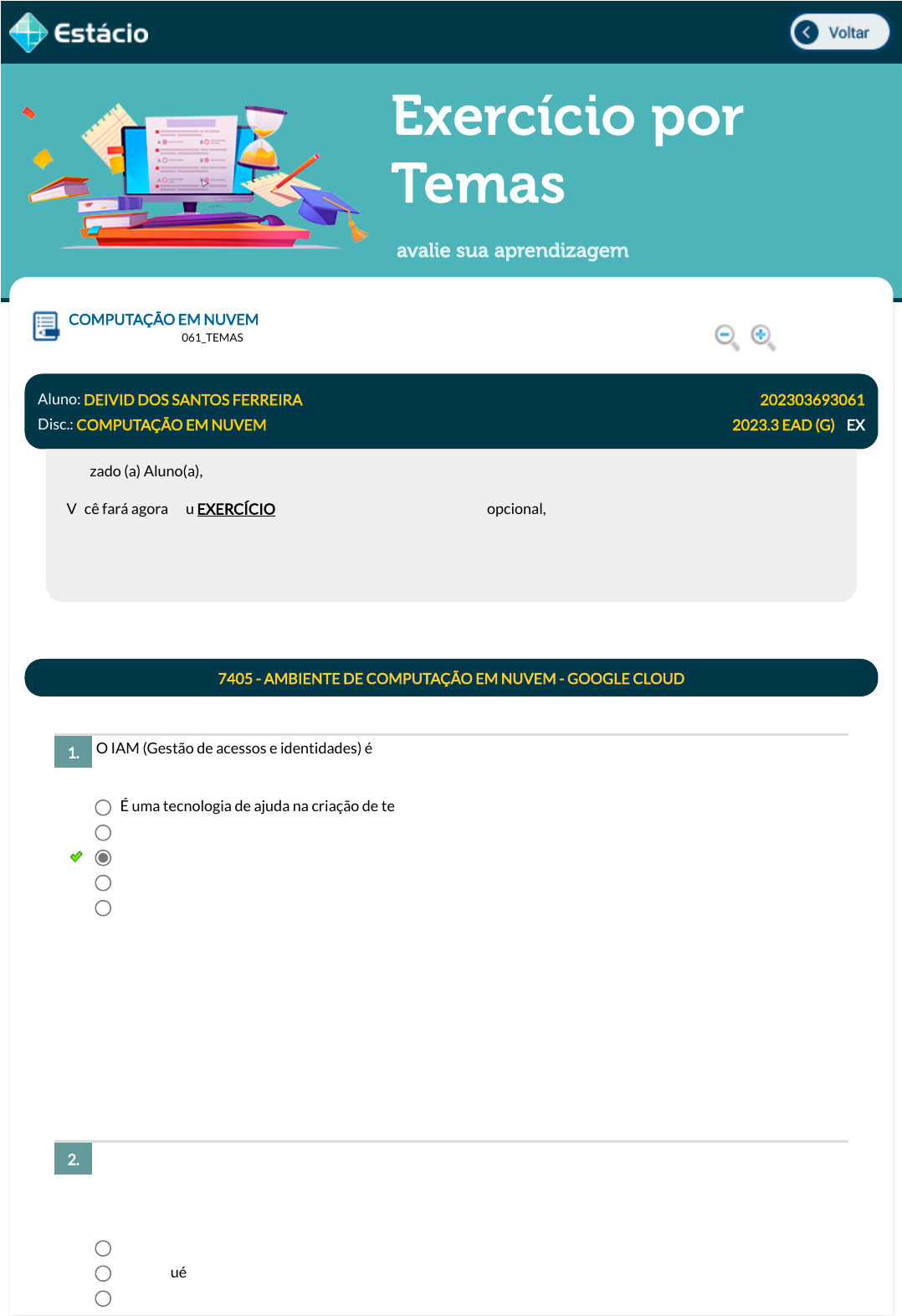 24/09/2023, 20:38 Estácio: Alunos https://simulado.estacio.br/alunos/ 1/6 Exercício por Temas avalie sua aprendizagem O IAM (Gestão de acessos e identidades) é um componente extremamente importante para a segurança em nuvem. Qual é sua principal função? Um usuário sofreu um ataque devido a uma biblioteca customizada desatualizada em sua aplicação. Esse usuário utilizava uma plataforma IaaS no Google Cloud. De quem é a principal responsabilidade sobre a aplicação neste caso? COMPUTAÇÃO EM NUVEM Lupa DGT1334_202303693061_TEMAS Aluno: DEIVID DOS SANTOS FERREIRA Matr.: 202303693061 Disc.: COMPUTAÇÃO EM NUVEM 2023.3 EAD (G) / EX Prezado (a) Aluno(a), Você fará agora seu EXERCÍCIO! Lembre-se que este exercício é opcional, mas não valerá ponto para sua avaliação. O mesmo será composto de questões de múltipla escolha. Após responde cada questão, você terá acesso ao gabarito comentado e/ou à explicação da mesma. Aproveite para se familiarizar com este modelo de questões que será usado na sua AV e AVS. 7405 - AMBIENTE DE COMPUTAÇÃO EM NUVEM - GOOGLE CLOUD 1. É uma tecnologia de ajuda na criação de telas de login. É um processo que visa a igualdade e compartilhamento de responsabilidades no ambiente. É um processo que visa controlar o acesso às informações e ações com base no nível de acesso do usuário. É um processo de identidade onde todos os usuários possuem o mesmo nível de acesso. É o gerenciamento de usuários e senhas. Data Resp.: 24/09/2023 20:32:25 Explicação: O IAM (Identity and Access Management, em inglês) é um processo que visa controlar o acesso às informações, recursos e ações do ambiente. O Google Cloud oferece sua solução de IAM integrada à plataforma, e com isso, é possível gerir todos os usuários e qual seu nível de acesso. 2. Do Google, responsável pela IaaS. De ninguém. Parcialmente do usuário. javascript:voltar(); javascript:voltar(); javascript:voltar(); javascript:voltar(); javascript:diminui(); javascript:diminui(); javascript:aumenta(); javascript:aumenta(); 24/09/2023, 20:38 Estácio: Alunos https://simulado.estacio.br/alunos/ 2/6 As máquinas virtuais se tornaram uma parte importante dos computadores, não apenas para o ramo corporativo, mas também para aplicativos em nuvem. No entanto, a virtualização também está disponível para usuários domésticos. Para uso pessoal, a virtualização permite que os usuários executem vários sistemas operacionais em um computador doméstico, como o Windows em um Mac ou Linux em um computador com Windows - e vice- versa. Disponível em: https://www.hardware.com.br/dicas/top-5-melhores-softwares-para-virtualizacao.html. Acesso em: 02 jan. 2023. No contexto do Google, de quem é a responsabilidade do gerenciamento da VM? Acabou de surgir uma nova versão da tecnologia de código livre na qual você trabalha e tem implementado em um sistema, como você deverá proceder com a atualização? Do usuário, pois em uma IaaS ele é responsável pela aplicação. Mista, do Google e do Usuário que compartilham a responsabilidade sobre a aplicação. Data Resp.: 24/09/2023 20:32:51 Explicação: Em uma infraestrutura como serviço, a responsabilidade da aplicação é completamente do usuário. 3. É apenas responsabilidade do Google fazer o gerenciamento de utilização dos recursos, instalação e atualizações de softwares. Toda infraestrutura física, é provida e gerenciada somente pelo usuário. O usuário é responsável pela segurança da infraestrutura física (hardware) e a aplicação é de responsabilidade mista entre Google e usuário. A responsabilidade é mista. A infraestrutura física (hardware) é gerenciada e suportada pelo Google, e o gerenciamento de utilização de recursos, instalação e atualizações de software, é responsabilidade do usuário. A responsabilidade de gerenciamento da VM é mista. Toda infraestrutura física, é provida e gerenciada pelo usuário, mas o gerenciamento de utilização dos recursos, instalação e atualizações de softwares é de responsabilidade única do Google. Data Resp.: 24/09/2023 20:33:12 Explicação: A responsabilidade de gerenciamento da VM é mista. Toda infraestrutura física é provida e gerenciada pelo Google, mas o gerenciamento de utilização dos recursos, instalação e atualizações de softwares é de responsabilidade única do usuário. O mesmo se aplica para responsabilidades de segurança, onde o Google Cloud é responsável pelo hardware, entretanto, do lado do software quais são instalados nas VMs, é dever do usuário administrar e monitorar. 4. Veri�car qual a versão estável da tecnologia. Atualizar após uma semana de lançamento. Apenas ignorar e manter a versão atual. Nunca alterar de versão. Atualizar imediatamente. Data Resp.: 24/09/2023 20:34:35 Explicação: Alguns consensos básicos de segurança das aplicações é sempre manter as versões de linguagens de programação e frameworks de código livre (Open Source) atualizados para a versão estável, o que não signi�ca necessariamente ser a última disponível. Sempre que uma nova versão de algo é lançada, normalmente ela não é estável, pois ainda não teve o período de amadurecimento, e devido a isso, pode possuir brechas de segurança que ainda não foram descobertas. 24/09/2023, 20:38 Estácio: Alunos https://simulado.estacio.br/alunos/ 3/6 O VPC é uma boa opção para empresas que precisam manter a segurança e privacidade de seus dados, além de garantir que apenas usuários autorizados tenham acesso às suas aplicações e recursos na nuvem. É possível con�gurar VPCs no Azure, AWS, Google Cloud entre outros provedores de nuvem. Sobre a VPC, classi�que como verdadeiro ou falso as a�rmativas abaixo: ( ) Para toda infraestrutura alocada em Google Cloud, não é necessário ter uma rede con�gurada. ( ) Uma VPC é um modo de rede seguro, individual e privado, hospedado em Google Cloud, e atrav