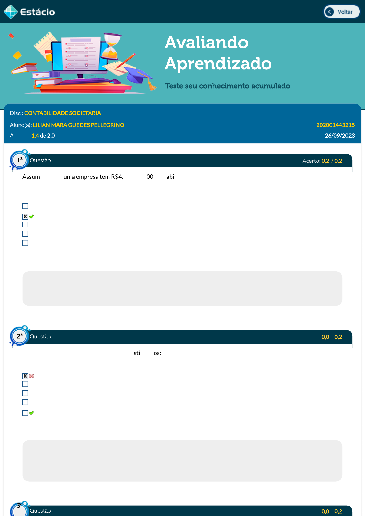 Avaliando Aprendizado Teste seu conhecimento acumulado Disc.: CONTABILIDADE SOCIETÁRIA Aluno(a): LILIAN MARA GUEDES PELLEGRINO 202001443215 Acertos: 1,4 de 2,0 26/09/2023 Acerto: 0,2 / 0,2 Assumindo que uma empresa tem R$4.000.000,00 contabilizados na conta de Lucros Acumulados, R$2.000.000,00 em Lucros do Período, R$20.000.000,00 em seu Patrimônio Líquido, e que a TJLP é de 5%, quanto a empresa pode distribuir de JCP? R$900.000,00 R$1.000.000,00 R$1.100.000,00 R$1.200.000,00 R$1.300.000,00 Respondido em 26/09/2023 12:45:16 Explicação: Ao se calcular 50% dos Lucros Acumulados, 50% do Lucro do Período, e 5% do Patrimônio Líquido vemos que o menor desses três valores é o valor de R$1.000.000,00, que é o resultado da multiplicação da TJLP com o PL. Acerto: 0,0 / 0,2 Empresas podem realizar dois tipos de investimentos: permanentes e temporários. Sobre investimentos permanentes, assinale a alternativa correta. não guarda, necessariamente, relação com a atividade da empresa. precisa de um alto montante envolvido. tem natureza especulativa. possui retorno no curto prazo. está atrelado a utização na produção da empresa. Respondido em 26/09/2023 12:44:05 Explicação: Investimentos permanentes ocorrem quando pessoas jurídicas adquirem ativos que serão utilizados no longo prazo. Essa utilização se dará justamente por meio da operação da empresa. Por isso, esses investimentos são também conhecidos como operacionais. Acerto: 0,0 / 0,2 Questão1 a Questão2 a Questão 3 a https://simulado.estacio.br/alunos/inicio.asp https://simulado.estacio.br/alunos/inicio.asp javascript:voltar(); javascript:voltar(); O Diagrama de árvore representa o quadro societário deste conjunto de empresas. Com base no baseada no Manual FIPECAFI e nos Pronunciamentos Contábeis. Podemos dizer que: Sobre a Empresa I, para �ns de preparação das demonstrações contábeis consolidadas: Ela é coligada à A. Ela é coligada à J. Ela é controlada por A. Ela é coligada à D. Ela possui uma participação indireta de A. Respondido em 26/09/2023 12:47:30 Explicação: A Empresa I possui uma participação indireta de A na porcentagem de 10%×60%=6%. Acerto: 0,2 / 0,2 Proventos são os benefícios - na forma de dinheiro ou de algum direito - que as empresas de capital aberto distribuem aos acionistas. No mercado de ações brasileiro existem diversos tipos de proventos. Estes incluem os dividendos e os juros sobre o capital próprio (JCP), que são os mais conhecidos. Com relação a este tema, a empresa pode distribuir como JCP até: 40% dos lucros do exercício. 50% dos lucros do exercício. 10% dos lucros do exercício. 30% dos lucros do exercício. 20% dos lucros do exercício. Respondido em 26/09/2023 12:46:11 Explicação: Uma empresa pode distribuir através de JCP apenas 50% lucros acumulados de exercícios anteriores ou 50% dos lucros do exercício (qual for o maior). Acerto: 0,2 / 0,2 Uma empresa compra um maquinário como investimento permanente por R$100.000,00 e espera que ele dure 10 anos quando será vendido por sucata por um valor residual irrisório. A depreciação é feita pelo tempo e não pelo uso. Após 8 anos Questão4 a Questão5 a veri�cou-se que caiu a demanda por produção dos produtos que esse maquinário produz, e a expectativa de geração de caixa por esse maquinário é de R$10.000,00 nos próximos 2 anos, com uma in�ação prevista de 6%. A taxa interna de retorno da empresa, medida pelo WACC, é de 18% ao ano. Veri�cou-se que o maquinário poderia ser vendido por R$15.000,00 no estado em que se encontra. O valor a ser reconhecido como impairment é de: R$5.000,00 R$1.888,89 R$ 2.947,43 Não deverá ser reconhecido impairment R$4.000,00 Respondido em 26/09/2023 12:46:25 Explicação: Depreciação total: Valor contábil do bem: 100.000 - 80.000 = 20.000 Calculando o Valor em Uso: 8983,05 + 8.069,52 = 17.052,57 Diferença entre valor contábil e valor recuperável é de: 20.000 - 17.052,57 = 2.947,43. Acerto: 0,2 / 0,2 A empresa A adquire 100% da empresa B e decide pagar a seus acionistas o valor do DCF (�uxo de caixa descontado), utilizando como parâmetros o �uxo de caixa livre atual de $ 30, e uma expectativa de crescimento de 6% ao ano, com uma taxa de desconto de 10% ao ano. O valor dos ativos líquidos da empresa B são de $ 620. Qual o valor do DCF de 20 anos? 745.10 734.95 742.33 760.55 758.33 Respondido em 26/09/2023 12:47:58 Explicação: O DCF correto é calculado da seguinte fórmula: Acerto: 0,0 / 0,2 Uma empresa paga R$0,50 de dividendos por ação e tem 1 milhão de ações emitidas. A sua taxa interna de retorno é de 14% e os analistas projetam crescimento anual de 11% a.a. Qual o valor do valor presente do capital próprio (VPCP) total da empresa? R$10.000.000,00 = 80.000 8X100.000 10 + 10.000 X1,06 1,18 10.000 X1,062 (1,182) Questão6 a Questão7 a R$22.222.222,22 R$16.666.666,67 R$17.650.000,00 R$20.000.000,00 Respondido em 26/09/2023 12:51:58 Explicação: O cálculo do VPCP de uma ação pode ser feito da seguinte forma 1.000.000 × 0,50 / (0,14-0,11) = R$ 16.666.666,67 . Acerto: 0,2 / 0,2 Se o beta de uma empresa aumenta o que acontecerá com o WACC da empresa, mantendo-se as outras variáveis estáveis, e sabendo que o retorno de mercado é superior à Taxa SELIC? Tenderá a zero Diminuirá Tenderá a 1 Aumentará Não se altera Respondido em 26/09/2023 12:52:56 Explicação: Justi�cativa: Como a fórmula do WACC é descrita da seguinte forma: Se M-S>0 , como descrito na questão então o WACC aumentará, mas se M-S<0 , então o WACC diminuirá, e se M=S então o WACC não se alterará. Acerto: 0,2 / 0,2 Uma empresa que chamaremos de Empresa A decide se fundir com a Empresa B, gerando uma nova empresa denominada AB. A Empresa A possui ativo total de $ 500 e passivo total de $ 150. A empresa XYZ possui ativo total de $ 400 e passivo total de $ 350. Qual o Patrimônio Líquido da Empresa AB? 200 400 500 300 600 Respondido em 26