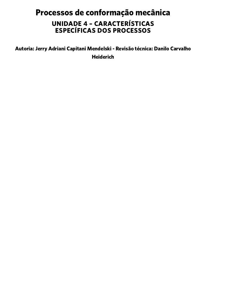 14/03/2023, 21:40 Processos de conformação mecânica https://student.ulife.com.br/ContentPlayer/Index?lc=O4bx%2bveIjI4iHC%2b4woWLAw%3d%3d&l=ZSPXZgMaubqehZmXQ1l3Uw%3d%3d&cd=… 1/19 Autoria: Jerry Adriani Capitani Mendelski - Revisão técnica: Danilo Carvalho Heiderich Processos de conformação mecânica UNIDADE 4 – CARACTERÍSTICAS ESPECÍFICAS DOS PROCESSOS 14/03/2023, 21:40 Processos de conformação mecânica https://student.ulife.com.br/ContentPlayer/Index?lc=O4bx%2bveIjI4iHC%2b4woWLAw%3d%3d&l=ZSPXZgMaubqehZmXQ1l3Uw%3d%3d&cd=… 2/19 Caro(a) estudante, seja bem-vindo(a) a mais uma unidade da disciplina de Processos de Conformação Mecânica. Neste material, você conhecerá características específicas envolvidas em processos de conformação mecânica, enfocando, principalmente, os processos de estampagem e de calandragem. Você sabia que as operações de estampagem podem ser classificadas de diferentes formas? Conforme veremos, esse processo pode ocorrer por meio de corte, de dobra, de repuxos e por embutimento. Para cada uma dessas formas, são necessários diferentes ferramentais, bem como técnicas e materiais com propriedades específicas. Já no que se refere à calandragem, conheceremos as calandras, isto é, as máquinas responsáveis por esse processo. Após isso, finalizaremos nossos estudos descobrindo em que consiste a curva-limite de conformação. Você sabia que essa curva tem como função prever falhas mecânicas no processo de conformação dos materiais? Para isso, as deformações sofridas pelos materiais são comparadas com as curvas obtidas em laboratórios. Bons estudos! Introdução 4.1 Processos de estampagem A atuação da engenharia mecânica abrange certas subáreas, cada uma delas associada à estruturação de um processo produtivo que possibilite uma fabricação mecânica específica. Nesse contexto, encontra-se o processo de estampagem, no qual são utilizadas chapas como matérias-primas para obter produtos com formas e dimensões específicas, processo este que é efetivado com a utilização de prensas. Desse modo, conforme aponta Daleffe (2008), o objetivo comum entre os diferentes processos de estampagem é a deformação de chapas, transformando-as em produtos que apresentem dimensões precisas, formas geométricas definidas e aplicações industriais específicas. Com isso, também cada processo de estampagem terá parâmetros particulares relacionados aos materiais a serem produzidos. A estampagem, como um processo de conformação mecânica, é estabelecida considerando três aspectos principais: geometrias dos ferramentais; propriedades das matérias-primas; e coeficientes de atrito (FOLLE, 2012). Nesse contexto, a depender das particularidades de cada um desses aspectos, a estampagem será subdividida em corte, dobra, embutimento e estiramento. 14/03/2023, 21:40 Processos de conformação mecânica https://student.ulife.com.br/ContentPlayer/Index?lc=O4bx%2bveIjI4iHC%2b4woWLAw%3d%3d&l=ZSPXZgMaubqehZmXQ1l3Uw%3d%3d&cd=… 3/19 Sabendo disso, a seguir, trataremos das características gerais e das aplicações do processo de estampagem para, na sequência, tratarmos de cada uma de suas subdivisões. 4.1.1 Características e aplicações Geralmente, a conformação mecânica realizada pelo processo de estampagem faz uso de três ferramentas principais, conforme definido por Oliveira (2005): Assim, com relação à sua operacionalização, o processo de estampagem é executado com o uso de matrizes, que são projetadas com o objetivo de proporcionar uma peça ou um produto com certas características e formas. #PraCegoVer: fotografia apresentando um processo de estampagem. Nela, um operador realiza a acoplagem de uma chapa plana em uma matriz de estampagem para a execução do processo. Os processos de estampagem são implantados com a combinação de elementos comuns a diversos tipos de ferramentas, sejam estas de corte ou então de conformação. Nesse sentido, são alguns de seus elementos a base inferior, o cabeçote ou a base superior, a espiga, as colunas de guia, a placa de choque, a placa-guia, os pinos de fixação etc. Além disso, há punção: é responsável pela conformação da chapa, promovendo o movimento da chapa para o interior da cavidade; matriz: é responsável pela obtenção da geometria desejada, uma vez que a transmite para a chapa que está sendo conformada; cerra-chapas: tem como função fixar a chapa e controlar o seu escoamento. Figura 1 - Conformação mecânica por estampagem Fonte: Dmitry Kalinovsky, Shutterstock, 2020. 14/03/2023, 21:40 Processos de conformação mecânica https://student.ulife.com.br/ContentPlayer/Index?lc=O4bx%2bveIjI4iHC%2b4woWLAw%3d%3d&l=ZSPXZgMaubqehZmXQ1l3Uw%3d%3d&cd=… 4/19 elementos específicos responsáveis por gerar cada forma desejada, como punções e matrizes (BENAZZI JUNIOR; CAVERSAN, 2012). Na figura a seguir, é possível observar cada um desses elementos presentes em um estampo. #PraCegoVer: ilustração em vista explodida de uma ferramenta de estampo. À esquerda, há uma listagem de componentes presentes no estampo, de 1 a 12. À direita, está a ferramenta de estampo em vista explodida, com flechas indicando cada um de seus componentes: espiga; cabeçote da ferramenta ou base superior; placa de choque; porta-punção; punção; colunas de guia; buchas; pinos de fixação; extrator; guia das chapas; matriz; e base inferior. De acordo Rodrigues e Martins (2005), há diversos fatores associados ao processo de conformação de chapas metálicas, relacionados tanto à natureza mecânica (forma e dimensões da peça, tipo de máquina, forma e dimensões das ferramentas e condições de lubrificação) quanto aos aspectos que englobam a natureza metalúrgica. Além disso, cumpre ressaltar que, conforme explica Folle (2012), a chapa empregada em um processo de estampagem é submetida a diferentes tipos de tensões e de deformações, tendo como resultado a sua geometria fi