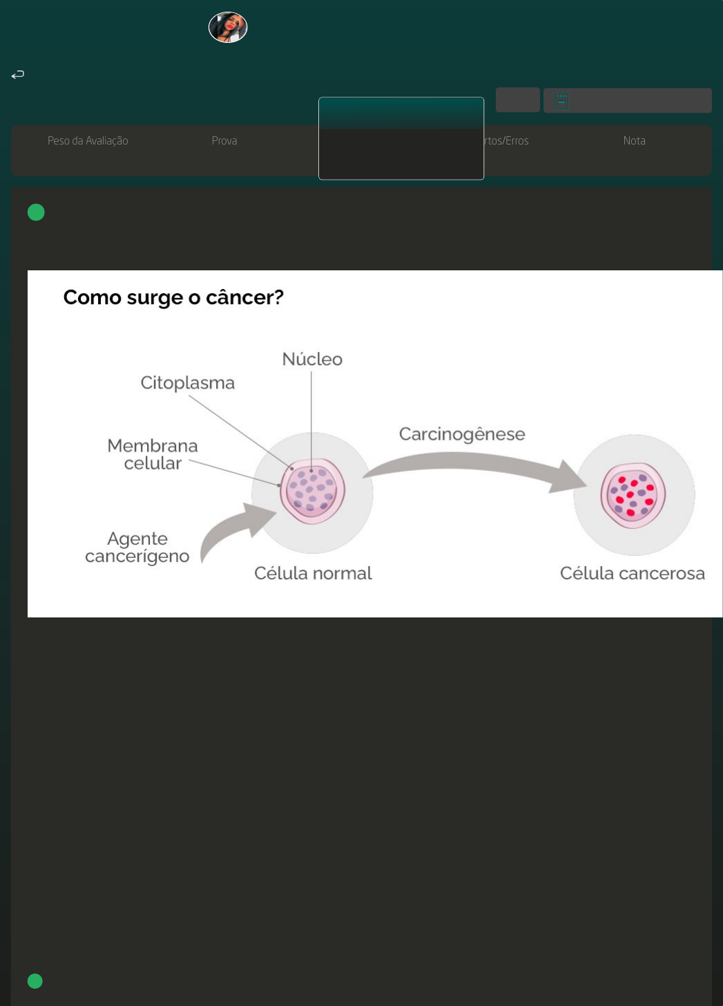 GABARITO | Avaliação I - Individual (Cod.:884768) Peso da Avaliação 1,50 Prova 70663305 Qtd. de Questões 10 Acertos/Erros 10/0 Nota 10,00 O câncer surge a partir de uma mutação genética, ou seja, de uma alteração no DNA da célula, que passa a receber instruções erradas para as suas atividades. As alterações podem ocorrer em genes especiais, denominados proto-oncogenes, que a princípio são inativos em células normais. Quando ativados, os proto-oncogenes se tornam oncogenes, responsáveis por transformar as células normais em células cancerosas. As células que constituem os animais são formadas por três partes: a membrana celular, que é a parte mais externa; o citoplasma (o corpo da célula); e o núcleo, que contém os cromossomos, que, por sua vez, são compostos de genes. Os genes são arquivos que guardam e fornecem instruções para a organização das estruturas, formas e atividades das células no organismo. Toda a informação genética se encontra inscrita nos genes, numa "memória química" – o ácido desoxirribonucleico (DNA). É através do DNA que os cromossomos passam as informações para o funcionamento da célula. O processo de formação do câncer é chamado de carcinogênese ou oncogênese e, em geral, acontece lentamente, podendo levar vários anos para que uma célula cancerosa se prolifere e dê origem a um tumor visível. Os efeitos cumulativos de diferentes agentes cancerígenos ou carcinógenos são os responsáveis pelo início, promoção, progressão e inibição do tumor.!Sobre o exposto, classifique V para as sentenças verdadeiras e F para as falsas: (!!! ) Uma potencial característica das células citadas é a capacidade de se dissipar por todo o organismo utilizando os sistemas linfático e sanguíneo. (!!! ) Sabe-se que a radiação solar em excesso, bem como a exposição prolongada às radiações ionizantes pode ser fator de risco para o surgimento do câncer. (!!! ) As diversas possibilidades de tumores malignos, diagnosticados principalmente no sexo masculino, podem ter associação ao hábito do tabagismo. Assinale a alternativa que apresenta a sequência CORRETA: Fonte: https://www.gov.br/inca/pt-br/assuntos/cancer/como-surge-o-cancer. Acesso em: 16 out. 2022. A F - F - F. B V - F - F. C F - F - V. D V - V - F. VOLTAR A+ Alterar modo de visualização 1 Cinthia Oliveira da Silva Vitorino Marinho Farmácia (3091358) QUAL A SUA DÚVIDA? Acesso ao LeoApp Carteirinha de estudante 20/09/2023 21:32 Página 1 de 5 Existe dentro das ramificações da biologia, a biologia celular, área responsável pelos estudos sobre as células e seus vários tipos, assim como seus principais constituintes e funcionamentos. Esta área cresceu muito após inúmeros avanços tecnológicos que passaram a permitir estudos mais minuciosos, como a invenção do microscópio de feixes de elétrons. Sobre os três principais componentes das células vivas, assinale a alternativa CORRETA: A Membrana plasmática, constituintes celulares e material genético. B Membrana plasmática, citoplasma e núcleo com carioteca. C Membrana celular, citoplasma e constituintes celulares. D Membrana plasmática, citoplasma e mitocôndria. As células do tecido glandular são especializadas na secreção de substâncias. Essas células podem também se proliferar, invadir o tecido conjuntivo adjacente e depois se diferenciar formando as glândulas pluricelulares, conhecidas amplamente apenas por glândulas. As glândulas podem ser classificadas em: exócrinas:!mantêm-se conectadas ao epitélio, formando um ducto que lança secreções para alguma cavidade ou para fora do corpo. São exemplos de glândulas exócrinas as!glândulas mamárias!e!salivares; endócrinas:!!não possuem conexão com o epitélio, lançando suas secreções na corrente sanguínea. São exemplos de glândulas endócrinas a tireoide e a!paratireoide e ainda, glândulas mistas:!!alguns autores consideram como glândulas mistas alguns órgãos que lançam suas secreções tanto na corrente sanguínea como em cavidades abertas. As chamadas glândulas mistas podem apresentar células que exercem tanto a função endócrina quanto a exócrina ou células diferenciadas para as duas funções. Um exemplo de glândula mista é o!pâncreas.. Na sua parte endócrina, secreta os hormônios insulina e glucagon e lança-os na corrente sanguínea. Já na parte exócrina, secreta o suco pancreático, que é lançado no intestino delgado.!Sobre o exposto, analise as sentenças a seguir: I- O tecido epitelial é formado por células justapostas e sempre secretam substâncias em cavidades corpóreas. II- O tecido epitelial não possui vasos sanguíneos e sua nutrição é feita pelo tecido nervoso. III- Como exemplo de glândulas endócrinas temos a tireoide e a paratireoide. IV- Glândulas mistas são aquelas que lançam suas secreções na corrente sanguínea e em cavidades abertas.Assinale a alternativa CORRETA: A As sentenças I e III estão corretas. B Somente a sentença II está correta. C As sentenças I, II e III estão corretas. D As sentenças III e IV estão corretas. Os epitélios se originam embriologicamente de qualquer folheto embrionário, respeitando a origem do órgão em questão. O epitélio da pele, por exemplo, é de origem ectodérmica, já o epitélio que reveste o estômago é endodérmico. Entre as suas principais funções podemos destacar a de revestimento e proteção contra agentes externos (pele), a absorção de íons e moléculas pela mucosa do intestino e rins, secreção das glândulas e até mesmo sensorial (retina).!Os tecidos epiteliais apresentam características básicas semelhantes como células poliédricas e justapostas (coesão), com pouca ou nenhuma matriz extracelular (MEC), avascularizados e nutridos por lâmina basal (glicoproteínas). Além disso, pode-se afirmar que o tecido epitelial é revestido pela lâmina basal e nas regiões de mucosa junto a uma camada de t