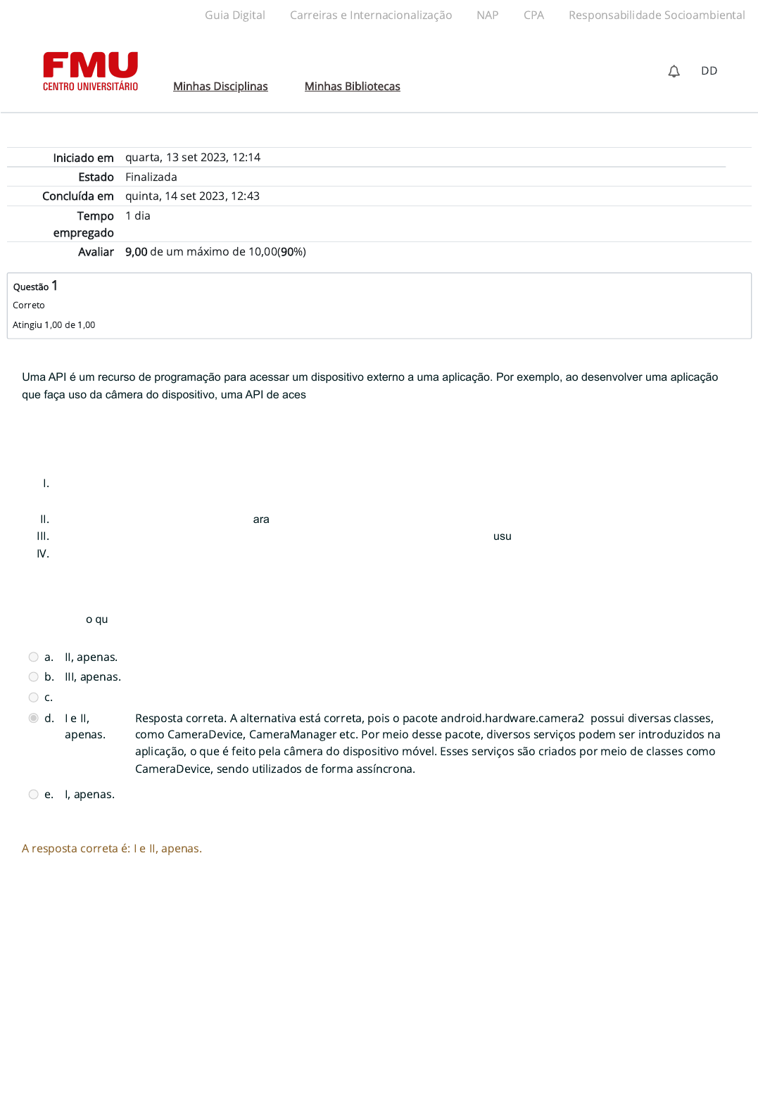 27/09/23, 10:18 Atividade 4 (A4): Revisão da tentativa https://ambienteacademico.com.br/mod/quiz/review.php?attempt=2844956&cmid=1068842 1/8 Iniciado em quarta, 13 set 2023, 12:14 Estado Finalizada Concluída em quinta, 14 set 2023, 12:43 Tempo empregado 1 dia Avaliar 9,00 de um máximo de 10,00(90%) Questão 1 Correto Atingiu 1,00 de 1,00 Uma API é um recurso de programação para acessar um dispositivo externo a uma aplicação. Por exemplo, ao desenvolver uma aplicação que faça uso da câmera do dispositivo, uma API de acesso a esse recurso será usada na programação da aplicação móvel pelo desenvolvedor. A partir do trecho exposto, analise as afirmativas a seguir. I. O pacote android.hardware.camera2 dá suporte por meio de uma interface para dispositivos de câmeras individuais conectadas a um dispositivo Android. II. CameraDevice é um objeto de retorno para receber atualizações sobre o estado de um dispositivo de câmera. III. A classe MediaRecorder é usada para apresentar uma prévia da câmera ao vivo para o usuário. IV. MediaRecorder permite o controle de gravação baseado em uma máquina de estado complexo. Está correto o que se afirma em: a. II, apenas. b. III, apenas. c. II e III, apenas. d. I e II, apenas. Resposta correta. A alternativa está correta, pois o pacote android.hardware.camera2 possui diversas classes, como CameraDevice, CameraManager etc. Por meio desse pacote, diversos serviços podem ser introduzidos na aplicação, o que é feito pela câmera do dispositivo móvel. Esses serviços são criados por meio de classes como CameraDevice, sendo utilizados de forma assíncrona. e. I, apenas. A resposta correta é: I e II, apenas. Guia Digital Carreiras e Internacionalização NAP CPA Responsabilidade Socioambiental Minhas Disciplinas Minhas Bibliotecas DD https://codely-fmu-content.s3.amazonaws.com/Moodle/GuiaDigital/Guia+digital/index.html https://carreiras.fmu.br/ https://codely-fmu-content.s3.amazonaws.com/Moodle/NAP/inicial/nap/fmu/index.html https://codely-fmu-content.s3.amazonaws.com/Moodle/CPA/landing_CPA/index.html https://portal.fmu.br/sustentabilidade https://ambienteacademico.com.br/ https://ambienteacademico.com.br/ https://ambienteacademico.com.br/course/view.php?id=236 27/09/23, 10:18 Atividade 4 (A4): Revisão da tentativa https://ambienteacademico.com.br/mod/quiz/review.php?attempt=2844956&cmid=1068842 2/8 Questão 2 Correto Atingiu 1,00 de 1,00 Um dos avanços da computação móvel foi a aplicação de serviços de geolocalização. Esse ganho resultou em aplicações de uso cotidiano de usuários, principalmente em grandes centros urbanos. Aplicações que têm a finalidade de determinar rotas são os serviços que mais fazem uso desses sistemas. A respeito do LocationManager, analise as afirmativas a seguir e assinale V para a(s) Verdadeira(s) e F para a(s) Falsa(s). I. ( ) Com o uso do objeto LocationManager, pode-se consultar a lista de todas as instâncias do LocationProvider para determinar o último local do usuário conhecido. II. ( ) Com o uso do objeto LocationManager, pode-se registrar ou cancelar o registro de atualizações periódicas da localização atual do usuário de um provedor de localização. III. ( ) Com o uso do objeto LocationManager, pode-se registrar ou cancelar o registro, a fim de que um dado seja acionado se o dispositivo estiver dentro de uma determinada proximidade. IV. ( ) Com o uso do objeto LocationManager, pode-se registrar o usuário feito por meio do login do Google+, que permite que os usuários façam login em serviços de terceiros com a conta do Google+. Assinale a alternativa que apresenta a sequência correta: a. F, V, F, F. b. F, F, V, V. c. F, V, V, V. d. V, F, F, V. e. V, V, V, F. Resposta correta. A alternativa está correta, pois LocationProvider é uma superclasse abstrata para provedores de localização. Um provedor de localização fornece relatórios periódicos sobre a localização geográ�ca do dispositivo. O LocationManager consulta a lista de instância do objeto para determinar o último usuário conhecido. Esses serviços permitem que os aplicativos obtenham atualizações periódicas da localização geográ�ca do dispositivo, podendo fazer operações de registro ou cancelamento. A resposta correta é: V, V, V, F. Guia Digital Carreiras e Internacionalização NAP CPA Responsabilidade Socioambiental Minhas Disciplinas Minhas Bibliotecas DD https://codely-fmu-content.s3.amazonaws.com/Moodle/GuiaDigital/Guia+digital/index.html https://carreiras.fmu.br/ https://codely-fmu-content.s3.amazonaws.com/Moodle/NAP/inicial/nap/fmu/index.html https://codely-fmu-content.s3.amazonaws.com/Moodle/CPA/landing_CPA/index.html https://portal.fmu.br/sustentabilidade https://ambienteacademico.com.br/ https://ambienteacademico.com.br/ https://ambienteacademico.com.br/course/view.php?id=236 27/09/23, 10:18 Atividade 4 (A4): Revisão da tentativa https://ambienteacademico.com.br/mod/quiz/review.php?attempt=2844956&cmid=1068842 3/8 Questão 3 Correto Atingiu 1,00 de 1,00 Questão 4 Incorreto Atingiu 0,00 de 1,00 A empresa Google dispõe de um serviço para aplicações Android no qual o usuário pode manter todas as atualizações das aplicações, garantindo sempre a última versão de aplicações instaladas no dispositivo móvel. Esse serviço é conhecido como Google Play Services. Sobre aplicações móveis, analise as afirmativas a seguir e assinale (V) para a(s) verdadeira(s) e (F) para a(s) falsa(s). I. ( ) Por meio do Google Play Services, um pacote de recursos (API) é oferecido aos desenvolvedores de apps Android. II. ( ) Os pacotes disponibilizados pelo Google Play Services, instalados no dispositivo, podem ser executados em Android 2.1 ou superior. III. ( ) Dentre os serviços do Google Play Services, incluem-se a autenticação dos serviços Google e o acesso às últimas configurações de privacidade do usuário. IV. ( ) O Google Play Services melhora a experiência de utili