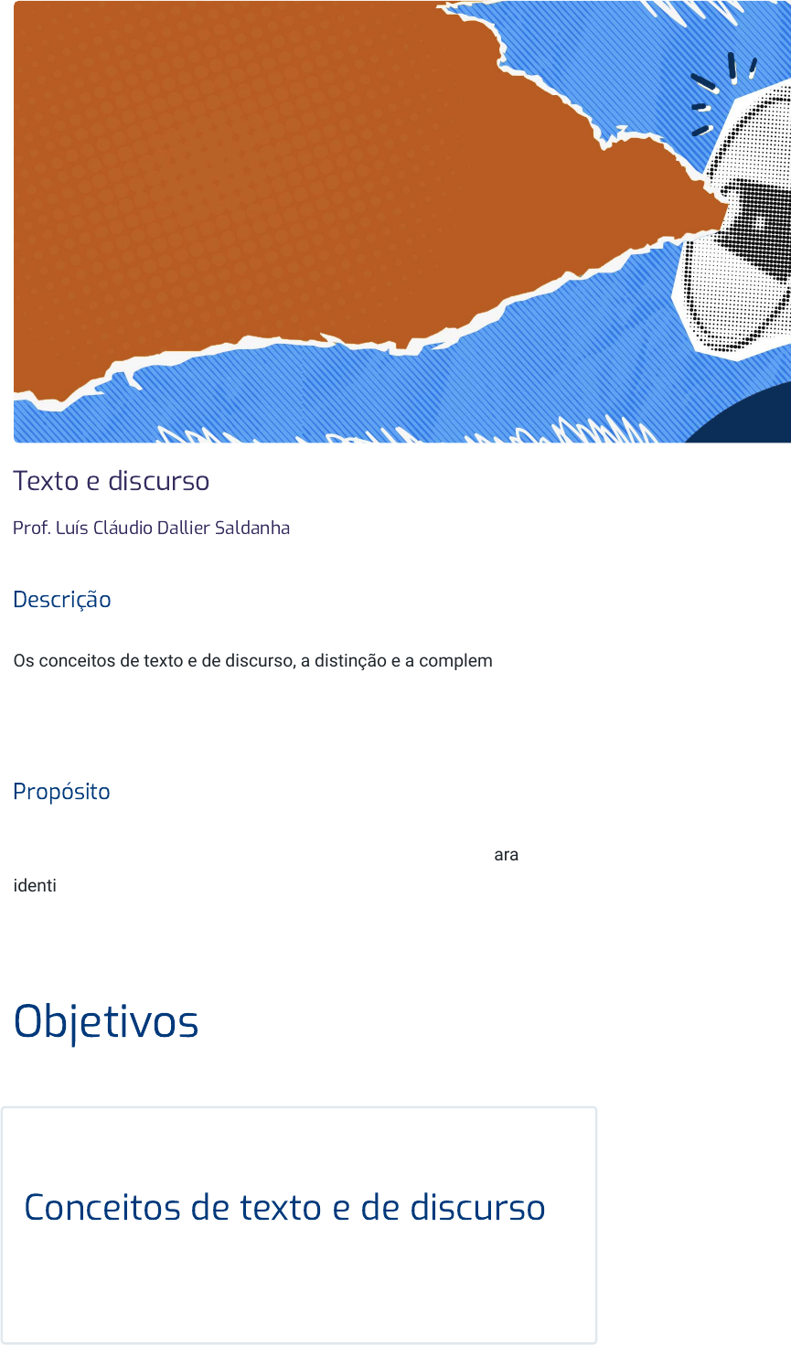 28/09/2023, 14:34 Texto e discurso https://stecine.azureedge.net/repositorio/00212hu/00234/index.html#imprimir 1/38 Texto e discurso Prof. Luís Cláudio Dallier Saldanha Descrição Os conceitos de texto e de discurso, a distinção e a complementaridade entre eles, bem como uma caracterização dos gêneros textuais e alguns cuidados necessários na produção e leitura de textos. Propósito Compreender o conceito de texto, discurso e gênero textual para identificar estratégias e cuidados necessários à elaboração e à leitura de um texto. Objetivos Módulo 1 Conceitos de texto e de discurso Distinguir os conceitos de texto e de discurso. 28/09/2023, 14:34 Texto e discurso https://stecine.azureedge.net/repositorio/00212hu/00234/index.html#imprimir 2/38 Módulo 2 A elaboração do texto Identificar aspectos da distinção entre texto e discurso na produção textual. Módulo 3 Gêneros textuais Reconhecer o conceito de gêneros textuais e suas implicações na leitura de textos. A escrita e a leitura são duas práticas fundamentais na vida acadêmica e profissional. Vivemos num mundo letrado, em ambientes físicos ou virtuais que são povoados por textos. Cada texto desempenha uma determinada função, atende a um objetivo, está relacionado com certa prática social ou situação de comunicação e interação. Escrevemos textos para serem lidos e lemos textos que foram escritos com determinadas intenções. Tudo isso nos conduz à relação entre texto, discurso e gêneros textuais. Por isso, vamos estudar esses conceitos e conhecer algumas recomendações para ler e escrever melhor. Vamos aos estudos! Introdução 28/09/2023, 14:34 Texto e discurso https://stecine.azureedge.net/repositorio/00212hu/00234/index.html#imprimir 3/38 1 - Conceitos de texto e de discurso Ao �nal deste módulo, você será capaz de distinguir os conceitos de texto e de discurso. Introdução Todas as vezes em que você se comunica ou interage com alguém, há sempre uma intenção ao falar ou ao escrever. Dependendo dessa intenção ou da finalidade do ato de comunicação, haverá maneiras diferentes de construir sua fala e sua escrita, ou seja, você acabará usando modos específicos para se expressar ou interagir por meio da língua. As formas características do uso da língua se manifestam em determinadas estruturas, isto é, dito de outra forma, aparecem em modos peculiares de organizar o discurso ou o ato de comunicação. Independentemente da finalidade, sua escrita ou sua 28/09/2023, 14:34 Texto e discurso https://stecine.azureedge.net/repositorio/00212hu/00234/index.html#imprimir 4/38 fala se organizam a partir de estruturas definidas, que muitas vezes até passam despercebidas. Vejamos a seguinte situação: Imagine que Rodrigo chegou em casa ansioso por contar algo que aconteceu no trabalho, uma situação ocorrida que lhe deu muita esperança de ser promovido. Falamos e escrevemos com as mais diferentes intenções, adequando nosso ato de comunicação a partir delas, por isso devemos concluir que há diversas formas de organizar o discurso. Isso também implica dizer que existem diversos gêneros textuais, além daquelas moda lidades que você deve ter aprendido na escola, como narração, descrição e dissertação. No diálogo acima, qual modalidade você acha que Rodrigo utilizou para contar o fato ocorrido? Digite sua resposta aqui Chave de resposta Narração Ao contar o episódio, tentando mostrar as chances de ter uma promoção, ele utilizou aspectos característicos da narração, que é um tipo específico de se organizar o discurso, assim como nós fazemos comumente no dia a dia. 28/09/2023, 14:34 Texto e discurso https://stecine.azureedge.net/repositorio/00212hu/00234/index.html#imprimir 5/38 Enquanto ele contava sua história, provavelmente nem se deu conta de elementos típicos da narração, como: personagem, espaço, tempo etc. Para compreender tudo isso e identificar possíveis aplicações no uso da língua, você aprenderá os conceitos de discurso e de texto para, então, verificar como o conhecimento dos diferentes gêneros textuais o ajudará a escrever e a ler melhor. Conceitos de texto e de discurso Para distinguir texto e discurso, primeiramente é preciso conceituá-los, além de identificar a utilidade dessa distinção. Mas, em vez de começar logo com uma definição, vamos pensar um pouco sobre a prática, ou seja, vamos considerar uma situação concreta de uso da língua. Imagine que alguém diga a um colega o seguinte: A resposta "sei" provavelmente frustrou quem perguntou. A decepção ou mesmo o estranhamento diante de tal resposta ocorre porque a intenção de quem pergunta não é obter uma informação sobre o conhecimento ou não do horário, mas pedir um dado que traga sentido, referência e clareza. A intenção de quem pergunta é um elemento fundamental na enunciação, assim como a forma como o texto é recebido pelo enunciatário. Enunciação O termo enunciação refere-se à atividade social e interacional em que a língua é colocada em funcionamento por um enunciador (aquele que fala 28/09/2023, 14:34 Texto e discurso https://stecine.azureedge.net/repositorio/00212hu/00234/index.html#imprimir 6/38 ou escreve), tendo em vista um enunciatário (aquele para quem se fala ou se escreve). O produto da enunciação é chamado enunciado. No campo dos estudos da linguagem, o conceito de enunciação, assim como tantos outros, apresenta variações na forma como é definido, conforme a abordagem teórica em que seja tomado. A enunciação está presente na maioria dos textos. No caso da nossa hipotética situação de comunicação, pode-se imaginar a presença explícita dessa enunciação do seguinte modo: É possível que um texto não explicite as intenções do autor, ou seja, a enunciação pode estar implícita. Nesse caso, será preciso ouvir ou ler o texto, entendê-lo e perceber as intenções do autor. Teremos, então, uma decodificaç
