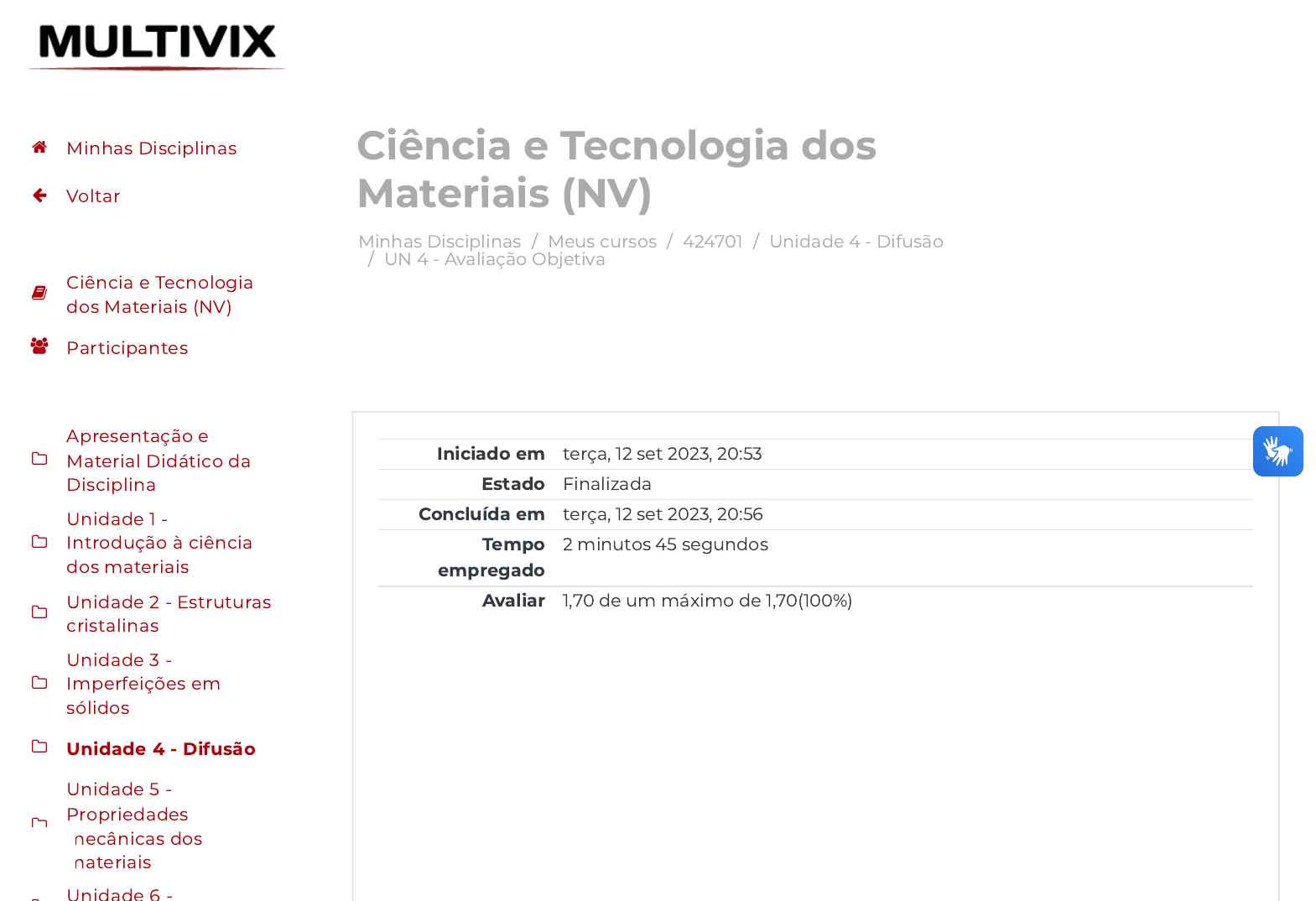 Minhas Disciplinas / Meus cursos / 424701 / Unidade 4 - Difusão / UN 4 - Avaliação Objetiva Ciência e Tecnologia dos Materiais (NV) Iniciado em terça, 12 set 2023, 20:53 Estado Finalizada Concluída em terça, 12 set 2023, 20:56 Tempo empregado 2 minutos 45 segundos Avaliar 1,70 de um máximo de 1,70(100%) Minhas Disciplinas Voltar Ciência e Tecnologia dos Materiais (NV) Participantes Apresentação e Material Didático da Disciplina Unidade 1 - Introdução à ciência dos materiais Unidade 2 - Estruturas cristalinas Unidade 3 - Imperfeições em sólidos Unidade 4 - Difusão Unidade 5 - Propriedades mecânicas dos materiais Unidade 6 - https://avap.multivix.edu.br/my/ https://avap.multivix.edu.br/course/view.php?id=24136 https://avap.multivix.edu.br/course/view.php?id=24136§ion=5 https://avap.multivix.edu.br/mod/quiz/view.php?id=1540495 https://avap.multivix.edu.br/my/ https://avap.multivix.edu.br/course/view.php?id=24136 https://avap.multivix.edu.br/user/index.php?id=24136 https://avap.multivix.edu.br/course/view.php?id=24136§ion=1 https://avap.multivix.edu.br/course/view.php?id=24136§ion=2 https://avap.multivix.edu.br/course/view.php?id=24136§ion=3 https://avap.multivix.edu.br/course/view.php?id=24136§ion=4 https://avap.multivix.edu.br/course/view.php?id=24136§ion=5 https://avap.multivix.edu.br/course/view.php?id=24136§ion=6 https://avap.multivix.edu.br/course/view.php?id=24136§ion=7 https://avap.multivix.edu.br/ https://avap.multivix.edu.br/ https://avap.multivix.edu.br/ https://avap.multivix.edu.br/ https://avap.multivix.edu.br/ https://avap.multivix.edu.br/ https://avap.multivix.edu.br/ https://avap.multivix.edu.br/ Questão 1 Correto Atingiu 0,34 de 0,34 A difusão está associada ao transporte de massa que ocorre em um sistema quando nele existe uma diferença de concentração, ou seja, há um gradiente de concentração. Por isso, a produção de componentes ou estruturas de engenharia tem origem no processo de difusão. Quando a difusão ocorre em sólidos, esta acontece pela movimentação dos átomos, e, durante esse processo, pode-se veri�car a possibilidade de fatores in�uenciarem no mecanismo de difusão. Em relação aos fatores que in�uenciam na difusão, é correto a�rmar que: Escolha uma opção: a. As energias de ativação são elevadas no caso de átomos que se difundem por meio de estruturas cristalinas menos compactas, quando comparadas às estruturas cristalinas mais compactas. b. A magnitude do coe�ciente de difusão é um indicativo da taxa de movimentação dos átomos, sendo ele um parâmetro totalmente independente de outros parâmetros. c. Na difusão em volume, a energia de ativação é elevada, e a taxa de difusão é relativamente alta. d. O movimento atômico nos sólidos durante a difusão ocorre por meio da energia de ativação. Quando o sistema possui alto valor de energia de ativação, o coe�ciente de difusão assume valores bem baixos. Minhas Disciplinas Voltar Ciência e Tecnologia dos Materiais (NV) Participantes Apresentação e Material Didático da Disciplina Unidade 1 - Introdução à ciência dos materiais Unidade 2 - Estruturas cristalinas Unidade 3 - Imperfeições em sólidos Unidade 4 - Difusão Unidade 5 - Propriedades mecânicas dos materiais Unidade 6 - https://avap.multivix.edu.br/my/ https://avap.multivix.edu.br/course/view.php?id=24136 https://avap.multivix.edu.br/user/index.php?id=24136 https://avap.multivix.edu.br/course/view.php?id=24136§ion=1 https://avap.multivix.edu.br/course/view.php?id=24136§ion=2 https://avap.multivix.edu.br/course/view.php?id=24136§ion=3 https://avap.multivix.edu.br/course/view.php?id=24136§ion=4 https://avap.multivix.edu.br/course/view.php?id=24136§ion=5 https://avap.multivix.edu.br/course/view.php?id=24136§ion=6 https://avap.multivix.edu.br/course/view.php?id=24136§ion=7 https://avap.multivix.edu.br/ https://avap.multivix.edu.br/ https://avap.multivix.edu.br/ https://avap.multivix.edu.br/ https://avap.multivix.edu.br/ https://avap.multivix.edu.br/ https://avap.multivix.edu.br/ https://avap.multivix.edu.br/ Questão 2 Correto Atingiu 0,34 de 0,34 e. Quando a temperatura de um material aumenta, o coe�ciente de difusão D aumenta exponencialmente e, portanto, o �uxo de átomos se torna igualmente mais elevado. A magnitude do coe�ciente de difusão D é um indicativo da taxa na qual os átomos se difundem. A espécie em difusão, assim como o material hospedeiro, in�uencia o coe�ciente de difusão. Sendo assim, o valor de D para a difusão do cobre no zinco a 450 °C, dado que D = 2,4x10 e Q = 189.000, é igual a: Escolha uma opção: a. 2,61 x 10 m /s b. 2,23 x 10 m /s c. 6,17 x 10 m /s d. 5,23 x 10 m /s e. 1,10 x 10 m /s 0 -5 d -19 2 -9 2 -19 2 -19 2 -9 2 Minhas Disciplinas Voltar Ciência e Tecnologia dos Materiais (NV) Participantes Apresentação e Material Didático da Disciplina Unidade 1 - Introdução à ciência dos materiais Unidade 2 - Estruturas cristalinas Unidade 3 - Imperfeições em sólidos Unidade 4 - Difusão Unidade 5 - Propriedades mecânicas dos materiais Unidade 6 - https://avap.multivix.edu.br/my/ https://avap.multivix.edu.br/course/view.php?id=24136 https://avap.multivix.edu.br/user/index.php?id=24136 https://avap.multivix.edu.br/course/view.php?id=24136§ion=1 https://avap.multivix.edu.br/course/view.php?id=24136§ion=2 https://avap.multivix.edu.br/course/view.php?id=24136§ion=3 https://avap.multivix.edu.br/course/view.php?id=24136§ion=4 https://avap.multivix.edu.br/course/view.php?id=24136§ion=5 https://avap.multivix.edu.br/course/view.php?id=24136§ion=6 https://avap.multivix.edu.br/course/view.php?id=24136§ion=7 https://avap.multivix.edu.br/ https://avap.multivix.edu.br/ https://avap.multivix.edu.br/ https://avap.multivix.edu.br/ https://avap.multivix.edu.br/ https://avap.multivix.edu.br/ https://avap.multivix.edu.br/ https://avap.multivix.edu.br/ Questão 3 Correto Atingiu 0,34 de 0,34 A difusão é um processo de transferê