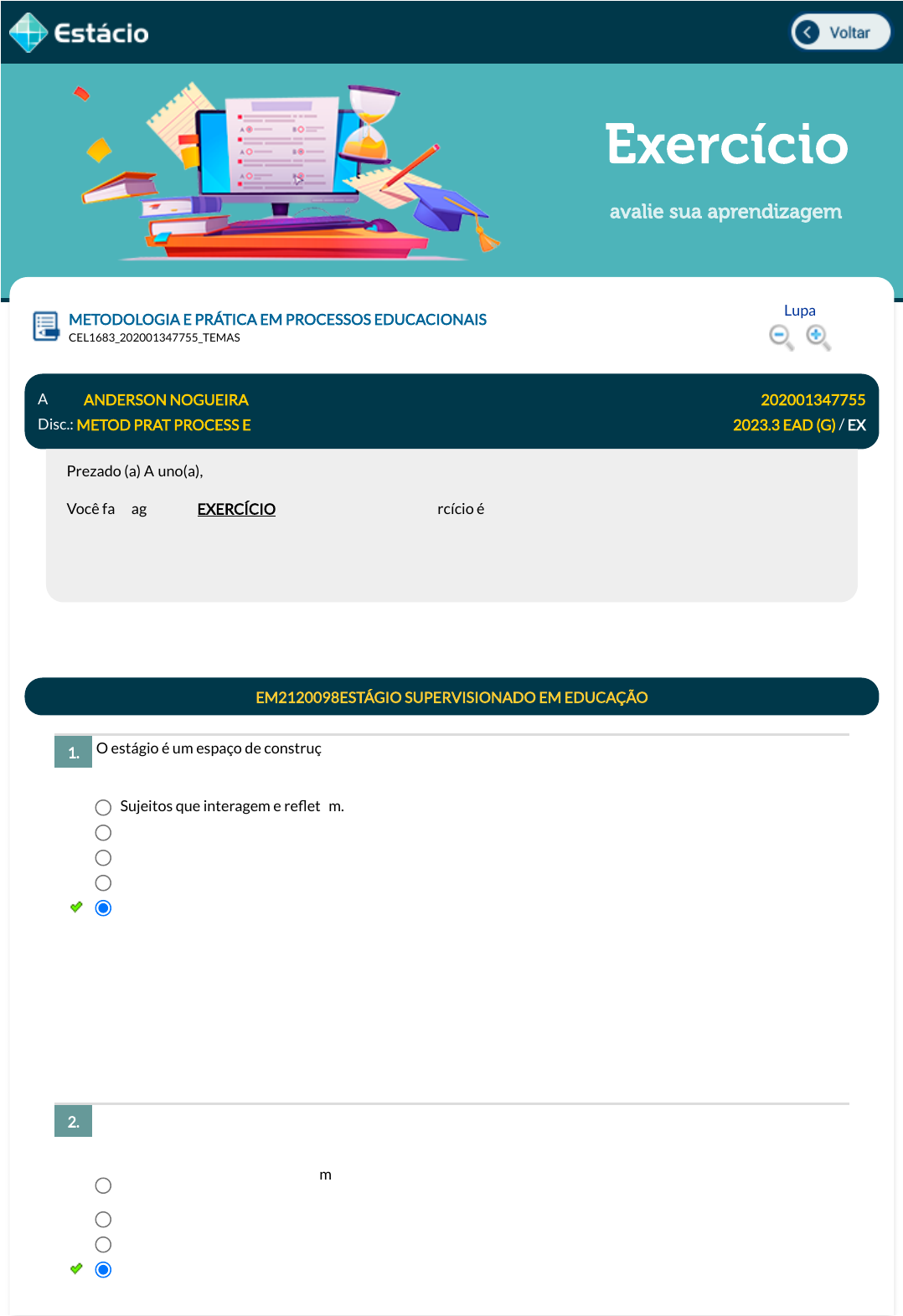 28/09/23, 17:57 Estácio: Alunos https://simulado.estacio.br/alunos/ 1/5 Exercício avalie sua aprendizagem O estágio é um espaço de construção de conhecimento e transformações. Nesse sentido, o olhar do estagiário deve estar voltado para observar o que segue, exceto: A emoção é predominante como possibilidade de expressão na infância, por isso, é fundamental que o estagiário se insira nesse cenário, despertando para essa importância. Baseado nas premissas do estágio podemos a�rmar: METODOLOGIA E PRÁTICA EM PROCESSOS EDUCACIONAIS Lupa CEL1683_202001347755_TEMAS Aluno: ANDERSON NOGUEIRA Matr.: 202001347755 Disc.: METOD PRAT PROCESS E 2023.3 EAD (G) / EX Prezado (a) Aluno(a), Você fará agora seu EXERCÍCIO! Lembre-se que este exercício é opcional, mas não valerá ponto para sua avaliação. O mesmo será composto de questões de múltipla escolha. Após responde cada questão, você terá acesso ao gabarito comentado e/ou à explicação da mesma. Aproveite para se familiarizar com este modelo de questões que será usado na sua AV e AVS. EM2120098ESTÁGIO SUPERVISIONADO EM EDUCAÇÃO 1. Sujeitos que interagem e re�etem. Situações vivenciadas. Registros que instrumentalizam. Histórias e competências construídas. A vocação do(a) docente titular. Data Resp.: 28/09/2023 17:48:25 Explicação: A resposta correta é: A vocação do(a) docente titular. 2. A Educação Infantil não lida com conhecimento, pois as crianças são apenas emoções e não podem internalizar saberes. O professor deve inibir o choro e o riso das crianças para que elas aprendam a utilizar a fala. O compromisso do professor é apenas com processos de higiene e segurança das crianças. O vínculo afetivo entre o professor e a criança é de extrema importância para sua aprendizagem. javascript:voltar(); javascript:voltar(); javascript:voltar(); javascript:voltar(); javascript:diminui(); javascript:diminui(); javascript:aumenta(); javascript:aumenta(); 28/09/23, 17:57 Estácio: Alunos https://simulado.estacio.br/alunos/ 2/5 O estágio curricular requer instrumentos metodológicos que permitam pensar, ampliar e construir conhecimento. Nesse sentido, são possibilidades qualitativas, exceto: (2017/CESPE/Prefeitura de São Luís-MA/Professor) Ainda com relação ao disposto na LDB, revista em 2017, assinale a opção correta: (SAEB Professor - Área: Linguagens com Ênfase em Língua Portuguesa 2017) A Lei Federal no 13.415, de fevereiro de 2017, introduz alterações na Lei no 9.394/1996 - LDBEN, tais como a que estabelece que a Base Nacional Comum Curricular de�nirá direitos e objetivos de aprendizagem do ensino médio, em conformidade com diretrizes do Conselho Nacional de Educação, nas seguintes áreas do conhecimento: As crianças não têm nenhuma racionalidade, agem apenas por impulso, por isso, o professor deve ser permissivo. Data Resp.: 28/09/2023 17:49:00 Explicação: A resposta correta é: O vínculo afetivo entre o professor e a criança é de extrema importância para sua aprendizagem. 3. Produzir situações problemas vinculadas à realidade das crianças. Buscar apoio interdisciplinar. Buscar unidade e/ou confronto na relação teoria e prática. Desenvolver projetos de pesquisas. Ter posturas monometodológicas. Data Resp.: 28/09/2023 17:49:32 Explicação: A resposta correta é: Ter posturas monometodológicas. EM2120358REFORMA DO ENSINO MÉDIO E O ENSINO PROFISSIONAL 4. De acordo com a LDB, o ensino técnico equivale ao ensino médio. A LDB impossibilitou a integração entre o ensino pro�ssional e o ensino técnico. A LDB institui o segundo grau pro�ssionalizante. A LDB estabelece que o ensino médio deve preparar o estudante para o mundo de trabalho. A LDB compreende o ensino técnico como um nível de ensino. Data Resp.: 28/09/2023 17:50:31 Explicação: A resposta certa é: A LDB estabelece que o ensino médio deve preparar o estudante para o mundo de trabalho. 5. Parte comum do currículo e parte diversi�cada, respeitada a diversidade regional e local Ciências humanas e sociais; ciências exatas e da terra; ciências biológicas e da saúde Ciências humanas, �loso�a e sociologia; artes e línguas modernas (inglês e espanhol) Ciências exatas e da terra; ciências biológicas e da saúde; literatura, línguas modernas e educação artística 28/09/23, 17:57 Estácio: Alunos https://simulado.estacio.br/alunos/ 3/5 A ideia de ''notório saber'' no magistério é uma novidade controversa em meio às críticas à Reforma do Ensino Médio. Isso se dá por conta: Listagem de abreviaturas e de ilustrações são itens do relatório de estágio supervisionado referentes a qual parte? Um dos itens mais importantes do relatório se concentra nos objetivos. Por quê? Linguagens e suas tecnologias; matemática e suas tecnologias; ciências da natureza e suas tecnologias; e ciências humanas e sociais aplicadas Data Resp.: 28/09/2023 17:52:43 Explicação: A resposta certa é: Linguagens e suas tecnologias; matemática e suas tecnologias; ciências da natureza e suas tecnologias; e ciências humanas e sociais aplicadas 6. Da fragilização da formação docente, entendendo que a escola pode ter quadros não regulamentados de ''notório saber'' Da falta de vinculação com a Base Comum Curricular Da forma como permite a ampla substituição de professores formados Da forma como ele reforça as diferenças sociais Da fragilidade dos conteúdos que permanecem enciclopédicos Data Resp.: 28/09/2023 17:53:40 Explicação: A resposta certa é: Da fragilização da formação docente, entendendo que a escola pode ter quadros não regulamentados de ''notório saber'' RELATÓRIO DE ESTÁGIO 7. Complementações dos objetivos. Páginas não obrigatórias. Complementações da planilha de acompanhamento. Apêndices obrigatórios. Anexos optativos como parte integrante do texto. Data Resp.: 28/09/2023 17:54:26 Explicação: A resposta correta é: Páginas não obrigatóri