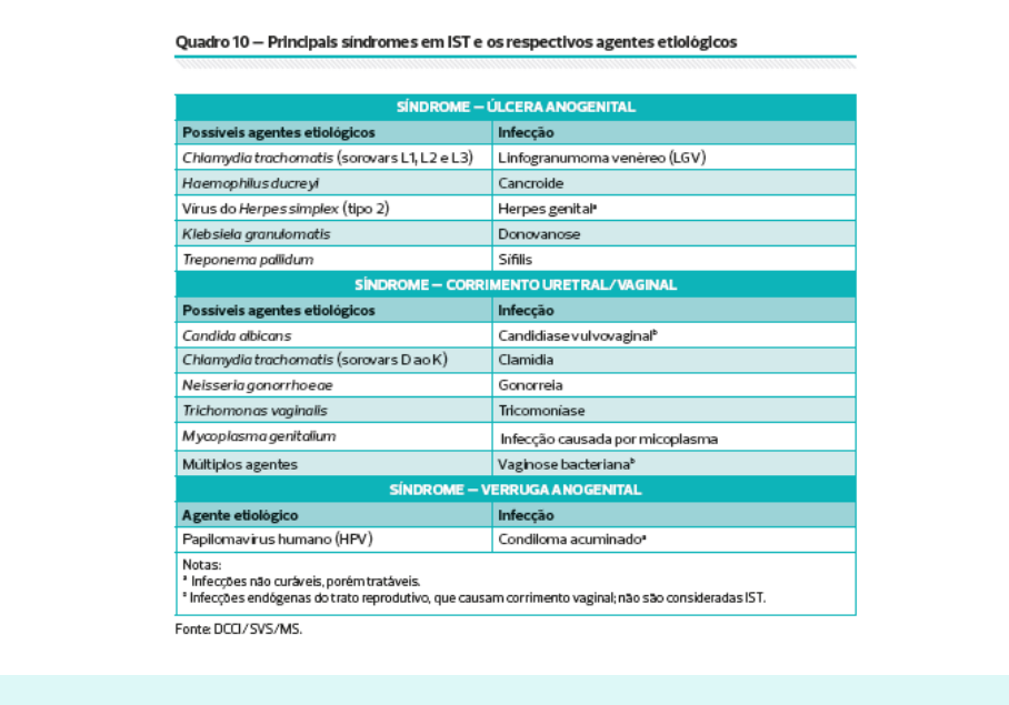 Diagnóstico sindrômico em IST SÍFILIS · Infecção bacteriana sistêmica, crônica, curável e exclusiva do ser humano. · Trata-se doença conhecida há séculos, seu agente etiológico descoberto 1905, é o Treponema pallidum. · Sua transmissão é principalmente por contato sexual, contudo, pode ser transmitida verticalmente. · A maioria das pessoas com sífilis são assintomáticas, quando apresentam sinais e sintomas, muitas vezes não percebem ou não valorizam e acabam transmitindo para seus parceiros sexuais. · Quando a sífilis não é tratada, pode evoluir para complicações gravíssimas acometendo o sistema nervoso e cardiovascular. · Na gestação a sífilis pode gerar consequências severas, como abortamento prematuro, natimortalidade, manifestações congênitas precoces ou tardias e morte. · No Brasil a sífilis é uma doença reemergente. Transmissão da sífilis · A transmissão da doença é maior nas fases iniciais (sífilis primária ou secundária), diminuindo gradualmente com o passar do tempo (sífilis latente ou tardia). · Vale a pena ressaltar que no primeiro ano de latência, 25% dos pacientes apresentam recrudescimento para fase secundária. · Essa maior transmissibilidade está associada a riqueza de treponemas nas lesões da sífilis primária (cancro duro) e secundária (lesões muco-cutâneas). As espiroquetas podem penetrar diretamente na mucosa ou entram em abrasões na pele. · Em gestantes a chance de transmissão é de 80% intraútero. Ainda pode ocorrer no parto vaginal se a mãe apresentar lesão sifílica. Infecção fetal depende muito da fase que a mãe está da doença. O acometimento intrauterino provoca 30% a 50% de morte intrauterina, parto pré-termo ou morte neonatal. Classificação clínica da sífilis Ela é dividida em estágios que servem para orientar o tratamento e monitor o paciente: · Sífilis recente (primária, secundária e latente recente), até um ano evolução. · Sífilis tardia (latente tardia e terciária): mais de um ano de evolução. Sífilis primária: O tempo de incubação é de 90 dias, em média três semanas. A primeira manifestação é uma úlcera rica em treponemas, geralmente é indolor, com borda bem definida e regular, base endurecida e fundo limpo, que ocorre local entrada da bactéria (pênis, vulva, colo uterino, ânus, boca ou outros locais pele) denominada cancro duro. A lesão primária é acompanhada linfadenopatia regional (acometendo linfonodos localizados próximos ao cancro). · A duração pode variar muito, de três a oito semanas, independe de tratamento. Pode ou não ser notada ou não ser valorizada pelo paciente, pode ser única ou múltipla. Sífilis secundária: Aparece em média de 6 semanas a seis meses após a cicatrização do cancro, ainda que manifestação iniciais, recorrentes ou subentrantes, podem ocorrer até 1 ano após cancro. Há casos excepcionais que lesões secundárias ocorrem junto com a primária. Manifestações: suas manifestações são muito variáveis, mas tende a seguir uma cronologia própria. · Alopecia em clareiras e madarose são achado eventuais. · De micropoliadenopatia, sendo característico identificação dos gânglios epitrocleares. · Febre baixa, mal-estar, cefaleia e adinamia. · Os sintomas desaparecem em algumas semanas, independente de tratamento, trazendo a falsa impressão de cura. Atualmente, têm-se tornado mais frequentes os quadros oculares, especialmente uveites. · A neurossífilis meningovascular, com acometimento de pares cranianos, quadros menígeos e isquêmicos, pode também acompanhar essa fase, contraria a ideia que sífilis só na fase tardia. (pensar em HIV) · Toda erupção cutânea em causa determinada deve ser investigado com testes de sífilis. Sífilis Latente: · Período em que não se observa nenhum sinal ou sintoma. Diagnóstico é exclusivamente por testes treponêmicos ou não treponêmicos. A maioria dos casos ocorrem nessa fase. · Duas fases: sífilis latente recente (até um ano infecção) e latente tardia (mais de um ano da infecção). · 25% não tratados intercalam com lesões secundarismo. Sífilis Terciária · Ocorre 15% a 25% das infecções não tratadas, após um período variável de latência, podendo surgir entre 1 e 40 anos do inicio da infecção. · Leva a destruição tecidual. É comum acometimento do sistema nervoso e do sistema cardiovascular. · Pode ocorrer gomas sifílicas (tumorações com tendência a liquefação) na pele, mucosas, ossos ou qualquer tecido. · Pode causar desfiguração, incapacidade ou até morte. Manifestações clínicas de sífilis adquirida Métodos diagnósticos da sífilis EXAMES DIRETOS DE SÍFILIS · Os exames diretos realizam a pesquisa ou detecção do treponema pallidum amostras coletadas diretamente das lesões. TESTES IMUNOLÓGICOS DE SÍFILIS · Pesquisa de anticorpos em amostras de sangue total, soro ou plasma. Divididos em Treponêmicos e não Treponêmicos. SÃO OS MAIS USADOS. TESTES TREPONÊMICOS: detectam anticorpos específicos produzidos contra os antígenos do Treponema pallidum. São os primeiros a se tornarem reagentes, podendo ser utilizados como primeiro teste ou teste complementar. 85% dos casos permanecem reagentes por toda vida, mesmo após o tratamento, por isso, não são indicados para monitoramento da resposta ao tratamento. Existem vários tipos de testes treponêmicos: · Testes rápidos: metodologia imunocromatigrafia de fluxo lateral ou duplo percurso. São práticos, de fácil execução, leitura 30 minutos. · Colhidos amostras de sangue digital ou venoso. Vantagem pode ser feito momento da consulta, diagnóstico e tratamento imediato. · Testes de hemaglutinação (TPHA, do inglês T. Pallidum Haemagglutination Test) e de aglutinação de partículas (TPPA, do inglês T. Pallidum Particle Agglutination Assay), ensaios micro-hemaglutinação (MHA – TP, do inglês Micro-Haemagglutination Assy). · Testes imunofluore