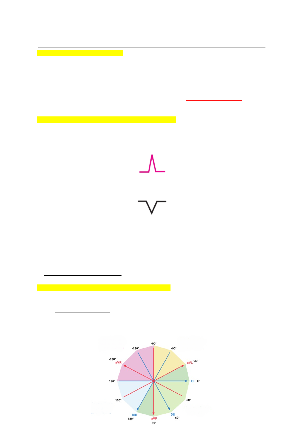 1 (ECG) Eletrocardiograma normal → Posição do Coração no Tórax O ventrículo direito ocupa a maior parte da área cardíaca quando visto de frente (RX PA); já o ventrículo esquerdo, câmara que detém a maior quantidade muscular, pode ser visto no RX lateral: é possível observá-lo atrás do ventrículo direito. Pelo ventrículo esquerdo ser a porção cardíaca com maior quantidade de massa muscular, o vetor médio da despolarização (também referida como resultante das forças) se dirige para a esquerda, para baixo e para trás (o ventrículo esquerdo fica atrás do VD). → Teoria do Dipolo (despolarização e repolarização) ● Despolarização Toda vez que a despolarização segue do polo negativo de uma derivação para o polo positivo, cria-se no traçado eletrocardiográfico uma onda de deflexão positiva, como observado abaixo. Quando esse impulso elétrico se propaga, afastando-se do eletrodo positivo e indo em direção ao eletrodo negativo, será gerada uma onda de deflexão negativa. Em outras palavras, na despolarização: se foi em direção ao eletrodo positivo, onda positiva. Se foi em direção ao eletrodo negativo, onda negativa. ● Repolarização Toda vez que a onda se propaga em direção ao eletrodo positivo, cria-se uma onda negativa. Quando a onda segue em direção ao eletrodo negativo, cria-se uma onda positiva. GRAVAR DESPOLARIZAÇÃO. PENSAR NA REPOLARIZAÇÃO COMO O OPOSTO. → Determinantes da amplitude das ondas no ECG 1. Quanto maior a célula miocárdica (quanto mais hipertrofiada a massa muscular), maior o vetor e maior a amplitude das ondas. 2. Orientação espacial: Ao pensar em orientação espacial, deve-se ter em mente o plano frontal do coração. Esse plano é representado por 6 derivações, chamado sistema hexaxial (o centro do círculo abaixo é o nódulo AV). 2 Quanto mais o vetor for paralelo com a derivação de escolha (olho observacional), maior será a sua amplitude no traçado eletrocardiográfico. Quanto mais o impulso elétrico (vetor) coincide (fica paralelo) com a direção do ponto de observação (derivação) escolhido (p. Ex.: DI ou aVF), mais ampla é a deflexão dessa onda no registro eletrocardiográfico. Se esse mesmo vetor fosse oblíquo em relação a derivação em questão, a onda registrada também seria positiva, mas com menor amplitude. Por convenção, a inscrição negativa no traçado significa que o vetor (impulso) está se distanciando do ponto de observação (que é a extremidade positiva da derivação). Da mesma forma, a inscrição positiva no traçado do ECG significa que o vetor (impulso) está se aproximando do ponto de observação (derivação, p. Ex.: D1). Na repolarização isso se inverte. → As ondas do ECG ● A onda P representa a despolarização atrial ○ Inicia-se a partir do nó sinoatrial (marcapasso fisiológico) ● Em seguida, o segmento PR, uma pequena linha reta após a onda P ○ Trata-se de uma pausa fisiológica que ocorre no nó atrioventricular ○ O impulso elétrico está parado, por isso se chama isoelétrico ○ A pausa se dá para que ocorra o enchimento ventricular ○ O intervalo PR compreende a onda P e esse pequeno segmento ■ Todo intervalo é a junção de um segmento e uma onda ● O complexo QRS representa a despolarização ventricular ○ Note que a repolarização atrial se encontra “escondida” nesse complexo ● A onda T representa a repolarização ventricular Observações: 1. Se uma despolarização traçar os eletrodos perpendicularmente, será isoelétrica (ou isodifásica), onde a resultante das forças é próxima de zero, ou seja, a positividade é igual a negatividade. 2. A ponta da seta indica onde está a positividade da derivação, ou seja, onde está o eletrodo positivo. 3 → Despolarização atrial: onda P O sentido que os átrios despolarizam segue sempre o trajeto fisiológico das ondas elétricas: do nó sinoatrial em direção ao átrio direito e esquerdo, assim como em direção do nó atrioventricular. → Despolarização ventricular: complexo QRS O complexo QRS nem sempre se dá da forma tradicional. A primeira onda negativa do QRS é chamada de Q, a primeira onda positiva de R e a segunda onda negativa (ou a primeira negativa depois de uma positiva) é chamada de S. Não necessariamente estarão presentes todas as ondas. A grafia minúscula e maiúscula devem ser dadas de acordo com a amplitude das ondas (utilizar as próprias ondas do QRS como referência). Independentemente de seu padrão, esses complexos indicam a despolarização ventricular. Lembre-se: essas variações acontecem em detrimento das diferentes derivações. A despolarização ventricular se inicia na parede septal (impulso que descende do nó A-V), afastando-se da resultante das forças (portanto forma uma onda inicialmente negativa, representada pelo Q) afinal o ramo esquerdo é responsável pela despolarização de ⅔ do septo interventricular, o que cria um vetor que se distancia da resultante das forças (que é o polo mais positivo). Logo em seguida, o vetor vai em direção da parede livre do ventrículo esquerdo, que coincide com a resultante das forças, formando uma onda positiva R. Por último, o vetor segue em direção à parede posterolateral do ventrículo esquerdo (base do coração), distanciando-se novamente da força resultante (que é para baixo, esquerda e para trás), formando uma onda negativa S. 4 Atente-se na direção das setinhas de cada etapa e na localização do eletrodo explorador (quando a resultante é contrária a localização do eletrodo explorador, cria-se uma onda negativa e quando a resultante vai a favor do eletrodo explorador, cria-se uma onda positiva): → Posição dos eletrodos bipolares BD- ↔ BE+ = derivação D1 (0º) BD- ↔ PE+ = derivação D2 (60º) BE- ↔ PE+ = derivação D3 (120º) → Posição dos eletrodos unipolares BD+ → avR (-150º) BE+ → avL (-30º) PE+ → avF (90º) A soma dos ele
