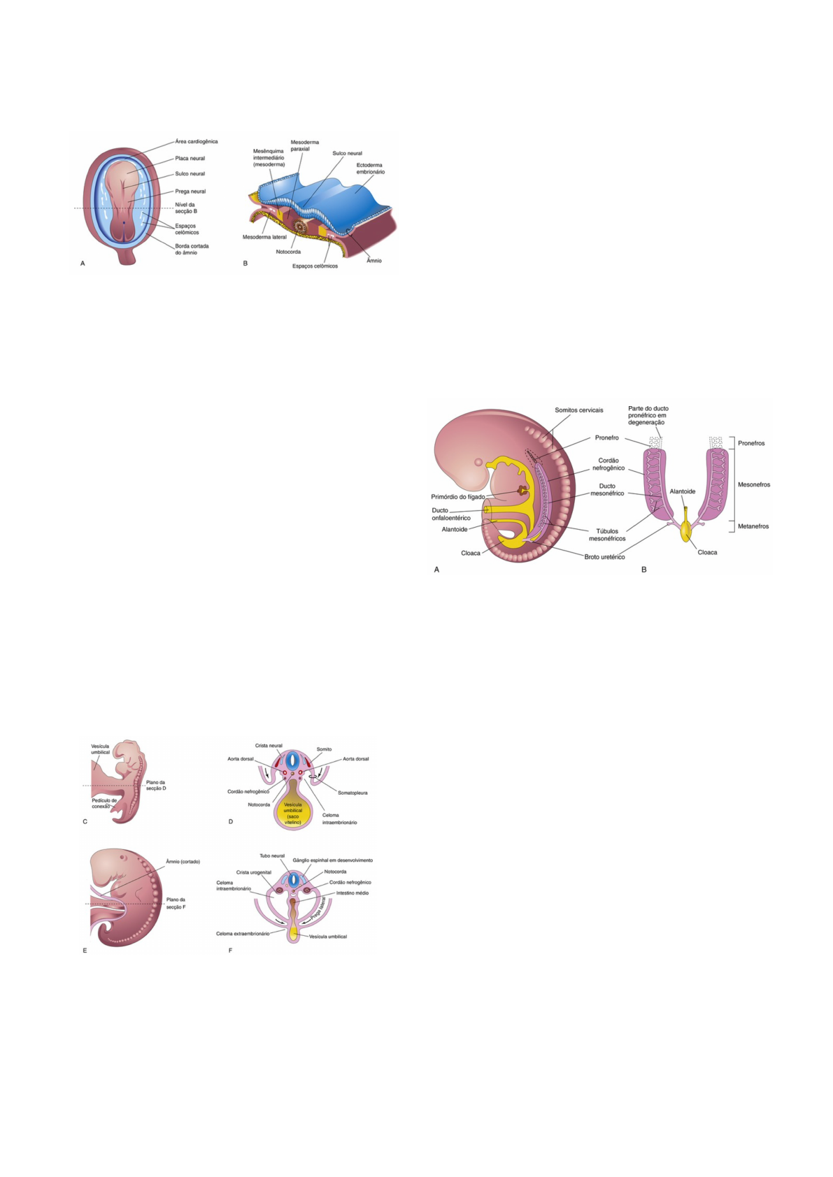 Sistema Urogenital É necessário voltar à terceira e quarta semana embrionária quando tem o desenvolvimento da notocorda no mesoderma. A notocorda emite sinais para o desenvolvimento e diferenciação dos tecidos a sua volta. Na figura tem-se notocorda, mesoderma paraxial e mais lateralmente o mesoderma lateral que inclusive é dividido em dois mesodermas pelos espaços celômicos que ali se formam. Entre o mesoderma lateral e o paraxial tem-se em destaque em amarelo o mesoderma intermediário, é a partir dele que o sistema urogenital será construído. Com o dobramento do embrião, vai deslocar ventralmente o mesoderma para fo rmar as reg iões específicas que darão origem ao sistema urogenital. Inicialmente tem-se a crista urogenital que se forma ao lado de cada aorta dorsal, portanto essa região estará bem dorsal ao embrião e a partir da crista urogenital é possível perceber a formação de um cordão celular nefrogênico que vai dar origem ao sistema urinário propriamente e uma crista gonadal que dará origem ao sistema genial. Por isso, estuda-se junto o sistema urogenital. Na figura C, tem-se o corte transversal de um embrião no estágio inicial de dobramento entre 3ª e 4ª semana. Em D observa-se o estrangulamento do saco vitelino na região ventral, na região dorsal tem-se o tubo neural, crista neural e um par de aorta dorso. Logo abaixo do par de aorta tem-se um par de cordões nefrogênicos e também a crista gonadal. Então, essa pequena região que se espalhará por todo o dorso do embrião será a região de origem de 3 sistemas de rins. Nas outras imagens, no mesmo plano de corte, terá a estrutura mais desenvolvida, observando-se o celular intraembrionário que foi provocado pelo dobramento do embrião e a crista urogenital e o cordão nefrogênico que também pode ser chamado de crista gonadal. Essa região está se espalhando por todo o dorso do embrião então vai construir um sistema renal que começa bem próximo à região futuro pescoço do embrião e ela vai se espalhar por todo o dorso do embrião e ao final terá-se um rim definitivo formado. Portanto, terá 3 conjuntos de órgãos excretores que se desenvolvem ao longo do dorso do embrião, sendo eles o pronefro, pesonefro e metanefro que torna-se os rins permanentes. O pronefro está desenhado já apagando, pois é uma região inicial que não tem capacidade de fazer filtração de sangue, mas que dá início à formação do sistema progenitor. Esse pronefro logo se desintegra, dura muito pouco e é localizado na região do futuro pescoço do embrião. Em seguida tem-se a continuidade do pronefro que é o mesonefro, onde tem o cordão nefrogênico que são as células que vão pse multiplicando e se especializando. Esse cordão acaba montando estruturas como o ducto mesonéfrico e túbulos mesonéfricos. Esse tipo de rim é capaz de iniciar um processo de filtração glomerular, mas nada como o rim definitivo que é o metanefro. No metanefro é possível perceber um divertículo metanefro ou broto uretérico que consiste em um brotamento bem pequeno, mas em uma localidade próxima do que seria à cloaca e a futura bexiga. Assim, na quarta semana de desenvolvimento embrionário terá a formação de uma estrutura bilateral transitória e não funcional chamada ade pronefro e grupos de células e estruturas tubulares (ductos) se desenvolvem na região do pescoço. Esses ductos pronéfricos crescem caudalmente até a cloaca e persistem e passa a compor o mesonefro. Final da 4ª semana o mesonefro grandes e a longados, caudalmente ao pronefro espalhando por todo dorso do embrião. São considerados rins provisórios até o final da 8ª semana, isso acontece, porque ele já tem capacidade de realizar uma filtração glomerular rudimentar. Já tem-se glomérulos e túbulos mesonéfricos. O filtrado passa para túbulos mesonéfricos, depois ductos mesonéfricos e é armazenado cloaca. O mesonefro degenera no final do primeiro trimestre mas os túbulos tornam-se os ductos eferentes dos testículos, daí sua importância para a formação do sistema gonadal masculino. Extensão do mesonefro Tem-se uma crista gonadal e nela o coração celular nefrogênico está consistindo de um ducto mesonéfrico que vem do pronefron, esse ducto mesonéfrico está constituído por todo o dorso do embrião. Ao lado do ducto vê- se a formação de uma vesícula mesonéfrica, a qual se alonga e começa a se unir com o ducto mesonéfrico fazendo uma estrutura alongada com capacidade de abraçar, a cápsula de Bowman, um glomérulo que é um emaranhado de capilares. Já sendo possível ver uma estrutura muito parecida com o néfron. No néfron tem-se o glomérulo, cápsula de Bowman, túbulos contornados proximal e distal, alça de Henie. Em F, ainda não tem a alça de Henie formada, mas tem-se o túbulo mesonéfrico que vai até o ducto mesonéfrico então faz-se uma filtração glomerular, captado na capsula de Bowman e esse filtrado passará pelo túbulo mesonéfr ico até o ducto mesonéfrico o qual está descendo pelo dorso do embrião até a cloaca, formando uma urina rudimentar. Metanefro A m e d i d a q u e o m e s o n e f r o v a i s e desenvolvendo pelo dorso do embrião observa-se a a partir da 5ª semana o primórdio dos rins permanentes se formando. A urina ira se formar a partir da 9ª semana embrionária. Então, a partir da 5ª semana uma evaginação do ducto mesonéfrico para formar o divertículo metanéfrico ou broto uretérico sendo um brotamento que se dá no ducto mesonéfrico bem mais próximo da cloaca, ou seja, em uma região bem mais caudal do embrião. Neste broto uretér ico ou d iver t ícu lo metanéfrico, vai observar também que o cordão nefrogênico vai dar origem a uma massa metanéfrica, todo ele de origem do mesoderma intermediário. Essa massa metanéfrica vai se formar como córtex renal. Além disso, a extremidade cranial se ramifica em túbulos coletores do metanefro. Nas figuras, 