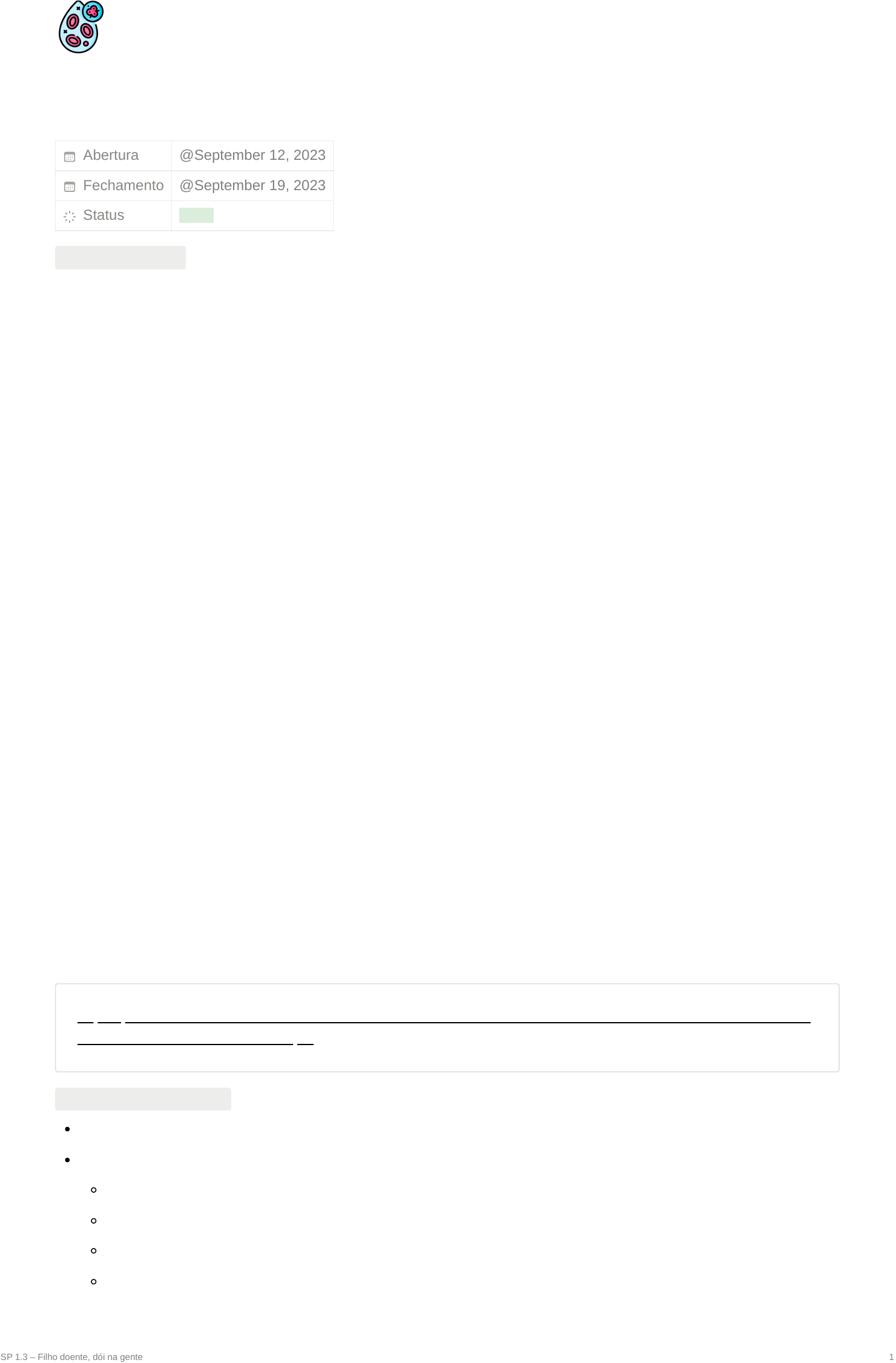 SP 1.3 – Filho doente, dói na gente 1 SP 1.3 – Filho doente, dói na gente Abertura Fechamento Status Done TEXTO DO CASO Ruth estava preocupada. Seu segundo filho, Yuri, agora com 6 anos, saudável até os 5 anos, passou a se queixar de cansaço frequente sem razão aparente. Queixava de dores nos joelhos e nas pernas. Sua médica da UBS diagnosticou inicialmente como “dores do crescimento”. Mas pediu para mãe verificar a temperatura por uma semana, três vezes ao dia para ver se não havia febre e retornasse em 15 dias. Ruth comprou um termômetro e já no primeiro dia percebeu que a criança apresentava febre de até 38 ºC, principalmente no final da tarde. Começou também a apresentar dores persistentes na barriga, na região do hipocôndrio esquerdo. Yuri foi tratado nos últimos três meses de duas infecções respiratórias, sendo uma “sinusite” e a outra um “princípio de pneumonia”. Só que a mãe achou estranho o fato de as "ínguas" do pescoço ainda não terem desaparecido, ao contrário do que a médica da UBS havia dito que iria acontecer. Além disso, o surgimento, há poucos dias, de manchas arroxeadas nas pernas fez com que Ruth levasse Yuri à UBS para um novo atendimento antes do retorno de 15 dias. Na UBS, a médica, Walda, após anamnese e exames físicos cuidadosos, solicitou um hemograma de urgência, que evidenciou: Hb: 6,4 g/dL, Leucócitos em número de mais de 100.000/mm³ e plaquetopenia acentuada. Frente a esses resultados iniciais, a médica conversou longamente com a mãe a respeito da importância de investigar melhor o caso do menino, já que poderia se tratar de uma neoplasia maligna. Ruth, entre lágrimas falou: — Esse diagnóstico dói tanto quanto um diagnóstico de morte... Dra. Walda, segurando o braço de Ruth, disse: — Calma Ruth, na atualidade, muitos desses casos têm tido resultados favoráveis, com os tratamentos especializados disponíveis. A médica quis saber se na família de Yuri existiam outros casos semelhantes e a mãe do garoto se lembrou de um tio já idoso que havia falecido há alguns anos de “câncer no sangue”. Yuri foi encaminhado para um hospital especializado em câncer infantil, onde, dentre inúmeros exames, foi realizado um mielograma e uma biópsia de medula óssea. O material obtido na medula revelou proliferação de células blásticas, sendo compatível com o diagnóstico de leucemia aguda. Atualmente, Yuri se encontra em tratamento em uma Unidade de Assistência de Alta Complexidade em oncologia (UNACON). Por morar longe, é atendido por uma ONG que providencia seu transporte para o tratamento mensal. Os familiares já foram alertados para a possibilidade de ser necessário um transplante de medula óssea, após a maior estabilização de seu estado. https://prod-files-secure.s3.us-west-2.amazonaws.com/6bb54529-dfc5-4e30-a388-73db74afecc2/3dcb4e4a-e009- 475e-be09-aa3fdd27279e/tutoria.pdf PONTOS IMPORTANTES Ruth, mãe Segundo filho, Yuri, 6 anos Saudável até os 5 anos Sintomas apareceram há um ano (cansaço frequente sem motivo aparente) Médica da UBS diagnosticou como “dores do crescimento” Febre de até 38ºC @September 12, 2023 @September 19, 2023 https://www.notion.so/signed/https%3A%2F%2Fprod-files-secure.s3.us-west-2.amazonaws.com%2F6bb54529-dfc5-4e30-a388-73db74afecc2%2F3dcb4e4a-e009-475e-be09-aa3fdd27279e%2Ftutoria.pdf?table=block&id=4d8b5d1e-a3ea-4fae-85c2-6644969cc892&spaceId=6bb54529-dfc5-4e30-a388-73db74afecc2&userId=d3da97ce-e2b2-4773-a023-9c3903fceb6d&cache=v2 https://www.notion.so/signed/https%3A%2F%2Fprod-files-secure.s3.us-west-2.amazonaws.com%2F6bb54529-dfc5-4e30-a388-73db74afecc2%2F3dcb4e4a-e009-475e-be09-aa3fdd27279e%2Ftutoria.pdf?table=block&id=4d8b5d1e-a3ea-4fae-85c2-6644969cc892&spaceId=6bb54529-dfc5-4e30-a388-73db74afecc2&userId=d3da97ce-e2b2-4773-a023-9c3903fceb6d&cache=v2 SP 1.3 – Filho doente, dói na gente 2 Dores persistentes na barriga, na região do hipocôndrio esquerdo Infecção respiratória e princípio de pneumonia nos últimos três meses "Ínguas" do pescoço ainda não terem desaparecido Manchas arroxeadas nas pernas Hb: 6,4 g/dL (baixa, anemia - cansaço), Leucócitos em número de mais de 100.000/mm³ e plaquetopenia acentuada Muitos desses casos têm tido resultados favoráveis, com os tratamentos especializados disponíveis Tio idoso falecido com “câncer no sangue” Encaminhado para o hospital de câncer infantil → mielograma e biópsia de medula óssea Proliferação de células blásticas, sendo compatível com o diagnóstico de leucemia aguda Se encontra em tratamento em uma Unidade de Assistência de Alta Complexidade em oncologia (UNACON) Os familiares já foram alertados para a possibilidade de ser necessário um transplante de medula óssea, após a maior estabilização de seu estado. 💡 Hematologia Básica. HIPÓTESES 1. A leucemia consiste em uma proliferação de células blásticas na medula. Pode ser classificada em aguda, crônica, linfoide e mieloide. 2. Toda leucemia causa anemia, plaquetopenia e leucocitose. 3. O hemograma serve de diagnóstico inicial de leucemia e o mielograma e a biópsia como diagnóstico confirmatório. 4. Um dos tratamentos possíveis para a leucemia é a transfusão da medula, porém precisa ser compatível. 5. Existem sítios metastáticos da leucemia, como nos ossos. PERGUNTAS 1. O que é a leucemia? Caracterize e explique seus tipos. 2. Quais as principais alterações moleculares de cada leucemia? 3. Caracterize as principais manifestações clínicas de cada tipo de leucemia. 4. Como é realizado o diagnóstico (clínico e laboratorial) de cada tipo de leucemia? 5. Quais são os fatores de risco paras as leucemias? 6. Qual a faixa etária associada a cada tipo de leucemia? 7. Qual o prognóstico e qual o tratamento de cada tipo de leucemia? 8. Caracterize os principais sítios metastáticos da leucemia e justifique. RESPOSTAS 💡 Como é feita a diferenciação e a maturação da linha