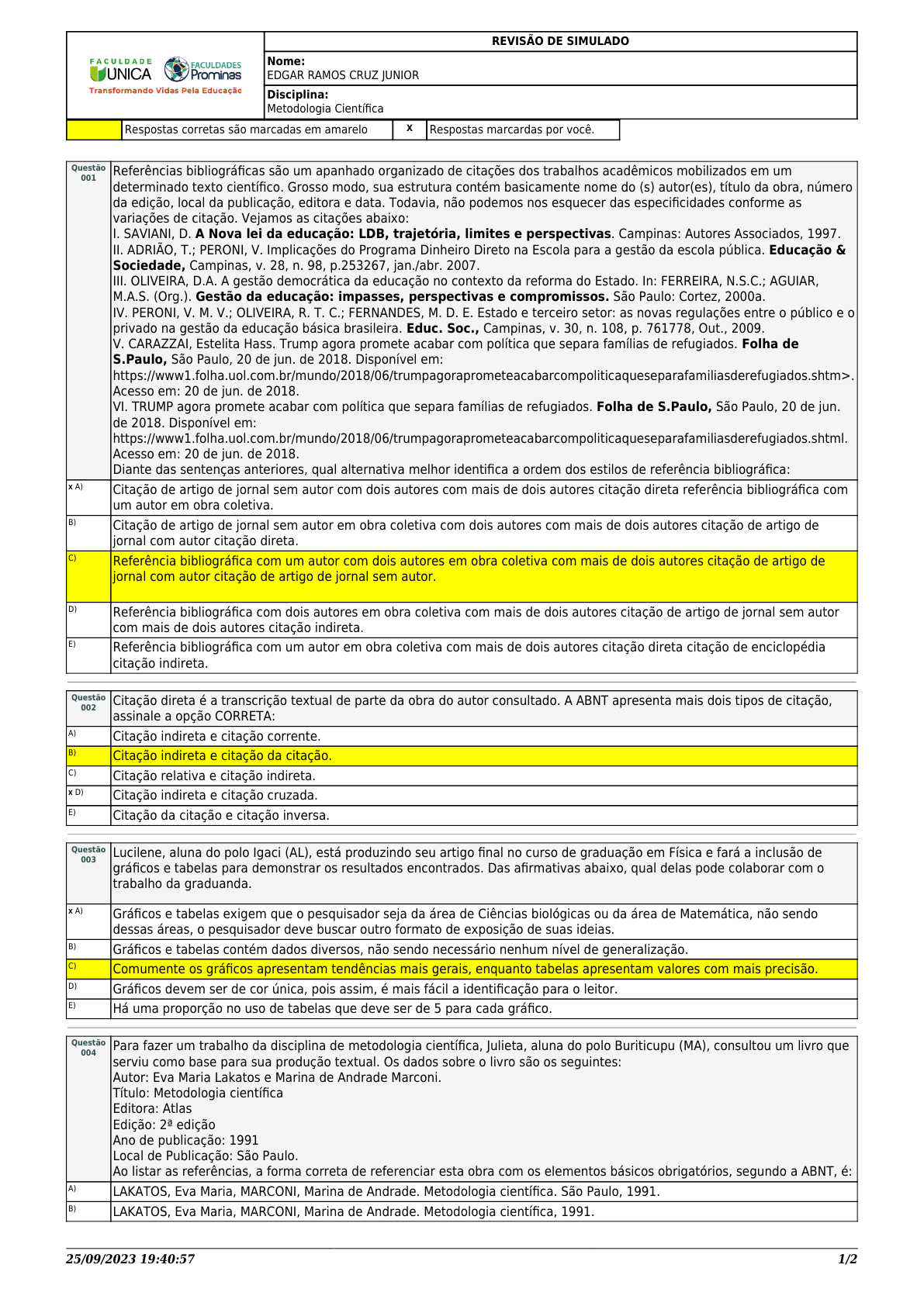 25/09/2023 19:40:57 1/2 REVISÃO DE SIMULADO Nome: EDGAR RAMOS CRUZ JUNIOR Disciplina: Metodologia Científica Respostas corretas são marcadas em amarelo X Respostas marcardas por você. Questão 001 Referências bibliográficas são um apanhado organizado de citações dos trabalhos acadêmicos mobilizados em um determinado texto científico. Grosso modo, sua estrutura contém basicamente nome do (s) autor(es), título da obra, número da edição, local da publicação, editora e data. Todavia, não podemos nos esquecer das especificidades conforme as variações de citação. Vejamos as citações abaixo: I. SAVIANI, D. A Nova lei da educação: LDB, trajetória, limites e perspectivas. Campinas: Autores Associados, 1997. II. ADRIÃO, T.; PERONI, V. Implicações do Programa Dinheiro Direto na Escola para a gestão da escola pública. Educação & Sociedade, Campinas, v. 28, n. 98, p.253267, jan./abr. 2007. III. OLIVEIRA, D.A. A gestão democrática da educação no contexto da reforma do Estado. In: FERREIRA, N.S.C.; AGUIAR, M.A.S. (Org.). Gestão da educação: impasses, perspectivas e compromissos. São Paulo: Cortez, 2000a. IV. PERONI, V. M. V.; OLIVEIRA, R. T. C.; FERNANDES, M. D. E. Estado e terceiro setor: as novas regulações entre o público e o privado na gestão da educação básica brasileira. Educ. Soc., Campinas, v. 30, n. 108, p. 761778, Out., 2009. V. CARAZZAI, Estelita Hass. Trump agora promete acabar com política que separa famílias de refugiados. Folha de S.Paulo, São Paulo, 20 de jun. de 2018. Disponível em: https://www1.folha.uol.com.br/mundo/2018/06/trumpagoraprometeacabarcompoliticaqueseparafamiliasderefugiados.shtm>. Acesso em: 20 de jun. de 2018. VI. TRUMP agora promete acabar com política que separa famílias de refugiados. Folha de S.Paulo, São Paulo, 20 de jun. de 2018. Disponível em: https://www1.folha.uol.com.br/mundo/2018/06/trumpagoraprometeacabarcompoliticaqueseparafamiliasderefugiados.shtml. Acesso em: 20 de jun. de 2018. Diante das sentenças anteriores, qual alternativa melhor identifica a ordem dos estilos de referência bibliográfica: X A) Citação de artigo de jornal sem autor com dois autores com mais de dois autores citação direta referência bibliográfica com um autor em obra coletiva. B) Citação de artigo de jornal sem autor em obra coletiva com dois autores com mais de dois autores citação de artigo de jornal com autor citação direta. C) Referência bibliográfica com um autor com dois autores em obra coletiva com mais de dois autores citação de artigo de jornal com autor citação de artigo de jornal sem autor. D) Referência bibliográfica com dois autores em obra coletiva com mais de dois autores citação de artigo de jornal sem autor com mais de dois autores citação indireta. E) Referência bibliográfica com um autor em obra coletiva com mais de dois autores citação direta citação de enciclopédia citação indireta. Questão 002 Citação direta é a transcrição textual de parte da obra do autor consultado. A ABNT apresenta mais dois tipos de citação, assinale a opção CORRETA: A) Citação indireta e citação corrente. B) Citação indireta e citação da citação. C) Citação relativa e citação indireta. X D) Citação indireta e citação cruzada. E) Citação da citação e citação inversa. Questão 003 Lucilene, aluna do polo Igaci (AL), está produzindo seu artigo final no curso de graduação em Física e fará a inclusão de gráficos e tabelas para demonstrar os resultados encontrados. Das afirmativas abaixo, qual delas pode colaborar com o trabalho da graduanda. X A) Gráficos e tabelas exigem que o pesquisador seja da área de Ciências biológicas ou da área de Matemática, não sendo dessas áreas, o pesquisador deve buscar outro formato de exposição de suas ideias. B) Gráficos e tabelas contém dados diversos, não sendo necessário nenhum nível de generalização. C) Comumente os gráficos apresentam tendências mais gerais, enquanto tabelas apresentam valores com mais precisão. D) Gráficos devem ser de cor única, pois assim, é mais fácil a identificação para o leitor. E) Há uma proporção no uso de tabelas que deve ser de 5 para cada gráfico. Questão 004 Para fazer um trabalho da disciplina de metodologia científica, Julieta, aluna do polo Buriticupu (MA), consultou um livro que serviu como base para sua produção textual. Os dados sobre o livro são os seguintes: Autor: Eva Maria Lakatos e Marina de Andrade Marconi. Título: Metodologia científica Editora: Atlas Edição: 2ª edição Ano de publicação: 1991 Local de Publicação: São Paulo. Ao listar as referências, a forma correta de referenciar esta obra com os elementos básicos obrigatórios, segundo a ABNT, é: A) LAKATOS, Eva Maria, MARCONI, Marina de Andrade. Metodologia científica. São Paulo, 1991. B) LAKATOS, Eva Maria, MARCONI, Marina de Andrade. Metodologia científica, 1991. 25/09/2023 19:40:57 2/2 C) LAKATOS; MARCONI, São Paulo, 1991. X D) Eva Maria Lakatos e Marina de Andrade Marconi. Metodologia científica. 2. ed. São Paulo: Atlas, 1991. E) LAKATOS, Eva Maria, MARCONI, Marina de Andrade. Metodologia científica. 2. ed. São Paulo: Atlas, 1991. Questão 005 Lucimar é aluna do polo Taguatinga (DF) e está concluindo um artigo acadêmico. Para encerrar, ela fez a seguinte formatação do texto: Começou pela configuração de folha A4, na cor branca, colocou margens direita e inferior: 2cm e na esquerda e superior: 3cm, o espaçamento entre linhas e entre parágrafos de 1,5 entre linhas. Além disso, utilizou a fonte Times New Roman, tamanho 12 e na cor preta. Nas citações com mais de 3 linhas, quando utilizou tabelas a fonte utilizada foi de tamanho 10. Diante do exposto, acerca das normas da ABNT, qual a alternativa correta: A) A formatação está correta, porém, deveria estar contida uma recomendação para a exposição oral da apresentação. B) A formatação está correta, to