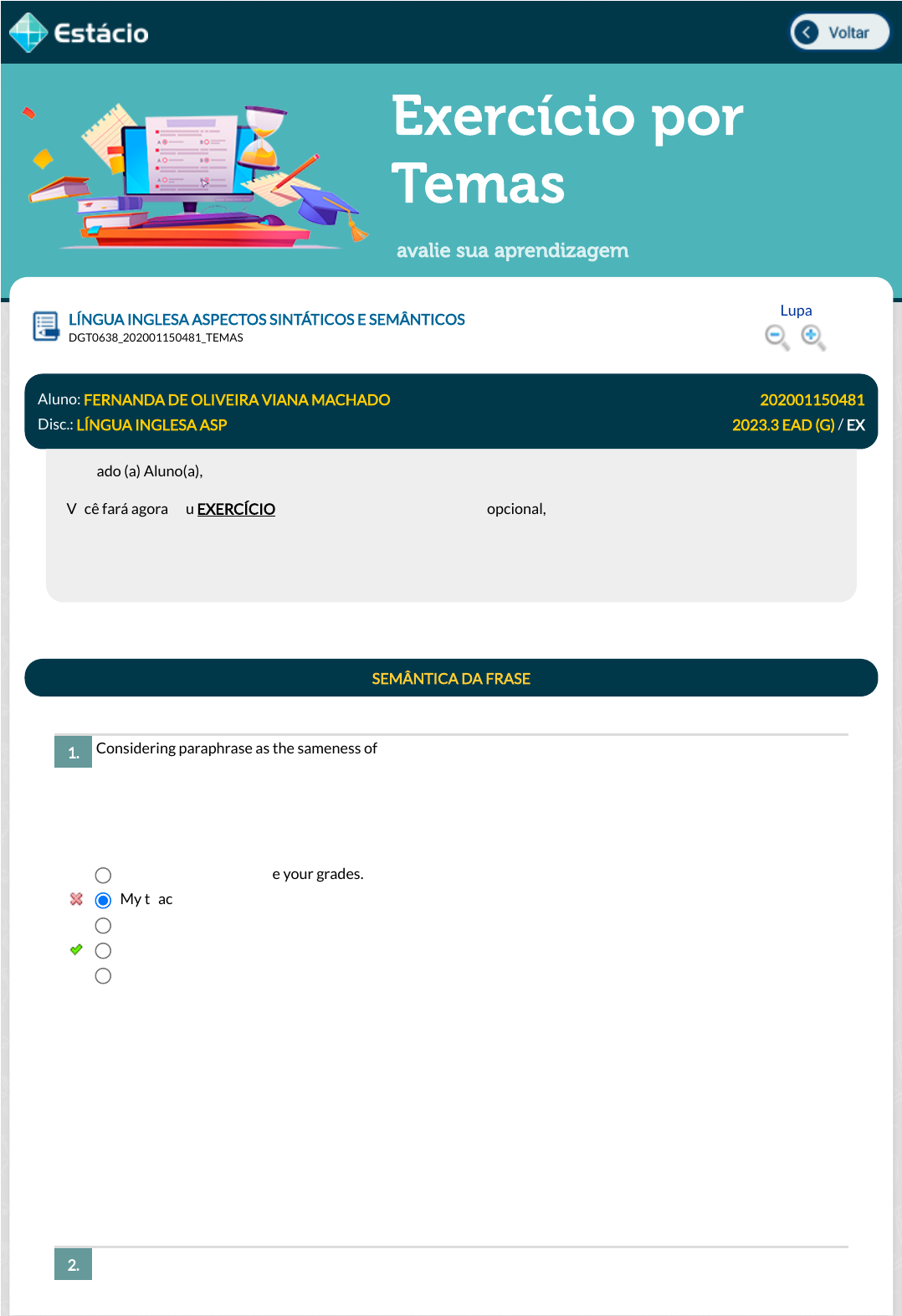 30/09/2023, 20:56 Estácio: Alunos https://simulado.estacio.br/alunos/ 1/5 Exercício por Temas avalie sua aprendizagem Considering paraphrase as the sameness of meaning between two linguistically diverse utterances, read the sentence below: The teacher: you should study more, otherwise your grades will continue low. Which of the options below presents a proper paraphrase of the highlighted sentence? Paraphrases play a variety of roles in discourse, being used in many situations to perform speci�c interactional functions. Bearing it in mind, read the passage below: LÍNGUA INGLESA ASPECTOS SINTÁTICOS E SEMÂNTICOS Lupa DGT0638_202001150481_TEMAS Aluno: FERNANDA DE OLIVEIRA VIANA MACHADO Matr.: 202001150481 Disc.: LÍNGUA INGLESA ASP 2023.3 EAD (G) / EX Prezado (a) Aluno(a), Você fará agora seu EXERCÍCIO! Lembre-se que este exercício é opcional, mas não valerá ponto para sua avaliação. O mesmo será composto de questões de múltipla escolha. Após responde cada questão, você terá acesso ao gabarito comentado e/ou à explicação da mesma. Aproveite para se familiarizar com este modelo de questões que será usado na sua AV e AVS. SEMÂNTICA DA FRASE 1. Study more and improve your grades. My teacher told me to study and improve my grades. My teacher told me to stop studying. My teacher told me to study more or I won't be able to improve my grades. My teacher told me to stop playing around and improve my grades. Data Resp.: 30/09/2023 20:55:51 Explicação: First of all, it is necessary to tackle the meaning of the word "otherwise", which is a conjunction used to show what the result(s) will be if you do not follow a certain suggestion. The only option that conveys this idea is "my teacher told me to study more or I won't be able to improve my grades." The other alternatives change the meaning conveyed by the original sentence, either because they do not incorporate the meaning of 'otherwise' or because they change the teacher's recommendation altogether. 2. javascript:voltar(); javascript:voltar(); javascript:voltar(); javascript:voltar(); javascript:diminui(); javascript:diminui(); javascript:aumenta(); javascript:aumenta(); 30/09/2023, 20:56 Estácio: Alunos https://simulado.estacio.br/alunos/ 2/5 When the teacher said that our identity is socially constructed within the rules established by society and the dominant culture, he meant to say that we cannot decide by ourselves who we want to be. What is the function being performed by the paraphrase in the highlighted passage? Read the de�nition below: This type of ambiguity that occurs when the link among the elements within a sentence is not clear, establishing multiple possibilities of reading for the sentence. Which of the different types of ambiguity is described in the de�nition above? Modal scope relations occur when the interpretation of the meaning of the sentence relies on the understanding of the scope of the modal element. Bearing this de�nition in mind, read the sentences below and mark the one that represents a modal scope relation. Ownership recognition. Synthesizing for solving ambiguity. Abstraction increasing. Synthesizing for more abstraction. Didactic synthesizing. Data Resp.: 30/09/2023 20:55:54 Explicação: The passage presents a paraphrase used in order to make a certain idea more synthetic and didactic. The student is basically translating the teacher's ideas into simpler and more concise terms so that the other students are able to grasp the ideas discussed. 3. Semantic Ambiguity. Syntactic ambiguity. Scope ambiguity. Lexical ambiguity. Pragmatic Ambiguity. Data Resp.: 30/09/2023 20:55:56 Explicação: The type of ambiguity caused by the confusing interplay of the constitutive elements of a sentence is known as syntactic ambiguity. This type of ambiguity occurs in utterances formed by complex and somehow ill-composed syntactic structures. In sentences constructed by many phrases and syntactic elements, the link among those items can become confusing, creating a sense of ambiguity within the message. 4. Your bad deeds may haunt you in the future. She may panic after �nding out what happened to her sister. After realizing the truth, you can cry or �ght. According to the weather forecast, tomorrow may be one of the hottest days of the year. You must study seriously, or you will fail in this semester's �nals. Data Resp.: 30/09/2023 20:55:57 Explicação: The only option that presents a modal scope relation in which there is unclarity regarding the meaning of the sentence due to multiple possible readings of the scope of the modal verb is "After realizing the truth, you can cry or �ght". Different interpretations of the sentence are possible depending on whether we see the modal 'can' modifying the following elements in an alternative way or in an integrative, generalized way. 30/09/2023, 20:56 Estácio: Alunos https://simulado.estacio.br/alunos/ 3/5 Ambiguity means that that a word or an expression with more one conventional meaning can create hurdles to the understanding of a message. Based on the notion of ambiguity and its different types, assess the statements below: I) Semantic ambiguity is the type of ambiguity that occurs when there is blurring in the meaning of the sentence due to an unclear reference within the sentence. II) Syntactic ambiguity occurs when the scope of reference of a certain term is not precise. III) Scope ambiguity happens when it is not possible to determine which of the previous words is the reference of a certain term. Pragmatic ambiguity occurs when the context in which a sentence is uttered changes its literal meaning, granting it another sense. Based on this de�nition, read the sentences below and mark the one that presents a case of pragmatic ambiguity: The following statements refer to �gurative language, that is to the use of language in which the literal and conventional meaning of the word/expression is replaced by a non-literal reading. Which sta