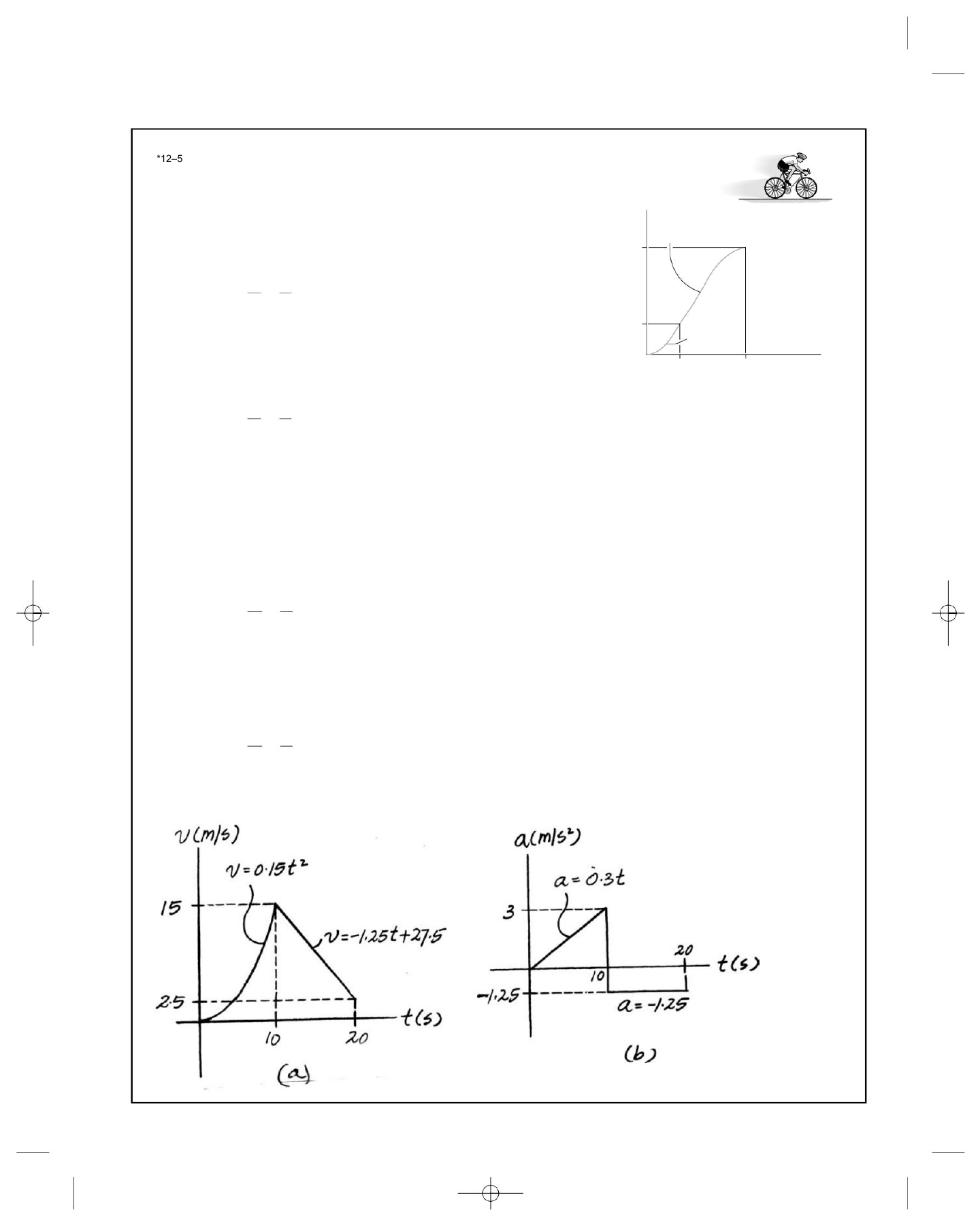 = 0,3(0) = 0 uma = = dtUMA:+B = e v-t dv O gráfico v – t é mostrado na Fig. dt Gráfico: Para o intervalo de tempo 0… t 6 10 s t(s) Para o intervalo de tempo 10 s 6 t… 20 s d 2 3 2 0,625 toneladas © 2010 Pearson Education, Inc., Upper Saddle River, NJ. Todos os direitos reservados. Este material está protegido por todas as leis de direitos autorais conforme atualmente d = -1,25(10) + 27,5 = 15m>s v UMA:+B o gráfico a – t é mostrado na Fig. e 10s, A0,05t 3 B = A0,15t 2 B m>s estrada é descrita pelo gráfico. Construa os gráficos. d = 0,3(10) = 3m>s , 137,5 2 dt = 0,15A102 B = 15m/s 91962_01_s12-p0001-0176 08/06/09 08:10 Página 41 2 ,Para o intervalo de tempo 10 s 6 t… 20 s v = 20 s 20 v = dt Quando t = 0s dt + 27,5t - 162,5B = (-1,25t + 27,5) m>s s (m) 50 no , e 20s, d t=0 2 UMA:+B A0,15t 2 B = (0,3t)m>s = = 0,15A02 B = 0 e 10s, *12–56. A posição de um ciclista viajando em linha reta em = 0 s = -1,25(20) + 27,5 = 2,5m>s ds 10 é A -0,625t dt no uma = t=10s v Nt = dt Quando t = 10s existir. Nenhuma parte deste material pode ser reproduzida, de qualquer forma ou por qualquer meio, sem permissão por escrito do editor. Quando t = 0s dt Gráfico: Para o intervalo de tempo 0… t 6 10 s ds 41 (-1,25t + 27,5) = -1,25m>s UMA:+B 0,05 t 27,5t 162,5 v = a dv vt = 10 s t=10s , Machine Translated by Google UMA :+ B UMA :+ B pelo gráfico. Construa o e 42 -15ds v = A 2-30s + 12000B m>s , , vem descansar. Ns s¿ = 400 m . 2 2 , gráfico para 0… s… s¿, O gráfico v – s é mostrado na Fig . eu = -15s pista reta com uma aceleração-desaceleração descrita vdv = L v = a 20,1s2 + 10sbm>s a condição inicial é v = 0 s = 0 s¿ a condição inicial é v = 77,46 m>ss = 200 m v dv = L (0,1s + 5)ds vdv = anúncios determine a distância percorrida antes do dragster novamente Quando v = 0 Em s = 200 m . 2 2 v , 0 = 2-30s¿ + 12.000 Resp. Gráfico: Para 0… s 6 200 m = 20,1A2002 B + 10(200) = 77,46m>s = 77,5m>s •12–57. O dragster parte do repouso e viaja ao longo de uma contra vdv = anúncios = A0,05s2 + 5sB 2 200 m 6 s … s¿ Para no no eu77,46m/s 0 00 200 metros v2 0 v versus = 200 m é é é v v v2 é 77,46m/s 200 metros 2 5 existir. Nenhuma parte deste material pode ser reproduzida, de qualquer forma ou por qualquer meio, sem permissão por escrito do editor. 200 um 0,1s 5 15 ) 25 © 2010 Pearson Education, Inc., Upper Saddle River, NJ. Todos os direitos reservados. Este material está protegido por todas as leis de direitos autorais conforme atualmente uma (m/s 91962_01_s12-p0001-0176 08/06/09 08:10 Página 42 s(m) s¿ Machine Translated by Google