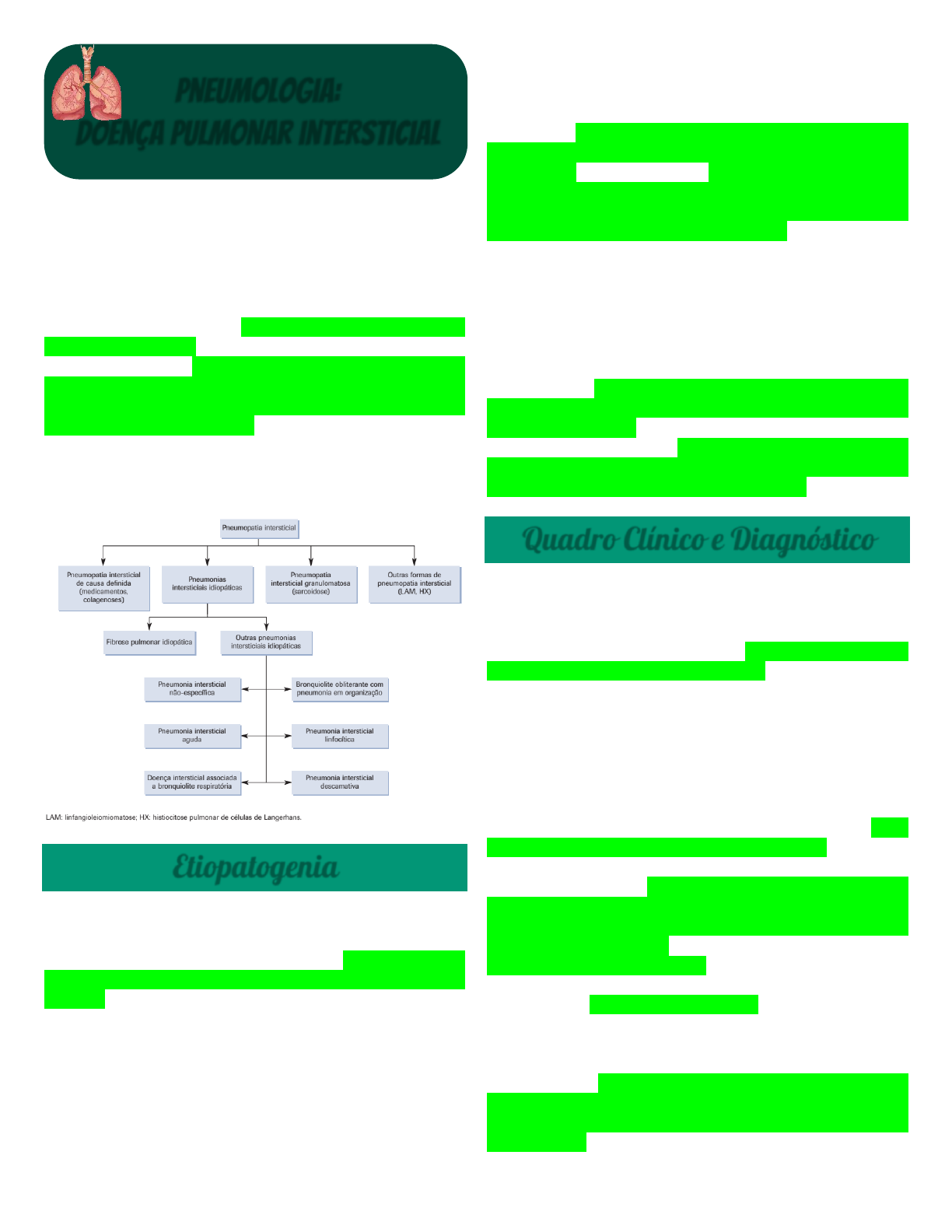 As doenças pulmonares intersticiais constituem um grupo heterogêneo de doenças que acometem o parênquima pulmonar de maneira difusa, mas que são classificadas em conjunto devido às suas semelhanças clínicas, radiológicas e de função pulmonar. Incluem-se neste grupo condições de diversas etiologias como: infecciosa, autoimune, tóxica, actínica e idiopática. Esse agrupamento justifica-se em parte pelo fato do interstício pulmonar dispor de uma variedade limitada de respostas a tais agressões, que resulta em um pequeno número de alterações histológicas e funcionais, com suas respectivas manifestações clínicas. Apesar da denominação, as doenças pulmonares intersticiais também afetam o epitélio alveolar, a circulação pulmonar e as vias aéreas em graus diversos. Etiopatogenia As DPI podem ter manifestação aguda ou insidiosa. Podem ter uma evolução rápida, lenta ou um curso estático. Incluem doenças pulmonares ocupacionais, como pneumoconiose, que é causada pela inalação de poeira inorgânica, como sílica, pó de carvão e pós de amianto; pneumonite por hipersensibilidade; doenças pulmonares causadas por exposição a substâncias tóxicas (p. ex., metotrexato, bleomicina, fenitoína, amiodarona); e doenças granulomatosas, como sarcoidose. Em alguns casos mais comuns de DPI a causa é a exposição à poeira e partículas inaladas e, em outros, não pode ser encontrada uma causa específica. Em contraste com as doenças pulmonares obstrutivas, que envolvem principalmente as vias respiratórias do pulmão, os distúrbios pulmonares intersticiais exercem seus efeitos sobre o colágeno e o tecido conjuntivo elástico encontrado no interstício delicado das paredes alveolares. Certos tipos de DPI afetam a parte distal dos alvéolos e isso causa restrições fisiológicas e diminuição dos volumes pulmonares. Outras DPI têm impacto sobre o interstício mais perto do aspecto proximal do ácino junto aos bronquíolos, o que provoca uma obstrução fisiológica, mas não afeta os volumes pulmonares. Muitas dessas doenças também envolvem as vias respiratórias, artérias e veias. Em geral, estas doenças pulmonares compartilham um padrão de disfunção pulmonar, que inclui redução dos volumes pulmonares, diminuição na capacidade de difusão do pulmão e diferentes graus de hipoxemia. Acredita-se que estes distúrbios sejam deflagrados por algum tipo de lesão do epitélio alveolar, seguido por um processo inflamatório que envolve os alvéolos e o interstício pulmonar. O acúmulo de células inflamatórias e imunológicas provoca danos permanentes ao tecido do pulmão e a substituição de tecido pulmonar de função normal por tecido cicatricial fibroso. Quadro Clínico e Diagnóstico As DPIs são tipicamente caracterizadas por: Dispneia progressiva A dispneia aos esforços progressiva costuma ser a queixa principal destes pacientes, acompanhada ou não de tosse com pouca expectoração. Outros sintomas respiratórios, embora menos comuns, devem ser pesquisados, pois podem fornecer informações úteis para o diagnóstico. Fadiga Dor Torácica A dor torácica pleurítica pode ocorrer com certas DPIs colagenovasculares ou induzidas por drogas, enquanto a dor torácica pleurítica aguda com dispneia pode representar um pneumotórax espontâneo em associação com a linfangioleiomiomatose, a esclerose tuberosa, a neurofibromatose ou a histiocitose de células de I.angerhans. Desconforto subesternal é mais comum na sarcoidose. Dor precordial, do tipo anginosa, relacionada aos esforços, pode estar presente na hipertensão pulmonar, uma complicação das afecções intersticiais avançadas. Hemoptise Sugere uma síndrome hemorrágica alveolar difusa, lúpus eritematoso sistêmico, linfangioleiomiomatose, granulomatose de Wegener ou síndrome de Goodpasture; ela é rara em outras DPls. Em pacientes com DPI existente, a hemoptise nova deve provocar Pneumologia: Doença pulmonar intersticial Igor Mecenas consideração sobre uma malignidade superposta, embolia pulmonar ou infecção como aspergilose. Outros Cianose periférica, baqueteamento, sinais de hipertensão pulmonar e cor pulmonale (hiperfonese da segunda bulha no foco pulmonar, sopro de refluxo tricúspide e edema de membros inferiores) ou os sinais e sintomas de uma doença sistêmica subjacente costumam ser tardios e relacionados a estágios avançados das doenças. Anamnese Outras informações, de fundamental importância diagnóstica, obtidas na anamnese, incluem: Sexo: a linfangioleiomiomatose, doença caracterizada pela proliferação de músculo liso no parênquima pulmonar e formação de cistos, ocorre apenas em mulheres em idade fértil. O acometimento pulmonar nas colagenoses, exceto na artrite reumatóide, também predomina no sexo feminino. Por outro lado, as doenças relacionadas a exposições ocupacionais são mais comuns entre os homens. Idade: a fibrose pulmonar idiopática, que representa o protótipo das pneumonias intersticiais idiopáticas, ocorre usualmente após os 50 anos. Já as doenças intersticiais relacionadas a colagenoses, sarcoidose, histiocitose pulmonar de células de Langerhans e linfangioleiomiomatose predominam entre os 20 e 40 anos. Duração dos sintomas: embora as pneumopatias intersticiais sejam classicamente vistas como condições crônicas, apresentações agudas são típicas na pneumonia intersticial aguda, na pneumonia organizante e na pneumonite por hipersensibilidade. Quadros subagudos podem ser observados nas reações a agentes e nas colagenoses. Por fim, progressão ao longo de meses caracteriza fibrose pulmonar idiopática e sarcoidose, entre outras. Tabagismo: a doença intersticial associada à bronquiolite respiratória, à pneumonia intersticial descamativa e à histiocitose pulmonar de células de Langerhans ocorrem quase exclusivamente em fumantes. O tabagismo constitui fator de risco também para a fibrose pulmonar idiopática. A sar