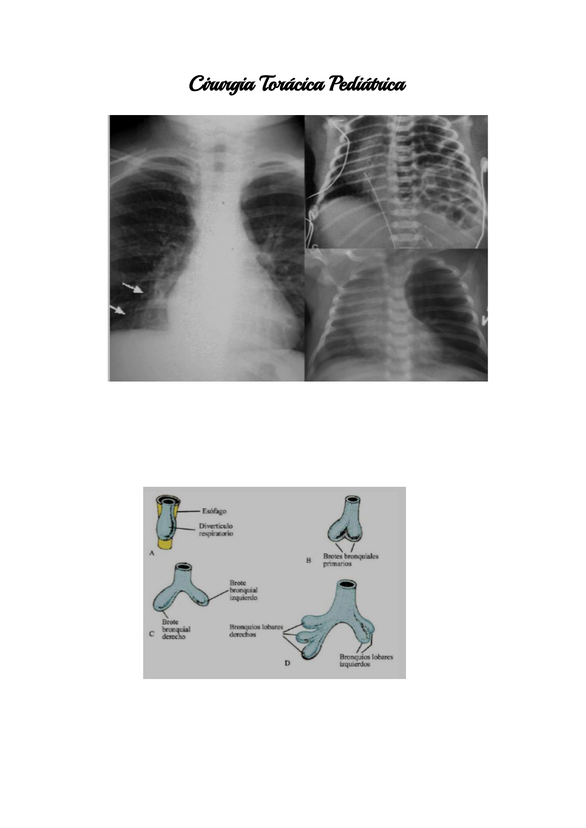 Cirurgia Torácica Pediátrica ● Cirurgia torácica pediátrica: São lesões do RN que vamos precisar saber identificar ● Embriologia: ○ massas mediastinais: intestino e timo ○ 3ª semana: intestino anterior-tubo, broto traqueal ○ 4 - 5ª semanas: septação esôfago e traqueia. ○ 4ª semana: diferenciação do epitélio traqueal e esofágico. ○ tubularização incompleta do epitélio intestinal: duplicação cística. ○ timo: porção ventral do 3º arco faríngeo ○ 7ª semana: anterior ao arco aórtico ○ ducto timofaríngeo: cisto congênito do timo ○ pulmão: 5 estágios - embriônico, pseudoglandular (7 - 16ª semana), canalicular (16 - 24ª semana), sacular e alveolar. ● Cistos do pulmão: ○ malformação adenomatoide cística congênita ○ sequestro broncopulmonar ○ enfisema lobar congênito ● Diagnóstico: ○ pré-natal ○ USG seriado ○ polidrâmnio (líquido amniótico excessivo) ○ hidropsia: obstrução da veia cava e compressão cardíaca → desbalanço mediastinal ■ ascite, derrame pleural e pericárdio, edema de pele e escalpo. ○ lesões pequenas: podem causar desconforto respiratório no período neonatal - muito pequenas: assintomático até final da infância (infecção, pneumotórax, degeneração maligna) ○ lesões grandes: podem regredir durante a embriogênese ou ter complicações como a hidropsia. ● Tratamento: ○ neonatos com comprometimento respiratório por lesão cística → ressecção cirúrgica (lobectomia) ○ casos graves: ventilação de alta frequência ou ECMO ○ assintomáticos: ressecção eletiva (risco infeccioso e transformação maligna) ■ blastoma pulmonar e rabdomiossarcoma: infância ■ carcinoma broncoalveolar: adolescentes e adultos jovens Malformação adenomatóide cística congênita ● Introdução: ○ massa multicística - proliferação nos bronquíolos terminais ○ ar, líquido ou ambos ○ suprimento sanguíneo - circulação pulmonar ● Histopatologia: ○ crescimento adenomatóide das estruturas terminais - cistos intercomunicantes com epitélio pseudoestratificado ciliado cuboide ou colunar. ○ crescimento da mucosa - aumento do tecido elástico na parede cística. ○ ausência de cartilagem, processo inflamatório. ○ presença de tecido muscular liso e elástico - parede cística ○ células secretoras de muco ● Classificação: ○ tipo 1: mais comum e diferenciada, massa macrocística (> 2 mc), anomalia congênita 5%. ○ tipo 2: massa microcística, múltiplos pequenos cistos (< 1 cm), bronquíolos e alvéolos entre os cistos, anomalia congênita 55% ○ tipo 3: grande massa sólida, com minúsculas estruturas císticas (< 0,5 cm). ● CAI NA PROVA: ○ Malformação adenomatóide cística congênita: ■ Epidemiologia: ● 25% lesões císticas pulmonares; 30 - 40% lesões no desenvolvimento broto pulmonar ● 1 : 25.000 a 35.000 ● 1,4 M : 1 F ● unilobar, 2% bilateral ● malformação congênita: agenesia renal, doença renal cística, atresia intestinal, cardíaca, hidrocefalia, pectus excavatum ● tipo 1: 60%, tipo 2: 30%, tipo 3: 10% ● DX diferencial: enfisema lobar congênito, hérnia diafragmática, cisto broncogênico, sequestro pulmonar e pneumatocele. ● Fisiopatologia: ○ disfunção respiratória - substituição do líquido por ar ○ aprisionamento de ar nos cistos ● Apresentação clínica: ○ tamanho, tipo e complicações ○ pré-natal: hidropsia e placentomegalia - síndrome do espelho materno (edema e HAS). ○ natimorto: ⅓ a ⅙ ○ prematuridade: 50% nascidos vivos ○ disfunção respiratória água (1º mês): 50 - 60% ○ hipertensão pulmonar: muscularização anormal dos vasos pulmonares ○ infecção respiratória de repetição: drenagem precária dos bronquiolos ○ pneumotórax hipertensivo: manobras de RCP, ventilação mecânica. ● Quadro clínico - 90% primeiro ano de vida: ○ dispneia, taquipneia, retrações e cianose. ○ abaulamento hemitórax ○ hiper-ressonância ○ diminuição do murmúrio vesicular ○ desvio do íctus: ■ prematuridade ■ ascite, anasarca ■ aparente hepatoesplenomegalia ■ clinica de HP ● Investigação: A: lesão em ápice direito ○ malignização: blastoma pleuropulmonar (lactentes e crianças pequenas); adenocarcinoma bronquíolo alveolar (crianças maiores, adolescentes e adultos). ○ 10% em malformações císticas pulmonares ● Tratamento: ○ lobectomia: um ou mais vasos aberrantes ○ idade ótima nos assintomático: 3 - 6 meses ○ urgência: disfunção respiratória grave com entubação e ventilação mecânica (alta frequência) ○ HP: tratar como hérnia diafragmática ○ toracotomia posterolateral ● Intervenção pré-natal: ○ hidropsia progressiva e menos de 32 semanas ○ lesões císticas solitárias: shunt toracoamniótico - para diminuir a pressão. ○ > 32 semanas: parto prematuro após terapêutica com betametasona ○ < 32 semanas: hidropsia progressiva, multicístico/sólido - lobectomia (anomalia cromossômica). ● Fatores prognósticos: ○ comprometimento bilateral ○ prematuridade ○ hipoplasia pulmonar ○ malformações associadas ○ hidropsia - ascite, quilotórax, derrame pericárdico, anasarca e edema de escalpo. Sequestro Broncopulmonar ● Introdução: ○ tecido pulmonar não funcionante, isolado, normalmente sem comunicação com a árvore brônquica e com irrigação arterial e venosa anômala. ○ tipo fetal e cístico ○ 20% pode ter comunicação com esôfago ou estômago ○ contém muco ● Classificação: ○ intralobar: incorporado dentro do pulmão normal com pleura visceral comum ○ extralobar: separado anatomicamente com pleura própria. ● Características: ○ comunicação fístulosa: malformação broncopulmonar congênita do intestino anterior; 75% direita ○ esõfago superior 5%, médio 10%, inferior 70% e estômago 15%. ○ suplementação vascular: artéria aberrante, ramo da aorta descendente ou abdomin