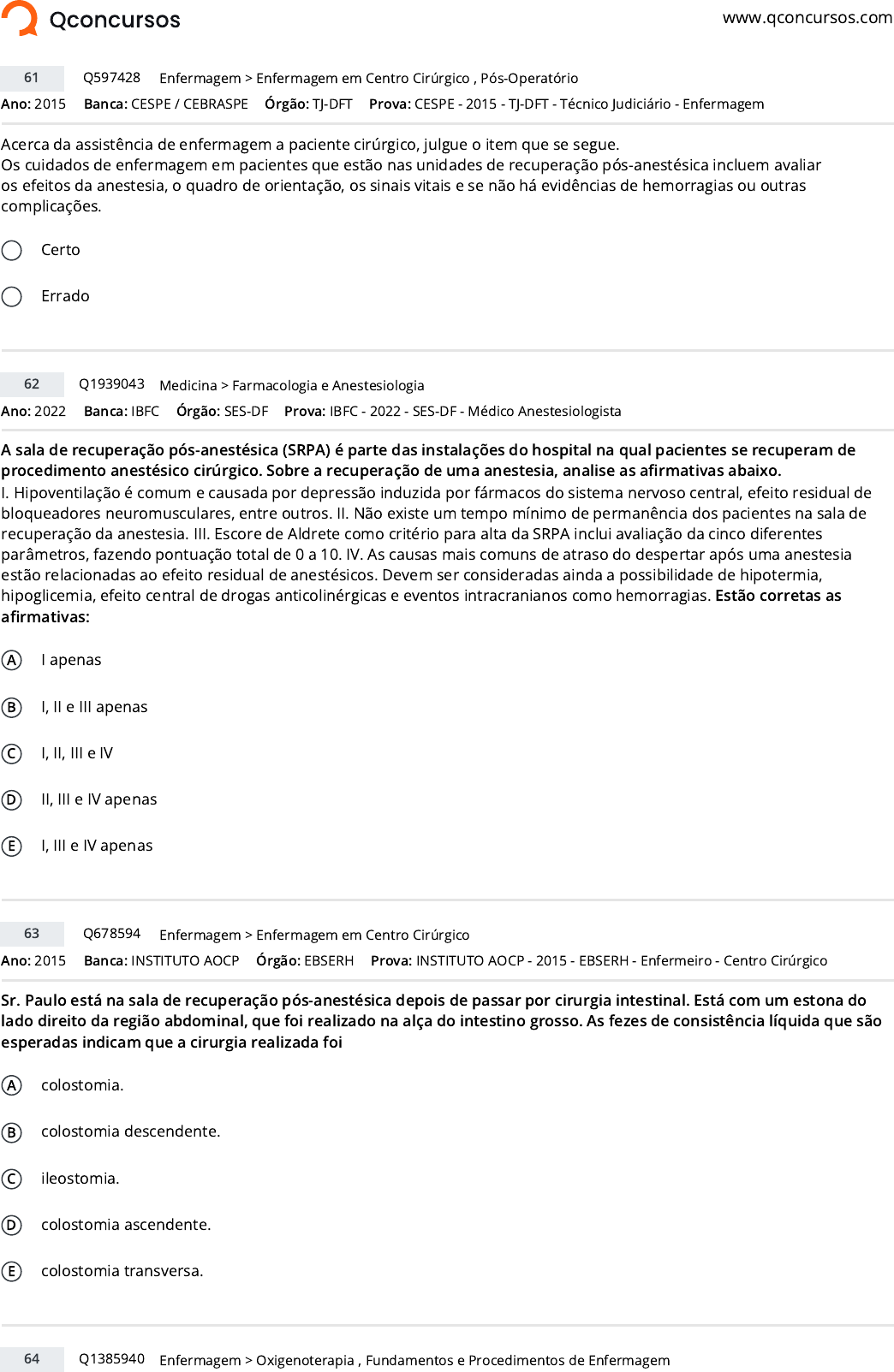 www.qconcursos.com Ano: 2015 Banca: CESPE / CEBRASPE Órgão: TJ-DFT Acerca da assistência de enfermagem a paciente cirúrgico, julgue o item que se segue. Os cuidados de enfermagem em pacientes que estão nas unidades de recuperação pós-anestésica incluem avaliar os efeitos da anestesia, o quadro de orientação, os sinais vitais e se não há evidências de hemorragias ou outras complicações. Certo Errado Ano: 2022 Banca: IBFC Órgão: SES-DF A sala de recuperação pós-anestésica (SRPA) é parte das instalações do hospital na qual pacientes se recuperam de procedimento anestésico cirúrgico. Sobre a recuperação de uma anestesia, analise as a�rmativas abaixo. I. Hipoventilação é comum e causada por depressão induzida por fármacos do sistema nervoso central, efeito residual de bloqueadores neuromusculares, entre outros. II. Não existe um tempo mínimo de permanência dos pacientes na sala de recuperação da anestesia. III. Escore de Aldrete como critério para alta da SRPA inclui avaliação da cinco diferentes parâmetros, fazendo pontuação total de 0 a 10. IV. As causas mais comuns de atraso do despertar após uma anestesia estão relacionadas ao efeito residual de anestésicos. Devem ser consideradas ainda a possibilidade de hipotermia, hipoglicemia, efeito central de drogas anticolinérgicas e eventos intracranianos como hemorragias. Estão corretas as a�rmativas: A I apenas B I, II e III apenas C I, II, III e IV D II, III e IV apenas E I, III e IV apenas Ano: 2015 Banca: INSTITUTO AOCP Órgão: EBSERH Sr. Paulo está na sala de recuperação pós-anestésica depois de passar por cirurgia intestinal. Está com um estona do lado direito da região abdominal, que foi realizado na alça do intestino grosso. As fezes de consistência líquida que são esperadas indicam que a cirurgia realizada foi A colostomia. B colostomia descendente. C ileostomia. D colostomia ascendente. E colostomia transversa. 61 Q597428 >Enfermagem Enfermagem em Centro Cirúrgico , Pós-Operatório Prova: CESPE - 2015 - TJ-DFT - Técnico Judiciário - Enfermagem 62 Q1939043 >Medicina Farmacologia e Anestesiologia Prova: IBFC - 2022 - SES-DF - Médico Anestesiologista 63 Q678594 >Enfermagem Enfermagem em Centro Cirúrgico Prova: INSTITUTO AOCP - 2015 - EBSERH - Enfermeiro - Centro Cirúrgico 64 Q1385940 >Enfermagem Oxigenoterapia , Fundamentos e Procedimentos de Enfermagem https://www.qconcursos.com/ https://www.qconcursos.com/questoes-de-concursos/bancas/cespe-cebraspe https://www.qconcursos.com/questoes-de-concursos/institutos/tj-dft https://www.qconcursos.com/questoes-de-concursos/bancas/ibfc https://www.qconcursos.com/questoes-de-concursos/institutos/ses-df https://www.qconcursos.com/questoes-de-concursos/bancas/instituto-aocp https://www.qconcursos.com/questoes-de-concursos/institutos/ebserh https://www.qconcursos.com/questoes-de-concursos/questoes/23df109b-bd https://www.qconcursos.com/questoes-de-concursos/disciplinas/enfermagem-enfermagem https://www.qconcursos.com/questoes-de-concursos/disciplinas/enfermagem-enfermagem/enfermagem-em-centro-cirurgico https://www.qconcursos.com/questoes-de-concursos/disciplinas/enfermagem-enfermagem/pos-operatorio https://www.qconcursos.com/questoes-de-concursos/provas/cespe-2015-tj-dft-tecnico-judiciario-enfermagem https://www.qconcursos.com/questoes-de-concursos/questoes/29cfbe81-02 https://www.qconcursos.com/questoes-de-concursos/disciplinas/medicina-medicina https://www.qconcursos.com/questoes-de-concursos/disciplinas/medicina-medicina/farmacologia-e-anestesiologia https://www.qconcursos.com/questoes-de-concursos/provas/ibfc-2022-ses-df-medico-anestesiologista https://www.qconcursos.com/questoes-de-concursos/questoes/4d7bd6b3-64 https://www.qconcursos.com/questoes-de-concursos/disciplinas/enfermagem-enfermagem https://www.qconcursos.com/questoes-de-concursos/disciplinas/enfermagem-enfermagem/enfermagem-em-centro-cirurgico https://www.qconcursos.com/questoes-de-concursos/provas/instituto-aocp-2015-ebserh-enfermeiro-centro-cirurgico https://www.qconcursos.com/questoes-de-concursos/questoes/744a4606-ee https://www.qconcursos.com/questoes-de-concursos/disciplinas/enfermagem-enfermagem https://www.qconcursos.com/questoes-de-concursos/disciplinas/enfermagem-enfermagem/oxigenoterapia https://www.qconcursos.com/questoes-de-concursos/disciplinas/enfermagem-enfermagem/fundamentos-e-procedimentos-de-enfermagem Ano: 2014 Banca: INSTITUTO AOCP Órgão: UFPB Paciente na sala de recuperação pós-anestésica está com oximetria de pulso menor do que 92% e o enfermeiro solicitou ao técnico de enfermagem que instalasse cateter nasal de oxigênio tipo óculos 2l/minuto. Sobre os cuidados com este tipo de oxigenioterapia, é correto a�rmar que A o cateter deve ser introduzido 10cm em uma das narinas do paciente. B deve-se medir o cateter da ponta do nariz ao lóbulo da orelha e, após, até o apêndice xifoide e introduzir o cateter em uma das narinas até a medida estimada. C o oxigênio não deve ser umidi�cado. D o oxigênio deve ser umidi�cado com solução salina. E o oxigênio deve ser umidi�cado com água destilada. Ano: 2018 Banca: CESPE / CEBRASPE Órgão: EBSERH Em 1970, Aldrete e Kroulik propuseram um sistema numérico de avaliação pós-anestésica que permite uma coleta de dados com critério de�nido realizado pelo enfermeiro da sala de recuperação pós-anestésica. A respeito desse assunto, julgue o item a seguir. Esse sistema apresenta como proposta a avaliação dos sistemas cardiovascular, respiratório, nervoso central e muscular de pacientes submetidos a ação dos fármacos e a técnicas anestésicas, por intermédio de parâmetros clínicos de fácil veri�cação com frequência respiratória, pressão arterial, atividade muscular e saturação periférica de oxigênio mediante oximetria de pulso. Certo Errado Ano: 2014 Banca: UPENET/IAUPE Órgão: Prefeitura de Paulista - PE Sobre cuidados pós-operatórios na sala de recup