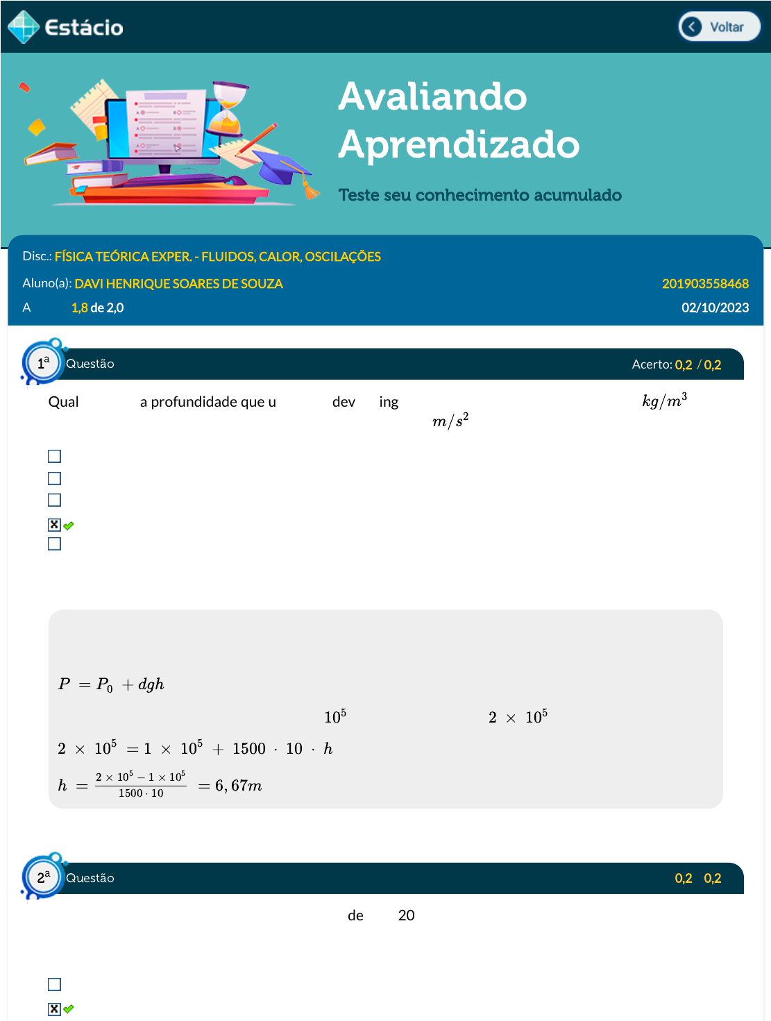 10/2/23, 1:26 PM Estácio: Alunos https://simulado.estacio.br/alunos/ 1/6 Avaliando Aprendizado Teste seu conhecimento acumulado Disc.: FÍSICA TEÓRICA EXPER. - FLUIDOS, CALOR, OSCILAÇÕES Aluno(a): DAVI HENRIQUE SOARES DE SOUZA 201903558468 Acertos: 1,8 de 2,0 02/10/2023 Acerto: 0,2 / 0,2 Qual deve ser a profundidade que um corpo deve atingir um líquido de densidade igual 1500 , para que atue sobre ele uma pressão de 2 atm? (Considere g = 10 ). 8,85m 8,92m 7,78m 6,67m 5,55m Respondido em 02/10/2023 13:15:33 Explicação: Utilizando a Lei de Stevin: Como a pressão na superfície é de 1 atm = Pa, temos que 2 atm = Pa, assim: Acerto: 0,2 / 0,2 Em um sistema massa mola em MHS, a amplitude é de 20,0 m e a sua frequência natural é de 5,0 rad/s. Se não há defasagem, assinale a opção que apresenta corretamente a velocidade do centro de massa da massa, no instante 40 s: 940,0 m/s 87,3 m/s kg/m3 m/s2 P = P0 + dgh 105 2 × 105 2 × 105 = 1 × 105 + 1500 ⋅ 10 ⋅ h h = = 6, 67m 2 × 105 − 1 × 105 1500 ⋅ 10 Questão1 a Questão2 a https://simulado.estacio.br/alunos/inicio.asp https://simulado.estacio.br/alunos/inicio.asp javascript:voltar(); javascript:voltar(); 10/2/23, 1:26 PM Estácio: Alunos https://simulado.estacio.br/alunos/ 2/6 2.000,0 m/s 100,4 m/s 1.000,0 m/s Respondido em 02/10/2023 13:16:06 Explicação: A resposta correta é 87,3 m/s. Acerto: 0,2 / 0,2 Em um termômetro, foi registrada uma variação de temperatura de 60 K. Em Kelvin, essa variação de temperatura corresponde a: 10 K 40 K 60 K 30 K 20 K Respondido em 02/10/2023 13:16:33 Explicação: Para solucionar esta questão, vamos considerar a equação (29): Como há uma variação de 30° C, vamos supor que houve um aquecimento de 0 K para 30 K. Essas temperaturas em Kelvin correspondem a: Então, a variação de temperatura em Kelvin é: Em outras palavras, a variação de temperatura em Kelvin é, em módulo, igual à variação de temperatura em Celsius. E isso é verdade para qualquer variação de temperatura. Acerto: 0,2 / 0,2 Assinale a quantidade de energia que deve ser retirada de 10 g de água a 0°C, para que ela possa virar gelo, a 0°C, se o seu calor de fusão é 540 cal/g: 5.400 cal 2.700 cal TC = TK − 273 TC = 0 − 273 ∴ TK = − 273 K TC = 60 − 273 ∴ TK = − 213 K ΔTK = −213 − (−273) = 60 K Questão3 a Questão4 a 10/2/23, 1:26 PM Estácio: Alunos https://simulado.estacio.br/alunos/ 3/6 -5.700 cal -5.400 cal -2.700 cal Respondido em 02/10/2023 13:18:00 Explicação: A resposta correta é: -5.400 cal Acerto: 0,0 / 0,2 Compreender o comportamento da luz nos permite entender como as imagens são formadas, pois sem interação da luz com a matéria, não há formação de imagens. Uma luz foi instalada no fundo de um chafariz, cujo índice de refração é 1,33. Para qual angulação dos raios de luz que saem do chafariz há re�exão total, sabendo que o segundo meio é o ar, cujo índice de refração é 1,00? 48,75o 48,25o 47,25o 47,75o 48,15o Respondido em 02/10/2023 13:21:09 Explicação: Para a re�exão total, temos que a Lei de Snell-Descartes assume a seguinte característica: arcsen(0,7519) = 48,75o Acerto: 0,2 / 0,2 No encanamento de uma residência, o cano ligado à caixa dágua possui de diâmetro, todavia, o cano ligado à mangueira do jardim possui . Se a velocidade de entrada de saída da água da caixa dágua é , a velocidade de saída na mangueira é igual a: 12/7 m/s 18,0 m/s 15,0 m/s 16,2 m/s 14,3 m/s Respondido em 02/10/2023 13:21:38 n1sen(ϕ1) = n2 ϕ1 = arcsen( ) n2 n1 3/4 " 1/2 " v1 = 9m/s Questão5 a Questão6 a 10/2/23, 1:26 PM Estácio: Alunos https://simulado.estacio.br/alunos/ 4/6 Explicação: Utilizando a equação da continuidade: A área da seção reta é a área de um círculo, assim: Acerto: 0,2 / 0,2 Uma onda eletromagnética se propaga no vácuo com a metade da velocidade da luz (c), com uma frequência angular de 4 vezes o módulo da velocidade da luz em rad/s. Assinale a opção que apresenta o comprimento de onda dessa onda: Respondido em 02/10/2023 13:22:04 Explicação: A resposta correta é: Acerto: 0,2 / 0,2 A1v1 = A2v2 v2 = A1v1 A2 A = πr2 v2 = πr12v1 πr22 v2 = r12v1 r22 v2 = ( ) 2 v1 d1 2 ( ) 2d2 2 v2 = (d1) 2 v1 (d2) 2 v2 = ⋅ 16, 2m/s (3/4) 2 (1/2) 2 mπ 8 mπ 16 mπ 2 πm mπ 20 πm Questão7 a Questão8 a 10/2/23, 1:26 PM Estácio: Alunos https://simulado.estacio.br/alunos/ 5/6 Um disco metálico de raio 0,5 m tem um coe�ciente de dilatação linear igual a . A área �nal desse disco para uma redução de temperatura de 18 °C é igual a: Respondido em 02/10/2023 13:23:10 Explicação: Da equação (36), temos que: Sabemos que: Também sabemos que: A redução de temperatura é de 4 °C, o que implica que . Assim: Acerto: 0,2 / 0,2 Certa massa de certo material recebeu 800.00 cal e se aqueceu em 4 °C. Se seu calor especí�co é de 10 cal/g°C, sua capacidade térmica é igual a: Respondido em 02/10/2023 13:25:29 Explicação: A resposta correta é: Acerto: 0,2 / 0,2 3, 2 × 10−6 °C−1 0, 25π m2 0, 51π m2 0, 45π m2 0, 39π m2 0, 62π m2 A(ΔT ) = A0 + A0βΔT β = 2α ∴ β = 2 ⋅ 3, 2 × 10−6 = 6, 4 × 10−6 °C−1 A0 = πr0 2 = r ⋅ (0, 5)2 = 0, 25π m2 ΔT = 18 °C A(ΔT ) = 0, 25π + 0, 25π ⋅ 6, 4 × 10−6 ⋅ (−18) A(ΔT ) = 0, 25π − 0, 0000288π ≅0, 25π m2 250.000 cal °C 720.500 cal °C 200.0025 cal °C 500.000 cal °C 60.750 cal °C 200.0025 cal °C Questão9 a Questão 10 a 10/2/23, 1:26 PM Estácio: Alunos https://simulado.estacio.br/alunos/ 6/6 Um dos avanços tecnológicos utilizados são os hologramas, onde projeções de imagens são produzidas pelo fenômeno da re�exão da luz. Qual é o ângulo entre dois espelhos planos para que número de imagens formado seja 16? 22,19o 22,18o 20,18o 20,19o 21,18o Respondido em 02/10/2023 13:26:19 Explicação: Número de imagens é dado por: ni = − 1 360 α α = 360 17 α = 21, 18o
