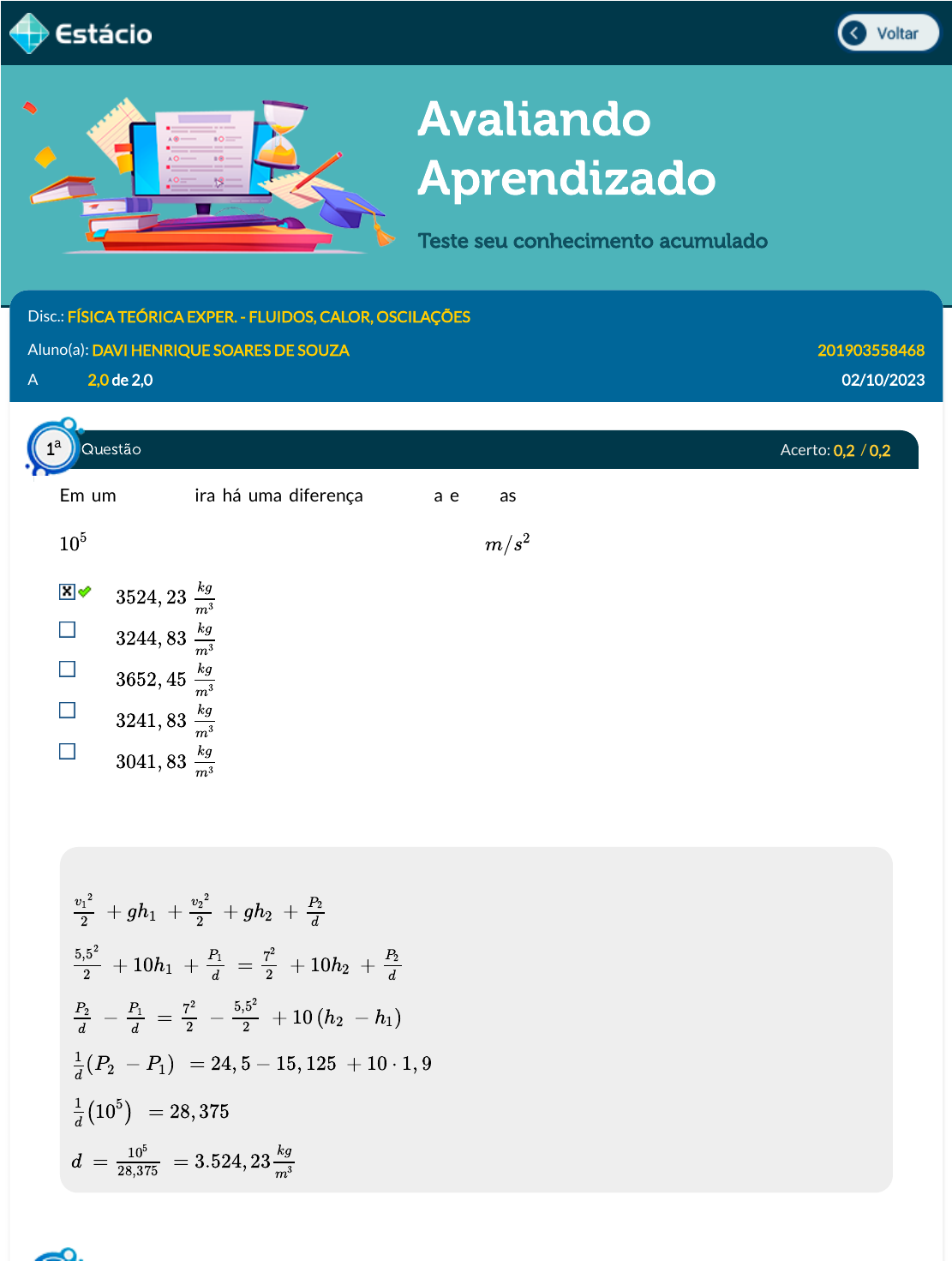 10/2/23, 12:56 PM Estácio: Alunos https://simulado.estacio.br/alunos/ 1/7 Avaliando Aprendizado Teste seu conhecimento acumulado Disc.: FÍSICA TEÓRICA EXPER. - FLUIDOS, CALOR, OSCILAÇÕES Aluno(a): DAVI HENRIQUE SOARES DE SOUZA 201903558468 Acertos: 2,0 de 2,0 02/10/2023 Acerto: 0,2 / 0,2 Em uma mangueira há uma diferença de altura entre as regiões 2 e 1 de 1,9 metros. A velocidade de entrada do líquido (na região 1) é de 5,5 m/s e a velocidade de saída é 7 m/s. Se a diferença de pressão é de Pa, a densidade do tubo é igual a: (considere g = 10 ). Respondido em 02/10/2023 12:48:45 Explicação: 105 m/s2 3524, 23 kg m3 3244, 83 kg m3 3652, 45 kg m3 3241, 83 kg m3 3041, 83 kg m3 + gh1 + + gh2 + v1 2 2 v2 2 2 P2 d + 10h1 + = + 10h2 + 5,52 2 P1 d 72 2 P2 d − = − + 10 (h2 − h1) P2 d P1 d 72 2 5,52 2 (P2 − P1) = 24, 5 − 15, 125 + 10 ⋅ 1, 9 1 d (105) = 28, 3751 d d = = 3.524, 23 105 28,375 kg m3 Questão1 a https://simulado.estacio.br/alunos/inicio.asp https://simulado.estacio.br/alunos/inicio.asp javascript:voltar(); javascript:voltar(); 10/2/23, 12:56 PM Estácio: Alunos https://simulado.estacio.br/alunos/ 2/7 Acerto: 0,2 / 0,2 Questão2 a 10/2/23, 12:56 PM Estácio: Alunos https://simulado.estacio.br/alunos/ 3/7 A função velocidade de uma onda harmônica em x = 0 é igual a: Respondido em 02/10/2023 12:49:18 Explicação: A resposta correta é: Acerto: 0,2 / 0,2 Um termômetro foi construído com escala não convencional, e a este foi atribuído o valor de -10 para a água em fusão e 10 para a água em ebulição. Assinale a alternativa que apresenta o valor que esse termômetro apontará para uma temperatura ambiente de 25 °C: 10,25 3,25 13,95 5,18 15,00 Respondido em 02/10/2023 12:49:44 Explicação: Precisamos estabelecer a equação de conversão: Isolando T, temos: Substituindo = 25: Acerto: 0,2 / 0,2 v(0, t) = A(ω − k)sen(kx + φ) v(0, t) = A(k + ω)cos(ωt + φ) v(0, t) = Acos(kx + φ) v(0, t) = Asen(ωt + φ) v(0, t) = Akcos(kx + φ) v(0, t) = A(k + ω)cos(ωt + φ) = T −10 10 − (10) TC −0 100 −0 = T −10 20 TC 100 T = + 10 20TC 100 TC T = + 10 = 15, 00 20 ⋅25 100 Questão3 a Questão4 a 10/2/23, 12:56 PM Estácio: Alunos https://simulado.estacio.br/alunos/ 4/7 Um determinado material sofre um aumento de temperatura de 100 °C, ao receber uma quantidade de energia igual a 5.789 cal. Sua capacidade térmica é igual a: Respondido em 02/10/2023 12:51:16 Explicação: A resposta correta é: Acerto: 0,2 / 0,2 Compreender o comportamento da luz nos permite entender como as imagens são formadas, pois sem interação da luz com a matéria, não há formação de imagens. Um raio de luz passa do ar atmosférico, cujo nar = 1,00, para um meio de refringência n = 1,75. A velocidade da luz nesse meio diferente do ar é igual a: Respondido em 02/10/2023 12:52:06 Explicação: O índice de refração é determinado por: Acerto: 0,2 / 0,2 Determinado cilindro possui área de seção reta cujo módulo é igual ao quadrado de 1/5 de sua altura. Se sua altura vale 4,5 m e em sua seção reta age uma força de 234 N, a pressão exercida nesta área é igual a: 305,33 Pa 85, 47 cal °C 69, 47 cal °C 57, 89 cal °C 97, 92 cal °C 779, 47 cal °C 57, 89 cal °C 1, 67 × 108m/s 1, 68 × 108m/s 1, 70 × 108m/s 1, 71 × 108m/s 1, 69 × 108m/s n = c v 1, 75 = 3×108 v v = 1, 71 × 18 Questão5 a Questão6 a 10/2/23, 12:56 PM Estácio: Alunos https://simulado.estacio.br/alunos/ 5/7 300,00 Pa 255,68 Pa 288,89 Pa 350,01 Pa Respondido em 02/10/2023 12:52:38 Explicação: Acerto: 0,2 / 0,2 Considerando um MHS, assinale a opção que representa, respectivamente, posição, velocidade e aceleração de uma onda que possui amplitude de 1,8 m e período de 2 segundos: (considere =0) Respondido em 02/10/2023 12:54:44 Explicação: A resposta correta é: Acerto: 0,2 / 0,2 A temperatura em Celsius correspondente a 0 K é igual a: -375 °C -273 °C -727 °C -781 °C A = ( h) 2 1 5 A = ⋅ (4, 5)2 1 25 A = 0, 81m2 P = F A P = = 288, 89Pa 234 0,81 φ x (t) = −1, 8cos(πt); v(t) = 1, 8π sen(πt); a(t) = −1, 8π2cos(πt) x (t) = 1, 8cos(πt); v(t) = 1, 8π sen(πt); a(t) = 1, 8π2cos(πt) x (t) = 1, 8cos(πt); v(t) = −1, 8π sen(πt); a(t) = −1, 8π2cos(πt) x (t) = −1, 8cos(πt); v(t) = −1, 8π sen(πt); a(t) = −1, 8π2cos(πt) x (t) = 1, 8cos(πt); v(t) = 1, 8π sen(πt); a(t) = −1, 8π2cos(πt) x (t) = 1, 8cos(πt); v(t) = −1, 8π sen(πt); a(t) = −1, 8π2cos(πt) Questão7 a Questão8 a 10/2/23, 12:56 PM Estácio: Alunos https://simulado.estacio.br/alunos/ 6/7 -698 °C Respondido em 02/10/2023 12:54:55 Explicação: Da equação (29), temos: Acerto: 0,2 / 0,2 Em uma transformação adiabática, temos que um gás se expande em 5 a uma pressão de 12 atm. A sua variação de energia interna é igual a: J J J J J Respondido em 02/10/2023 12:55:46 Explicação: A resposta correta é: J Acerto: 0,2 / 0,2 Compreender o comportamento da luz nos permite entender como as imagens são formadas, pois sem interação da luz com a matéria, não há formação de imagens. Um raio de luz incide em uma superfície com ângulo de 25° com a normal. Seu ângulo de re�exão é igual a: 55°. 25°. 15°. 65°. 5°. Respondido em 02/10/2023 12:55:50 Explicação: 25°. Correta TC = TK − 273 TC = 0 − 273 TC = −273 °C m3 −6, 0 × 102 −6, 0 × 105 −6, 0 × 106 −6, 0 × 104 −6, 0 × 103 −6, 0 × 106 Questão9 a Questão10 a 10/2/23, 12:56 PM Estácio: Alunos https://simulado.estacio.br/alunos/ 7/7 De acordo com a segunda lei da re�exão da luz, o ângulo formado entre o raio incidente com a reta normal à superfície re�etora é igual ao ângulo formado entre o raio re�etido com a reta normal à superfície re�etora. Desse modo, o ângulo de re�exão é igual a 25°.