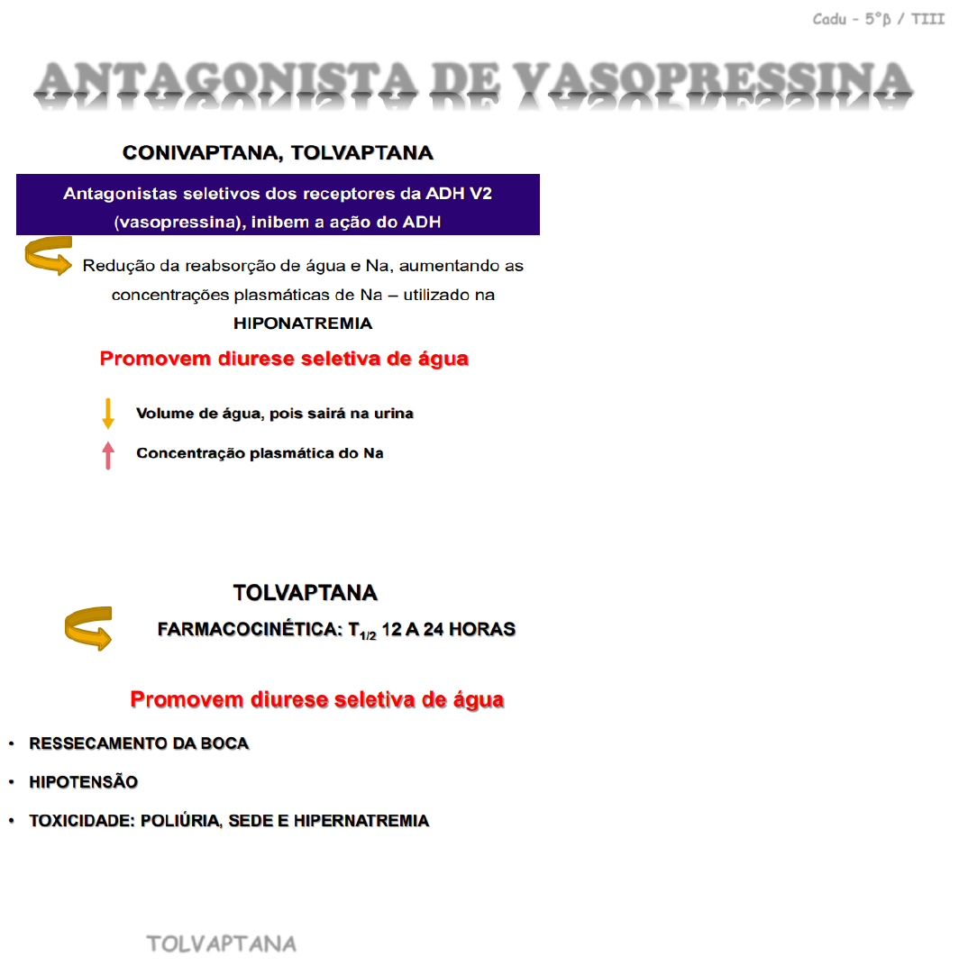 Cadu – 5°β / TIII TOLVAPTANA • Inibe reabsorção de Na e água, diurese rica em água e preserva eletrólito, aumenta concentração de sódio. • Usada na hiponatremia. ANTAGONISTA DE VASOPRESSINA