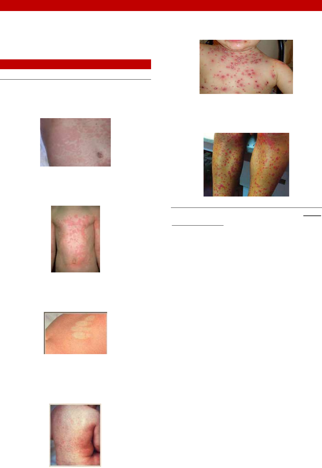 Natalia Quintino Dias Doenças exantemáticas Exantema: é uma erupção cutânea generalizada aguda, de curta duração, associada a infecção sistêmica primária. Varia na sua distribuição, na sua progressão e em algumas características morfológicas. Formas de manifestação Tipos de exantemas Exantema maculopapular • Morbiliforme: máculas e pápulas avermelhadas, confluentes ou não, com áreas de pele sã de permeio, exantema típico do sarampo; • Urticariforme: erupção papuloeritematosa com contornos irregulares, pode se apresentar em placas, comumente relacionado a reações medicamentosas. • Escarlatiniforme: eritema difuso, puntiforme, uniforme, áspero (em lixa), sem áreas de pele sã. Normalmente, os exantemas desaparecem à digitopressão; • Rubeoliforme: semelhante ao morbiliforme, mas de coloração rósea e com pápulas menores, presente na rubéola e em enteroviroses. Ocorre áreas de eritema entremeadas com áreas de pele sã; • Papulovesicular: sucessão de máculo-pápulas em vesículas, vesicopústulas e crostas, como na varicela. • Petequial ou purpúrico: alterações vasculares (extravasamento de hemácias) com ou sem alterações das plaquetas ou da coagulação, como na meningococcemia. Formato dos exantemas Pápula: lesão sólida, circunscrita, elevada, < que 1cm de diâmetro, causada por processo dérmico, epidérmico ou misto; Mácula: alterações da cor da pele sem relevo ou depressão. Podem ser divididas em vasculossanguíneas, devido à congestão, dilatação ou constrição de vasos, ou pigmentares, devido ao extravasamento de hemácias ou acúmulo de melanina; • Febre tifoide; sífilis secundária; meningococcemia; doença de Lyme; rubéola; sarampo; adenovírus; alergia; eritema multiforme ou marginado; LES. Vesícula: elevação circunscrita da epiderme, contendo líquido claro, seroso, que pode se tornar amarelo, pustuloso, ou rubro, hemorrágico; • Varicela-zóster; gonococcemia; estafilococcemia; foliculites; enterovírus; parvovírus B19. Bolhas: vesículas maiores; Petéquia: mancha vermelha que não desaparece à vitropressão, causada pelo extravasamento de hemácias na derme, com até 1 cm de diâmetro. Na sua evolução, torna-se arroxeada e verde- amarelada. Natalia Quintino Dias • Meningococcemia; gonococcemia; tifo epidêmico; toxoplasmose congênita; rubéola; dengue; hepatite B; vírus Epstein-Barr; alergia; coagulopatia. As mais importantes são: sarampo, escarlatina, rubéola, eritema infeccioso, exantema súbito, varicela, mononucleose infecciosa, toxoplasmose, doença de Kawasaki, síndrome do choque tóxico e meningococcemia. Sarampo É uma condição infecciosa aguda, de natureza viral, transmissível e extremamente contagiosa, além de caracterizar-se por ser um exantema maculopapular. Etiologia É causado pelo vírus Paramyxovirus. As imunoglobulinas IgG e IgM estimuladas pela infecção ou vacina aparecem em torno do 12º ao 15º dia após o surgimento do rash e atingem o nível máximo do vigésimo primeiro ao 28º dia. Assim, IgM indica infecção ou vacinação recente, enquanto IgG indica infecção anterior ou imune. Transmissão O vírus dissemina-se com elevada frequência entre os suscetíveis por contato direto ou por partículas. O contágio se faz por gotículas contaminadas que entram em contato com as vias aéreas desde dois dias antes do início dos pródromos até quatro dias após o aparecimento do exantema. Os reservatórios naturais são o ser humano e os macacos. O sarampo manifesta-se, na maioria das vezes, em crianças ou adultos não vacinados. Fisiopatologia Após a penetração do vírus no organismo, pelas vias aéreas superiores ou mucosas, ocorre a viremia com proliferação em tecidos linfáticos, denominada de viremia primária, período de maior disseminação, período prodrômico, ou seja, antes da manifestação do exantema. Após sete a 11 dias, pela progressão da viremia, instala-se a viremia secundária, acometendo principalmente pele, conjuntiva e mucosa do trato respiratório. O achado patológico característico é representado pelas células gigantes disseminadas. Quadro clínico Durante o período de incubação: febre baixa a moderada, tosse seca, coriza e conjuntivite. Após, surgem as manchas de Koplik: pontos brancoacinzentados pequenos e com discreta hiperemia periférica que surgem à altura dos molares na mucosa jugal, desaparecendo em até 48hrs (aparecem de 1-2d antes do exantema e desaparecem de 2-3d após o início do exantema). A febre ainda se mantém até três ou quatro dias após o surgimento do exantema, com pico máximo no início do período exantemático (38,5 a 40,5 °C), declínio após 24 horas e posterior exacerbação, a queda ocorre após o 3º ou 4º dia do exantema. Febre persistente após o quarto dia do exantema, o que impõe minucioso exame clínico à procura de infecção bacteriana secundária. O quadro clínico é mais exuberante nos dois dias após o aparecimento do exantema: febre elevada, exantema difuso, manchas de Koplik possivelmente presentes, conjuntiva congesta, fotofobia, lacrimejamento, coriza abundante e tosse produtiva, constituindo a “fácies sarampenta”. O exantema é do tipo eritematoso, maculopapular e morbiliforme, com progressão craniocaudal, iniciando-se na região retroauricular e no pescoço, evoluindo para região torácica e dorso e, finalmente, para os membros. O exantema começa a esmaecer em torno do 3º ou 4º dia, na mesma sequência que apareceu, deixando manchas acastanhadas. As lesões exantemáticas evoluem para descamação furfurácea (farelo). O isolamento respiratório é recomendado para pacientes internados até 4 dias após o início do exantema. Natalia Quintino Dias Fator de risco para complicações: imunodeficiência, evidências de hipovitaminose A, cegueira noturna, manchas de Bitot ou xeroftalmia, doença intestinal, má absorção e desnutrição moderada. Sarampo modific