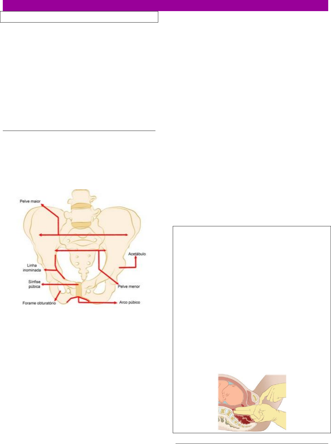 Natalia Quintino Dias O parto Anatomia Durante o parto, o assoalho pélvico sustenta a cabeça fetal, enquanto o colo do útero se dilata para permitir a saída do feto. Pode haver lesão do períneo, do músculo levantador do ânus e dos ligamentos da fáscia da pelve durante o parto. Os músculos pubococcígeo e puborretal, e as partes principais e mediais do músculo levantador do ânus, são os que se rompem com maior frequência. O enfraquecimento dessas estruturas pode ocasionar incontinência urinária de esforço. Pelve É constituída por quatro ossos que possuem forma anelar e, através deles, o peso corporal é transmitido aos membros inferiores: o sacro, o cóccix e os dois ossos ilíacos, lateralmente. Esses ossos articulam-se por meio de três articulações: a sínfise púbica, a sacroilíaca e a sacrococcígea. A pelve materna é subdividida em pelves maior e menor. Essas duas são separadas pela linha inominada, uma margem óssea encurvada que vai do promontório sacral até a margem superior da sínfise púbica. Assim, a linha terminal delimita a abertura superior da pelve menor, ou bacia obstétrica. A pelve maior é circundada pela parte superior do cíngulo do membro inferior, e é ocupada pelas vísceras abdominais inferiores. A pelve menor (bacia obstétrica), é circundada pela parte inferior do cíngulo do membro inferior, que forma a estrutura óssea dos compartimentos da cavidade pélvica e do períneo no tronco, separados pelo diafragma da pelve. Para a avaliação da via de parto, é necessário apenas o conhecimento das dimensões da bacia menor, que é dividida nos estreitos superior, médio e inferior. No sentido da progressão fetal, os estreitos têm importância nas distocias ósseas (causadas por alterações na bacia obstétrica). Estreito superior O diâmetro anterior de maior interesse obstétrico é a conjugata vera obstétrica, traçado do promontório à face posterior da sínfise púbica, medindo de 10,5 a 11 cm. É considerado o trajeto real da cabeça fetal, entretanto, não é possível medir este diâmetro, sendo, então, estimado a partir da medida da conjugata diagonalis, que é o diâmetro traçado do promontório à borda inferior da sínfise púbica. A conjugata diagonalis é 1,5 cm maior do que a conjugata vera obstétrica e, após ser mensurada, é possível, através da Regra de Smellie (CO = CD – 1,5 cm), calcular o valor da conjugata obstétrica. Os valores médios das conjugatas diagonalis e obstétrica são 12 cm e 10,5 cm, respectivamente. Calcula-se o valor da conjugata diagnoalis (CD) pelo exame de toque, e a técnica baseia-se em tocar o promontório da paciente até a borda inferior da sínfise púbica. Introduzindo o dedo indicador, aplica-se seu extremo sobre a saliência do promontório e marca-se, com o dedo da outra mão, o ponto de encontro entre a face anterior do púbis e a mão que já o tocava. Retirada a mão que realiza o toque de dentro da vagina, mede-se com o pelvímetro a conjugata diagonalis. Se o promontório for inatingível, deduz-se que a conjugata diagonalis é maior do que 12 cm, e que a conjugata vera obstétrica é maior do que 10,5 cm. E, portanto, não se espera distocia de estreito superior. Estreito médio É delimitado, no sentido posteroanterior, pela concavidade do osso sacro com a borda inferior do osso púbico e, lateralmente, pelas espinhas Natalia Quintino Dias isquiáticas. O diâmetro anteroposterior é o sacromediopúbico, que vai do meio da concavidade do osso sacro até o meio da face posterior da sínfise púbica, medindo 12 cm. O diâmetro transverso é o biespinha isquiática, que se estende de uma espinha isquiática à outra, medindo 10,5 cm e é o ponto de maior estreitamento de todo o canal de parto, que coincide com o Ponto 0 de De Lee. Estreito inferior É delimitado, anteriormente, pela borda inferior do osso púbico, lateralmente, pelos músculos sacroilíacos e, posteriormente, pelo músculo isquiococcígeno. O menor diâmetro é a conjugata exitus (diâmetro anteroposterior) e mede cerca de 9,5 cm. No entanto, na fase final da expulsão fetal, após a deflexão da cabeça fetal, há retropulsão do cóccix materno, e esta medida amplia-se em 2 ou 3 cm. Tipos de bacia Classificação de acordo com Caldwell & Moloy (1933), que define quatro tipos fundamentais, classificados com base na forma do estreito superior. Bacia ginecoide É a pelve feminina típica, e corresponde a cerca de 50% das bacias femininas. Possui o melhor prognóstico para o parto vaginal. Bacia antropoide Representa aproximadamente 25% das bacias femininas. Não apresenta bom prognóstico para o parto vaginal, mas, ocorrendo insinuação, evolui bem. Bacia androide Apresenta características da bacia masculina normal e representa cerca de 20% das bacias femininas. O parto por via baixa também não tem bom prognóstico, pois a distocia é crescente com a descida. Bacia platipeloide Corresponde a 5% das bacias femininas. Esse tipo é achatado no sentido anteroposterior. A distocia é maior na insinuação, mas amenizada depois, não impossibilitando o parto pela via vaginal. Estática fetal Compreende as relações espaciais entre o organismo materno e o feto. São avaliadas atitude, situação, apresentação e posição do feto. Atitude fetal É a relação das diversas partes fetais entre si e depende da disposição dos membros e da coluna vertebral. A atitude fisiológica nas apresentações cefálicas é a flexão generalizada, com mento encostado no esterno. Em situações anômalas, pode haver extensão da coluna com deflexão do polo cefálico, levando às apresentações defletidas de 1º, 2º e 3º graus. A atitude fisiológica na apresentação pélvica é a chamada pélvica completa, com as coxas fletidas e aconchegadas ao abdome, e as pernas fletidas junto às coxas. As situações anômalas incluem o modo de nádegas (ou agripina), quando as pernas estão estendidas sobre a barriga fetal, 