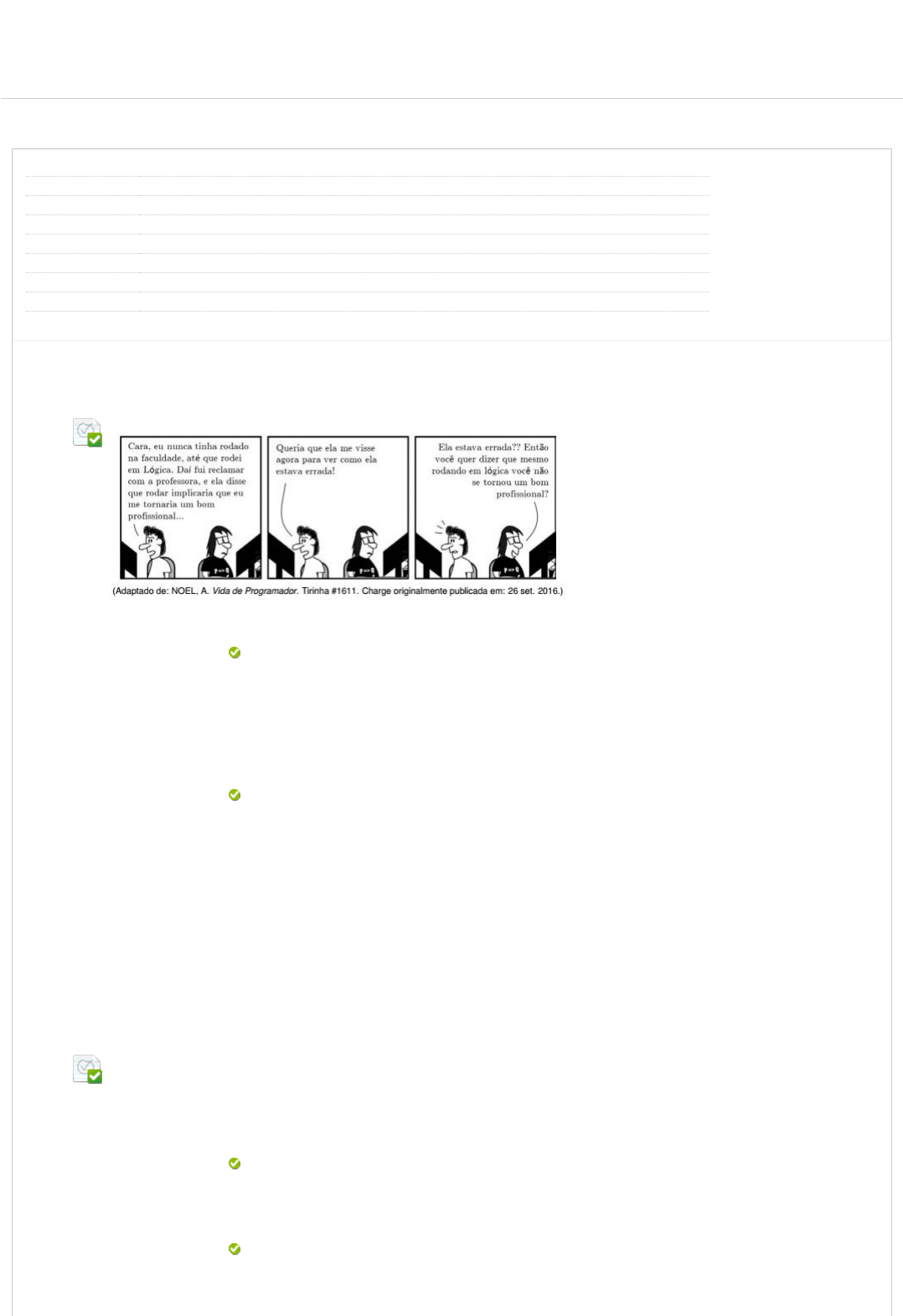 02/10/2023, 20:46 Revisar envio do teste: QUESTIONÁRIO UNIDADE I – ESTUDOS... https://ava.ead.unip.br/webapps/assessment/review/review.jsp?attempt_id=_98364958_1&course_id=_309873_1&content_id=_3635254_1&retu… 1/5 Revisar envio do teste: QUESTIONÁRIO UNIDADE IESTUDOS DISCIPLINARES XII 6675-10_DP_AD_20_20232 CONTEÚDO Usuário indianara.goncalves @aluno.unip.br Curso ESTUDOS DISCIPLINARES XII Teste QUESTIONÁRIO UNIDADE I Iniciado 02/10/23 20:42 Enviado 02/10/23 20:45 Status Completada Resultado da tentativa 5 em 5 pontos Tempo decorrido 3 minutos Resultados exibidos Todas as respostas, Respostas enviadas, Respostas corretas, Comentários, Perguntas respondidas incorretamente Pergunta 1 Resposta Selecionada: e. Respostas: a. b. c. d. e. Comentário da resposta: (COPS-UEL/2019) Observe a imagem a seguir: Assinale a alternativa que apresenta, corretamente, a regra lógica que fundamenta o efeito cômico da tirinha. P → Q é falsa se, e somente se, P é verdadeiro e Q é falso. P → Q é verdadeira se, e somente se, P é verdadeiro. P → Q é verdadeira se, e somente se, Q é verdadeiro. P → Q é falsa se, e somente se, P é verdadeiro. P → Q é falsa se, e somente se, P é falso ou Q é verdadeiro. P → Q é falsa se, e somente se, P é verdadeiro e Q é falso. Resposta: E Comentário: A questão pede, apenas, a regra lógica que estabelece se uma proposição composta condicional (do tipo P → Q) é verdadeira ou falsa. A única forma de termos a proposição falsa é com antecedente (P) verdadeiro e consequente (Q) falso. Todas as outras combinações para as proposições simples componentes tornam a proposição composta P → Q verdadeira. No quadrinho, a proposição da professora pode ser reescrita no formato condicional como: “se você reprovar, então se tornará um bom pro�ssional”. Para que ela esteja errada (ou seja, para que a proposição dela seja falsa), o personagem não pode ter se tornado um bom pro�ssional, já que o consequente precisa ser falso. Pergunta 2 Resposta Selecionada: c. Respostas: a. b. c. d. e. (IBFC/2019 - adaptada) Considere o seguinte quadro de referência de símbolos: Dada a frase a seguir, com estrutura p ∧ q, selecione a alternativa que expresse corretamente a sentença: ~p v~q. “O dia se renova todo dia e eu envelheço cada dia, cada mês.” O dia não se renova todo dia ou eu não envelheço cada dia, cada mês. O dia não se renova todo dia e eu não envelheço cada dia, cada mês. O dia não se renova todo dia e eu envelheço cada dia, cada mês. O dia não se renova todo dia ou eu não envelheço cada dia, cada mês. O dia se renova todo dia ou eu envelheço cada dia, cada mês. O dia se renova todo dia se, e somente se, eu envelheço cada dia, cada mês. UNIP EAD BIBLIOTECAS MURAL DO ALUNO TUTORIAISCONTEÚDOS ACADÊMICOS 0,5 em 0,5 pontos 0,5 em 0,5 pontos http://company.blackboard.com/ https://ava.ead.unip.br/webapps/blackboard/execute/courseMain?course_id=_309873_1 https://ava.ead.unip.br/webapps/blackboard/content/listContent.jsp?course_id=_309873_1&content_id=_3617523_1&mode=reset https://ava.ead.unip.br/webapps/portal/execute/tabs/tabAction?tab_tab_group_id=_10_1 https://ava.ead.unip.br/webapps/portal/execute/tabs/tabAction?tab_tab_group_id=_27_1 https://ava.ead.unip.br/webapps/portal/execute/tabs/tabAction?tab_tab_group_id=_47_1 https://ava.ead.unip.br/webapps/portal/execute/tabs/tabAction?tab_tab_group_id=_29_1 https://ava.ead.unip.br/webapps/portal/execute/tabs/tabAction?tab_tab_group_id=_25_1 https://ava.ead.unip.br/webapps/login/?action=logout 02/10/2023, 20:46 Revisar envio do teste: QUESTIONÁRIO UNIDADE I – ESTUDOS... https://ava.ead.unip.br/webapps/assessment/review/review.jsp?attempt_id=_98364958_1&course_id=_309873_1&content_id=_3635254_1&retu… 2/5 Comentário da resposta: Resposta: C Comentário: Se temos estrutura p ∧ q para a sentença composta “O dia se renova todo dia e eu envelheço cada dia, cada mês”, então temos as seguintes proposições simples: p: O dia se renova todo dia. q: Eu envelheço cada dia, cada mês. Para escrevermos ~p v~q, devemos negar cada uma das proposições simples e uni-las pelo conectivo OU. Temos, portanto: O dia não se renova todo dia ou eu não envelheço cada dia, cada mês. Pergunta 3 Resposta Selecionada: c. Respostas: a. b. c. d. e. Comentário da resposta: (FUNDATEC/2019) Duas proposições quaisquer, “p” e “q”, formam uma proposição composta por conjunção, tal que p ∧ q. Nessa situação, é correto a�rmar que o resultado da proposição será: Falso se pelo menos uma das duas proposições simples for falsa. Falso para qualquer valor lógico das proposições simples. Verdadeiro para qualquer valor lógico das proposições simples. Falso se pelo menos uma das duas proposições simples for falsa. Verdadeiro se pelo menos uma das duas proposições simples for verdadeira. Falso se a preposição “p” for verdadeira. Resposta: C Comentário: Na conjunção, temos proposições simples unidas entre si pelo conectivo E (∧). A proposição composta p ∧ q será verdadeira apenas se ambas as proposições simples componentes forem verdadeiras. Portanto, basta que uma delas seja falsa, para que a proposição composta também seja falsa. Pergunta 4 Resposta Selecionada: d. Respostas: a. b. c. d. e. Comentário da resposta: Do ponto de vista da lógica formal, uma proposição pode ser de�nida como uma sentença declarativa classi�cada como verdadeira ou falsa, assumindo um, e apenas um, desses dois valores lógicos. Dessa forma, sentenças imperativas ou interrogativas não são consideradas proposições. Nesse contexto, assinale a alternativa que apresenta uma proposição. O Brasil é o maior país da América do Sul. Que dia é hoje? Boa tarde! Estude quatro horas por dia. O Brasil é o maior país da América do Sul. Qual é o seu nome? Resposta: D Comentário: A única sentença que traz uma informação que pode ser cla