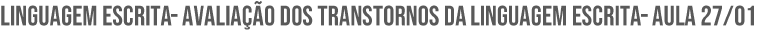 1 1) AVALIAÇÃO LINGUAGEM ESCRITA - É muito importante que ela seja uma avaliação multidisciplinar: • Neurológica (ENE) → Avaliação clínica para descartar outros quadros patológicos que podem explicar melhor o quadro • Neuropsicológica (testes de percepção e cognição) → Qualifica e quantifica o nível de inteligência e funções executivas (identifica a questão da inteligência, qual o tipo de inteligência) • Pedagógica (Conteúdo Escolar) e psicopedagogia → Desempenho acadêmico (o que é esperado para aquele ano escolar e quais habilidades o indivíduo tem) • Terapeuta Ocupacional → Avaliação das habilidades visuomotoras • Audiológica e Oftalmológica → Identificar questões perceptivo-auditivo e descartar questões sensoriais • Fonoaudiológica → Faz uma abrangente avaliação da linguagem (sintaxe, semântica, pragmática); oralidade, processamento fonológico, processamento ortográfico, leitura e escrita) - Além da questão técnica da aplicação de testes, é importante preocupar com a abordagem do indivíduo acolhido: • Saúde física • Saúde mental • Educação • Socialização • Acolhimento / aceitação familiar • Acompanhamento - Para se efetuar satisfatória avaliação na qual o escolar possa se beneficiar e obter efetiva resposta às suas dificuldades é necessário: • Rigoroso trabalho, de preferência com equipe multidisciplinar • Observação atenta não só das dificuldades apresentadas, mas também das habilidades, para que possa haver balizamento entre ambas e, a partir dos resultados encontrados, direcionar-se a forma mais adequada de intervenção 2) FONOAUDIOLOGIA - É de competência do fonoaudiólogo, de acordo com a lei que regulamenta a profissão, participar de equipes de diagnóstico, realizando a avaliação da comunicação oral e escrita, voz e audição. (Lei n° 6965 – 9/12/1981) - Especificamente a Fonoaudiologia neste contexto é responsável pela investigação dos aspectos relacionados à linguagem, seu uso e funções a ela relacionadas, seja na modalidade escrita ou oral. - As habilidades investigadas: • Linguagem Oral → É importante investigar o que é consequência da linguagem oral e o que realmente é 2 • Processamento fonológico • Processamento ortográfico • Processamento visual • Fluência verbal e ritmo • Leitura • Avaliação audiológica e do processamento auditivo - Anamnese: • Direcionada a quem? → Cuidadores • Visita à escola → Contato com o ambiente escolar, pois estamos lidando com uma queixa acadêmica, então ir aonde as habilidades são desenvolvidas é a raiz do problema • Contato com outros profissionais envolvidos no caso • Visita à residência → quando necessário 3) SENSAÇÃO, PERCEPÇÃO E FUNÇÕES EXECUTIVAS - Exame Neurológico Evolutivo (ENE) • Prova Tátil • Propriocepção • Equilíbrio estático e propriocepção - EYE TRACKING (Avaliação do rastreamento ocular) • Não é uma avaliação cotidiana • Rastreamento ocular → identifica a atividade visual (movimentos sacádicos → como que o globo ocular se movimenta pra leitura) • É uma forma de medir a atividade visual • Medidas: Tempo, localização e pontos de fixação • Equipamentos: Computadores: + eyetracker (fonte de luz infravermelha + câmera) • Exemplo: - Cada bolinha vermelha é onde o olho para pra ler, o primeiro é um leitor fluente, sem problemas de leitura e o segundo é um leitor com alteração na linguagem escrita (dislexia). Quanto maior a bolinha, mais tempo ele ficou parado 3 - Funções executivas: 1- ATENÇÃO • Testes: - Escala SNAP • Aplicado em 2 contextos (pais e escolas) • 6 ou mais itens • 2 ou mais contextos • Presente a pelo menos 6 meses - Avaliação neuropsicológica da atenção → Realizada por psicólogos • Testes de Cancelamento - Indivíduo tem que fazer um X toda vez que ela identificar visualmente o símbolo alvo → Mede-se o tempo, distrações e erros • Testes de Trilhas - Pessoa liga os números, número e letras... 4 • Testes de Stroop - Indivíduo deve nomear as cores • Concentrada (D2) - O indivíduo deve identificar onde tem o D com dois tracinhos 5 • Código – wisc ou wais III - Embaixo de cada número deve ser colocado o símbolo correspondente 2- DEMAIS HABILIDADES DAS FUNÇÕES EXECUTIVAS • Planejamento • Flexibilidade cognitiva • Memória de trabalho • Atenção seletiva • Controle inibitório • Monitoramento - Outras habilidades: • Organização • Priorização • Manejo de tempo • Atenção sustentada • Iniciação e persistência em direção ao objetivo • Regulação emocional OBS: NEUPSILIN → Bateria de avaliação breve das funções executivas (Versão adulta e infantil) → Pode ser aplicado por fonoaudiólogos e psicólogos - Resumo: Linguagem Oral • Avaliação fonológica e morfológica • Avaliação pragmática • Organização sintática e semântica OBS: Nem sempre terá testes formais na idade do paciente para avaliar essas funções, então se usa testes informais (conversas, piadas, ironia...) 4) DISLEXIA 6 - Sinais precoces da dislexia → Na anamnese esses sinais vão nos indicar se existe uma dificuldade prévia que indica que essa linguagem pode não ter um adequado funcionamento 5) PROCESSAMENTO FONOLÓGICO - Pontos específicos que o fonoaudiólogo avalia na bateria de avaliação da linguagem escrita: OBS: Não tem um protocolo, uma bateria única para avaliação da linguagem. Utiliza-se vários testes para avaliar diferentes aspectos da linguagem escrita - COMO AVALIAR: 1- MEMÓRIA OPERACIONAL • Função neurobiológica fundamental e complexa. • É um dos grandes enigmas da natureza 7 Memória de acordo com conteúdo Memória sensorial Memória em relação ao tempo • Verbal • Não-verbal: visual, viso- espacial • Somatossensitiva (tato, olfato, gustação) • Memória ultracurta e relaciona-se aos órgã