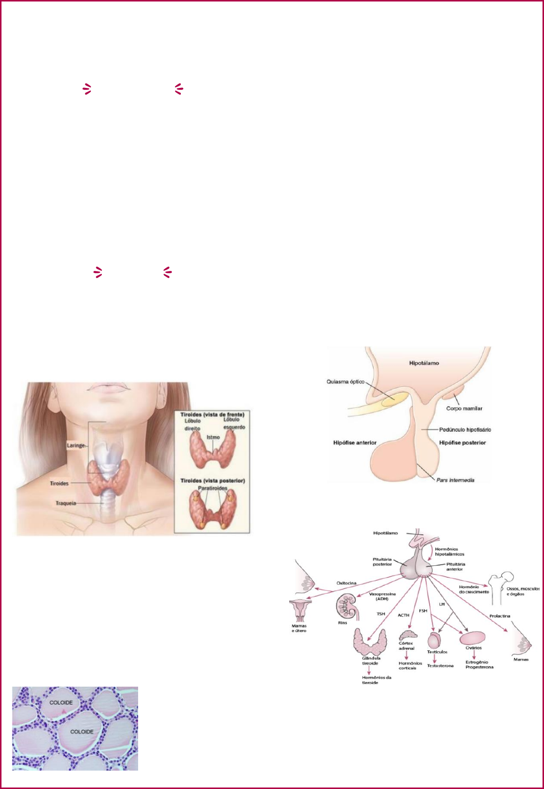 Hipotireoidismo Introdução → Hipotireoidismo é uma síndrome clínica resultante da produção ou ação deficiente dos hormônios tireoidianos, resultando em lentificação dos processos metabólicos. → Uma das doenças endócrinas mais comuns → Diagnóstico é feito usualmente por clínicos → Doença de tratamento exclusivamente clínico → Carregada de pré conceitos – se não for tratado pode ocorrer aumento de peso Tireoide → Glândula tireoide pesa em torno 10 a 20 g (ligeiramente maior em homens do que em mulheres) → Se localiza anteriormente à traquéia logo abaixo da cartilagem cricóide → É formada por: lobo direito; lobo esquerdo e istmo (que junta os dois lobos) → Microscopicamente a tireoide é composta de folículos esféricos, cada um composto por uma única camada de células foliculares ao redor de um lúmen preenchido com coloide principalmente tireoglobulina. → A tireoglobulina é uma molécula que contém os hormônios tireoideanos. Uma vez que a secreção chega aos folículos, deve ser reabsorvida através do epitélio folicular para o sangue, para poder realizar sua função no corpo → Secreta dois hormônios principais, a tiroxina (T4) e triiodotironina (T3), ambos aumentam o metabolismo do organismo → O iodo é necessário para formar T3 e T4 → Um adulto deve ingerir cerca de 150mcg de iodo na forma de iodeto por dia. Para suprir essa necessidade, o sal de cozinha é suplementado (1gt Lugol = 6mg iodo) → O iodeto ingerido é absorvido pelo TGI. A maior parte do iodeto é rapidamente excretada pelos rins, mas cerca de 1/5 é seletivamente removido do sangue circulante pelas células da tireoide e usado para a síntese dos hormônios tireoideanos → A secreção tireoidiana é controlada principalmente pelo hormônio estimulante da tireoide (TSH) secretado pela adeno-hipófise → A hipófise fica localizada abaixo do hipotálamo e anteriormente fica o quiasma óptico. → A hipófise além de produzir o TSH, produz outros hormônios como ACTH, os hormônios sexuais, hormônio de crescimento, prolactina → Excesso de T3 e T4 → hipotálamo e hipófise → para de estimular a tireoide → diminui o TRH → diminui o TSH → diminui T3 e T4 → Falta de T3 e T4 → hipófise e hipotálamo → aumenta TRH → aumenta TSH → aumenta estímulo da tireoide Hormônios tireoideanos → T4 (TIROXINA) = 3,5,3',5'-tetraiodo-L-tironina → T3 (TRIIODOTIRONINA) = 3,5,3'- triiodotironina - a forma ativa do hormônio → O total plasmático de T4 é cerca de 45 vezes maior que o de T3 (90nM versus 2nM) → Principal fonte de produção de T3 = conversão de T4 em T3 (5' desiodação de T4 nos tecidos periféricos promovida pelas desiodases) → Circulam comumente ligados às proteínas plasmáticas (aumenta suas meias-vidas e assegura uma distribuição regular do hormônio nos tecidos alvos) → Somente 0,03% de T4 e 0,3% de T3 estão livres, a maioria está ligado → A entrada e a saída do hormônio nas células ocorre, em uma maior parcela, através de transportadores específicos que regulam a captação e o efluxo → No interior da célula, o T3 liga-se a receptores específicos localizados no núcleo, os receptores do hormônio tireoideano (TRs). → Os TRs medeiam a ação do hormônio ligando-se diretamente na região promotora dos genes alvos, regulando a transcrição em todos os tecidos → Em mamíferos = atuam em todos os órgãos e vias metabólicas → Principais efeitos Desenvolvimento de vários tecidos (SNC) Consumo de oxigênio Regulação da temperatura corporal Frequência cardíaca Metabolismo de CHO, PTN e GORD Participam da síntese e a degradação de muitos outros Fatores de crescimento e hormônios (efeitos secundários) Hipotireoidismo • Pode ocorrer em todas as faixas etárias • Na idade adulta acomete 2% das mulheres e 0,2% dos homens • No indivíduos com mais de 65 anos, a prevalência é de 6% em mulheres e de 2% nos homens • Hipotireoidismo Congênito incidência variando de 1:2.000 a 1:4.000 crianças nascidas vivas • Primário: por deficiência da glândula tireóide (95%) • Secundário: deficiência na secreção de TSH (hipófise) - (tumores, traumas, infecções vasculares, infiltrativas, inflamatórias ou congênitas). Perda de tecido funcional, defeitos funcionais na biossíntese ou liberação do TSH (mutações genéticas ou drogas como dopamina e glicocorticoides) • Terciário: estimulação inapropriada pelo TRH (hipotálamo) mais comum em crianças – irradiação, doenças infiltrativas, traumáticas ou neoplásicas • Periférico: ação reduzida dos hormônios tiroidianos nos órgãos-alvo (resistência aos hormônios tiroidianos- raro) - mutações em genes importantes na resposta do hormônios tiroidianos em tecidos-alvo • Congênito: distúrbio endócrino congênito mais frequente, uma das principais causas de retardo mental que pode ser prevenida Hipotireoidismo primário → Causa mais frequente = Tireoidite Autoimune Crônica (Tireoidite de Hashimoto) → Pós tratamento de Hipertireoidismo (cirurgia, radiação com I-131 ou uso de drogas antitiroidianas) → hipotireoidismo pós- iodo → Tireoidite pós-parto, subaguda, silenciosa ou tiroidite induzida por citocinas. → Deficiência ou excesso de iodo. → Doenças infiltrativas ou infecciosas, radioterapia externa, disgenesias da tiroide, defeitos funcionais na biossíntese e liberação dos hormônios tiroidianos ou defeitos congênitos na biossíntese dos hormônios da tiroide. → Uso de certos fármacos, que incluem agentes antitiroidianos: lítio, inibidores da tirosina-quinase, a interleucina-2 ou interferon-α (IFN-α), amiodarona, etc Tireoidite de Hashimoto • Tireoidite de hashimoto (TH) ou tireoidite linfocítica crônica é uma doença auto imune, caracterizada por infiltrado linfo- plasmocitário do parênquima tireoideano. • TH = incapacidade dos linfócitos T supressores em destruir clones de linf