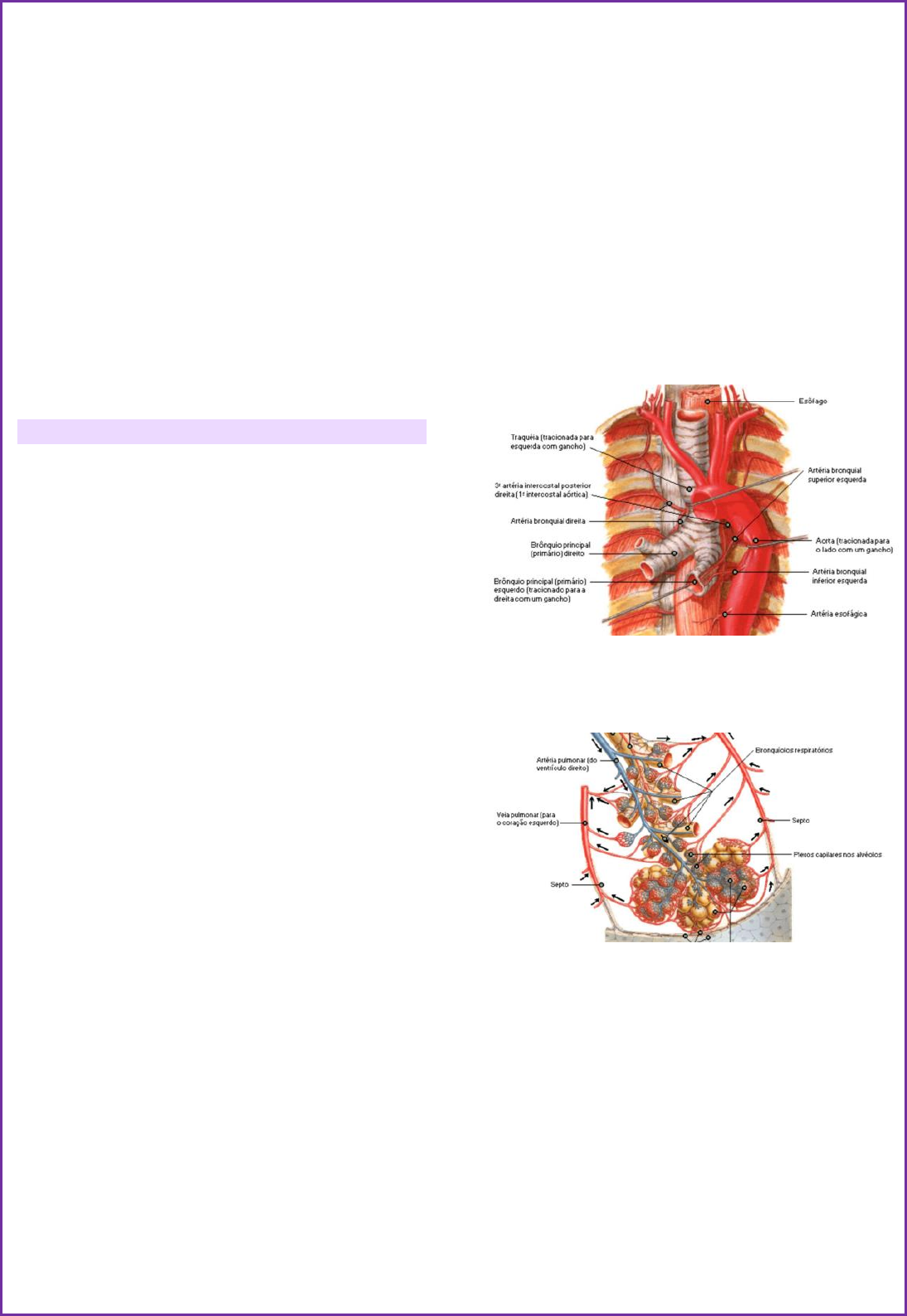 Hemoptise Definição → É o sangramento proveniente da árvore traqueobrônquica ou pulmões, sendo exteriorizado através da tosse → Escarro hemoptoico: Sangramentos em pequena quantidade misturado com secreção de aspecto mucoide (escarro) → Hemoptise: Sangramentos em maior quantidade exteriorizado através da tosse. Hemoptise maciça é um sangramento que ameaça a vida do paciente (100 a 600ml em 24 horas) Hemoptise maciça • Quando a perda sanguínea é suficiente para pôr a vida do paciente em risco • É uma emergência médica, associada a mortalidade de 30 a 50% • Mecanismo do óbito: asfixia do sangue (impede a ventilação), não é comum choque hipovolêmico • Antes do tratamento definitivo o risco de morte permanece, mesmo após cessado o episódio de sangramento, porque a recidiva de hemoptise é imprevisível Anatomia Pulmonar → Sangue sai lado direito do coração → tronco da artéria pulmonar: sangue não oxigenado → alvéolos → troca gasosa → sistema venoso leva o sangue oxigenado → Então, diferente do resto do corpo a circulação predominante é a circulação de sangue não oxigenado → Os pulmões têm duplo sistema circulatório arterial – nutrem traqueia, brônquios, linfonodos regionais, pleura visceral e esôfago: Artérias pulmonares: 99% da circulação (raro para hemoptise) Artérias brônquicas: 1% da circulação (mais comum) → Padrão: um tronco intercostobrônquico à direita e 1 ou 2 artérias brônquicas à esquerda → As artérias costumam se originar da aorta ao nível de T5 e T6, sendo consideradas anômalas as originadas em outros níveis – variações anatômicas são comuns (8-35%) → As artérias brônquicas são ramos da aorta e das artérias intercostais (que irrigam os brônquios) → Fazem parte da circulação de suporte pulmonar e não tem função de trocas gasosas a nível dos alvéolos, como acontece nos ramos das artérias pulmonares → Os ramos das artérias brônquicas acompanham a árvore brônquica até os bronquíolos respiratórios, aonde se anastomosam com pequenos ramos das artérias pulmonares → Circulação do tronco da pulmonar: artéria com sangue não oxigenado → hematose ao nível dos alvéolos → sai o sangue oxigenado pelas veias Fisiopatologia → 95% das hemoptises são de origem da circulação BRÔNQUICA e 5% da circulação PULMONAR → O pulmão é perfundido por sangue desoxigenado das artérias pulmonares sob baixas pressões (12-16mmHg) → E recebe sangue oxigenado das artérias brônquicas sob pressões sistêmicas (100mmHg → essa variação de pressão que vai favorecer o paciente de ter quadros de sangramento) → Inflamação, Hipóxia, Neoplasia ou Trauma → estimulam fatores de crescimento endotelial e angiopoetina I → proliferação vascular brônquica (paredes finas e frágeis: mais susceptíveis ao sangramento) → expostos a variação de pressão → aumento de PA → Hemoptise Manifestações Clínicas → Sangramento em grande quantidade exteriorizado pela tosse → Diferenciar entre hemoptise, epistaxe (sangramento nasal) ou hematêmese (vômito com sangue) → diferenciar a fonte do sangramento → Boa forma de diferenciar é perguntar sobre tosse associada, quantidade de sangue, presença de vômito... → Anamnese completa (história pregressa, ocupacional), exame físico completo avaliando sinais e sintomas Causas Intrapulmonares → Lesão direta do parênquima pulmonar com hemorragia alveolar → Pode ocorrer por fratura de arcos costais, tórax instável ou trauma fechado → Lesão pulmonar de variado grau e manifestações clínicas → Apresenta dispneia e hipoxemia – grau variado → Abordagem: Intubação, suporte de oxigênio e fluidos → Potencialmente letal 1) Raio-x de tórax com infiltrado, atenuação grande dos dois lados do pulmão, ali que está a área da contusão pulmonar. 2) Exemplo de infiltrado difuso. 3) Tomografia onde é possível ver as imagens de vidro fosco que são sugestivas de sangramento alveolar por conta da contusão, e embaixo o pulmão terminou mais cedo pois tem um derrame pleural → Dilatação anormal dos brônquios – perdem sua função → Acúmulo de secreção → piora o transporte mucociliar → dificuldade de expectorar → Pode causar lesões que serão a origem do sangramento → Principais causas: pós infecção (pneumonia), tuberculose e fibrose cística (jovens/crianças) → No Brasil, são notificados aprox. 70 mil novos casos e 4,5 mil mortes por ano → Cavitação é a causa mais comum de hemoptise → Tanto doença em atividade quando sequela pós infecciosa → sangramento → Começa uma nodulação, um processo infeccioso incipiente, e vai espalhando, conforme demora o diagnostico essa pneumonia vai se espalhando e pode ter um comprometimento muito extenso pulmonar. → Os achados clássicos são as cavidades, nodulações em aspecto de arvore em brotamento → Pulmão opaco → Áreas aéreas dentro do pulmão → Dentro do pulmão há conteúdo destrutivo – com necrose, desbridas → Câncer de Pulmão → Câncer de Traqueia / Brônquios → Geralmente o sangramento é relacionado à erosão da mucosa brônquica → Diagnóstico através de biópsia (imagem é complementar) → Oclusão arterial periférica pulmonar → aumento da pressão brônquica → aporte extravasa o leito vascular → edema, congestão e hemorragia → Isquemia; estase trombótica do sangue; lesão do endotélio capilar e necrose → necrose de paredes alveolares → infarto pulmonar → hemorragia (alguns dias após o evento inicial) → Dispneia, dor localizada, hipoxemia e hemoptise (alerta, pois o quadro pode estar avançado) → Tomografia com contraste → falha de enchimento → Síndromes hemorrágicas pulmonares → Geralmente o paciente vai apresentar infiltrados pulmonares bilaterais, queda do nível de hemoglobina e hipoxemia → Causas: vasculites, coagulopatias, colagenoses ou doenças 