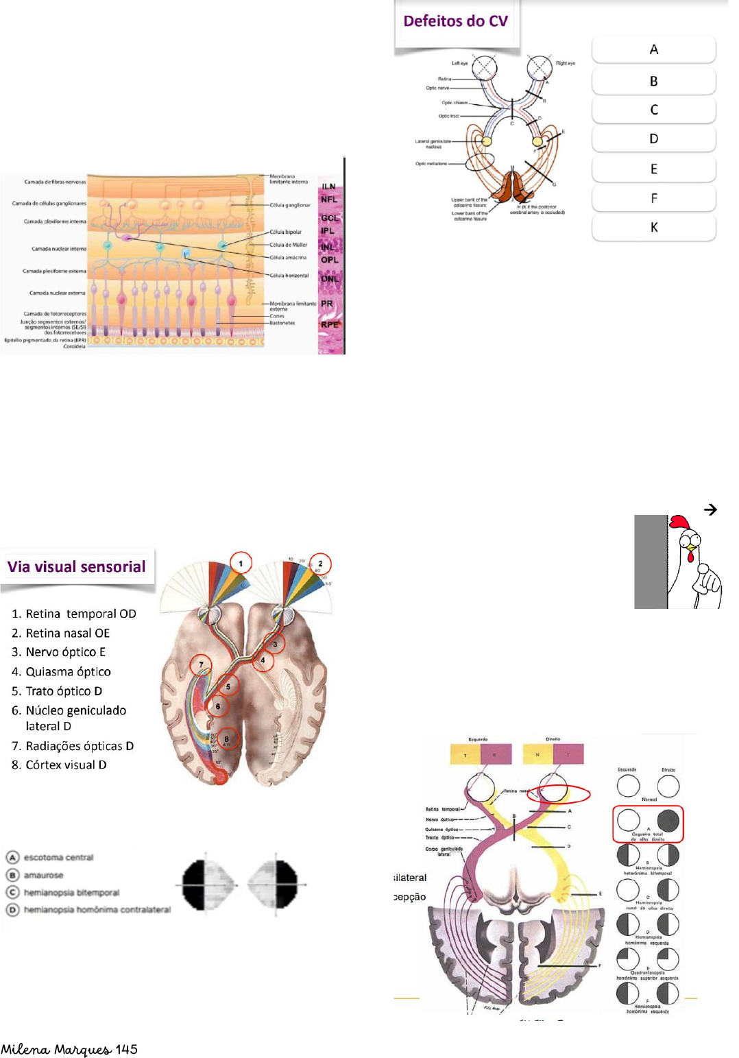 Milena Marques 145 Tópicos em Neurooftamologia Introdução – Objetivos: • Revisar anatomia da retina e via sensorial • Anomalias do campo visual • Principais defeitos pupilares • Neuropatias opticas Anatomia básica: A via sensorial inicia pelo transdutor da luz para um sinal elétrico-químico que é a Retina. A retina é dividida em 10 camadas com 3 grupos celulares que são células do neuro ectoderma. Cones e bastonetes (mais externo), células ganglionares (células com axônios longos que caminham ao longo das camadas da retina) e células bipolares (células de conexão). Via visual sensorial: Anomalias do campo visual: A – Lesão que atinge a mácula: Escotoma da região afetada (se atinge a mácula vai levar a BAV) B – Lesão no nervo óptico: perda visual monocular do lado comprometido. C – Lesão no quiasma optico: hemianopsia heterônima bitemporal. D – Lesão no trato óptico: Hemianopsia homônima esquerda (contralateral a lesão) ➔ porque atinge as fibras da retina temporal direito e retina nasal esquerda. E e F– Lesão nas radiações opticas → conceito importante para a prova!! • Superior (lesão do lobo parietal) – quadrantopsia homônima inferior esquerda (contralateral a lesão) • Inferior (lesão do lobo temporal) – quadrantopsia homônima superior esquerda (contralateral a lesão) K – Lesão no córtex occipital – hemianopsia homônima esquerda sem baixa visual. Milena Marques 145 Defeitos pupilares: A área do núcleo geniculado lateral (NGL) é o responsável pela percepção visual das vias anteriormente aprendidas, já a miose e a acomodação estão presentes na área pré-tectal (região do mesencéfalo) 1 – Reflexo fotomotor: Existe uma via aferente que segue pelo nervo optico (bilateralmente ao estímulo de apenas um olho) fazendo conexão com a área pré-tectal e com conexão com núcleo Edinger-Westphal. A via eferente que vai percorrer uma via parassimpática ao lado do III nervo (oculomotor) para fazer conexão no gânglio ciliar, penetrando na orbita por meio dos nervos ciliares posteriores longos fazendo conexão com o corpo ciliar e a íris (fibras parassimpáticas) 2 – Defeito pupilar aferente • Verificar a integridade do nervo óptico • Em um ambiente com iluminação difusa o normal é a pupila esta com o tamanho de 4-5 mm e ao estimular com luz uma via aferente integra os dois olhos tendem a contrair. • Se existir uma lesão na via aferente, ao estimular o olho com essa via prejudicada o olho estimulado não iria contrair e o contralateral também não. 3 – Resposta de aproximação: Até os 40 anos o paciente normal tem a capacidade de acomodação, é a mesma via do reflexo fotomotor mas a via que está sendo estimulada é a do corpo ciliar, ao olhar para longe o músculo ciliar não está contraído (menor diâmetro anteroposterior) e ao focar em uma imagem para perto, ele vai contrair e o cristalino vai ficar com um maior diâmetro anteroposterior; Milena Marques 145 1 – Pupila tônica de adie • Lesão no parassimpático – midríase do olho afetado • Normalmente unilateral • Jovem, sem queixas • Causas: o Herpes (infecção viral com comprometimento do gânglio ciliar, que tem resolução espontânea) o Outras causas: aneurisma, tumor, foto coagulação da retina (iatrogênica) o Necessário neuroimagem • Alterações presentes: RFM – ao iluminar o RFM direto não esta presente e o olho está em midríase e o RFM consensual estra presente em miose Acomodação – ocorre miose do olho contralateral e midríase no olho afetado mesmo sobre o foco próximo Teste da pilocarpina – parassimpaticomimético que ao ser colocado no olho afetado o olho promove miose (o parassimpático está presente, mas o gânglio que o estimula foi lesado) Via simpática pupilar: Possui três células importantes com origem no hipotálamo, que vai passar por toda o TC e ao chegar entre medula cervical e torácica vai fazer conexão com o centro cilioespinhal de Budge C8-T2, ascendem para fazer conexão com o gânglio cervical superior. 2 – Síndrome de Horner: • Lesão no simpático promovendo miose e ptose (essa última devido a inervação simpática do músculo de Muller) • Pode afetar neurônio o 1 neurônio – AVC, Tumor, medula o 2 neurônios – TU pulmão, lesão do plexo braquial o 3 neurônios - lesão da carótida interna, tumor de base de crânio. Neuropatias ópticas: • Por hipertensão intracraniana • Inflamatória • Isquêmica não arterítica • Isquêmica arteritica • Nutricional 1 – Neuropatia óptica por HIC: • Aumento da PIC • Causas – neoplasias, inflamações, hematomas, fístulas vasculares ou pseudotumor • Bilateral • Papiledema por congestão do fluxo axonal • Sintomas: cefaleia, amaurose fugaz, diplopia e pregas retinianas • Exame da acuidade visual: área da mancha cega aumentada na AV Milena Marques 145 2 – Neuropatia óptica inflamatória: • Jovens/adultos jovens • Também chamada de neurite óptica • Geralmente unilateral • Associação com EM em 85%, pode ter causas infecções, autoimune e medicação • Em EM acomete mais mulheres 3:1 • Comprometimento retrobulbar ou papilite visto no fundo do olho. • Sintomas: dor a movimentação ocular, BAV subaguda, defeito pupilar aferente, discromatopsia (alteração de cores), escotoma central • Conduta: esteroides IV 4 – Neuropatia óptica isquêmica não arterítica: • Acomete mais idosos • Vasculopatias isquêmica – associada com HAS, DM, dislipidemias, Trombofilias (mais em jovens) • BAV súbita (característica importante) • Defeito altitudinal no campo visual • Conduta – tratamento da doença de base / uso de corticoide (controverso) 4 – Neuropatia óptica isquêmica arterítica • Mais comum é a arterite de células gigantes com presença de uma arterite granulomatosa necrotizante • Comprometimento do olho e de vários sistemas (vasos) • Acomete idos