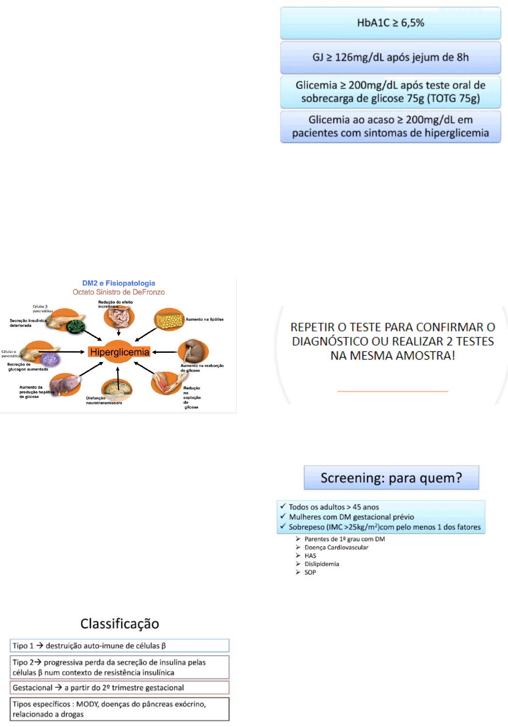 DIABETES MELLITUS TIPO 2 Acredita-se que o pâncreas até produz uma certa quantidade de insulina mas não suficiente devido a resistência insulínica. Ocorre uma exaustão pancreática, como também existem outros tipos de erros metabólicos. Existe uma redução da captação da glicose pelos músculos causando hiperglicemia. Ocorre baixa produção insulínica, pq o pâncreas sempre produz acima do basal dele a ponto de levar a exaustão. Defeito na produção incratinas pelas incretinas GLP1 que ajuda na metabolização e absorção de glicose, o que fica reduzido na DM2. O metabolismo é desviado para o metabolismo lipídico secreção aumentada pelo pâncreas de glucagon, aumento da reabsorção de glicose e redução da captação de glicose. Existe um defeito no rim para reabsorção de glicose. No cérebro vai ter umm defeito na absorção, defeito na lipólise. Defeito no fígado com auemtno hepático de glicose. Octeto de cromns (??) Defeito metaboliscos do diabetes. Alguns medicamentos estimulam o pâncreas, no intestino GLp1 é um análogo do hormônio que tem o efeito da incretina para reduzir a glicose. No musculo agem as glicasinas. As biguanidas são as que agem no fígado, as SGLT2 agem no rim excretando a glicose na urina. Glicemia de jejum maior que 126 Teste de tolerância a glicose maior que 200 – 75 g de glicose 2 h depois Glicada 6,5 Glicemia ao acaso maior que 200 com sintomas Todos precisam repetir, ou na mesma amostra se vierem compatíveis diagnóstico na hora e se tiver incompatível repetir em outra amostra. NÃO DOSAR INSULINA PARA DIABETES!!! Todos os adultos mais de 45 anos DM gestacional prévio Todos pacientes que tenham sobrepeso com ICM maior que 25 + doença cardiovascular+ SOP + parente de priemiro grau Pré diabetes Tudo é pré diabetes, glicemia alterada, teste alterado acima de 140 até 199 é pré diabetes, hemoglobina glicada alterada até 6,4 tbm. NÃO PRECISA REPETIR TESTE PARA CONFIRMAR PRÉ-DIABETES Aumento do risco de desenvolver Dm ao longo dos anos Risco de DM2 8-10% ano Complicações micro e macro vascular Maior risco de doenças cardiovasculares QUADRO CLINICO Os poli Perda de peso Fraqueza Visão turva Tendencia a infecções Complicações agudas: cetoacidose diabética, síndrome hiperglicêmica hiperosmolar Complicações crônicas: após alguém tempo de hiperglicemia Macrovasculares aterosclerose Microvasculares nefropatia, neuropatia, retinopatia TRATAMENTO DO PRÉ DM Mudança de estilo de vida X medicamentos Mudança de estilo de vida é para todo mundo · Tratamento não farmacológico Perda de 7% do peso corporal Atividade de amiro de 150 min por semana de moderada intensidade DPP estudo que mostra o risco com metformina comparando o uso do medicamento + mudança de estilo de vida e só a medicação Beneficio maior com maior ICM maior a redução da progressão do DM De 25 a 40 anos foram os que mais se beneficaram DG tem beneficio maior com metformina logo no inicio Farmacologico Metformina Abaixo dos 60 anos 850 MG 2 X POR DIA Objetivo de normalizar a glicemia Metformina é a mais barata e de graça indicada para iniciar o tratamento TRATAEMNTO DM2 Reduzir complicações micro e macro vasculares, n só deixar a glicemia perto do normal. È difícil de tratar, não tem sintomas. Controlar a glicada, lipide e controlar a PA adequada para reduzir as complicações micro e macro O alvo é atingir a hemoglobina glicada menor que 7 O controle rigoroso da glicemia auemtna muito o risco de hipoglicemia Se for idoso frágil pode ser um pouco maior essa glicada Tratamento Deita atividade física Medicamentos Sulfoniureisas Biguanidas Inibidores da alfa-glicosidade Glitazonas Inibidores da DPP4 Inibidores da SGlT2 Incretina s Insulinas dietas Tipo de carboidratos Evitar dietas low carb Minimizar gorduras trans Perda de peso quando IMC maior que 25% restringir a ingesta de calorias Usar adoenças mas n ultrapassar a recomendação Vale a pena restringir muito a glicemia? N]ão, os estudos mostraram que apenas em dm recém diagnóstico é melhor benéfico restringir o controle glicêmico – aqui pode reduzir as complicações micro e macro vasculares a longo do tempo Mas avaliando no geral o controle da glicemia não é benéfico pelo risco de hipoglicemia MONITORIZAÇÃO DA GLICCEMIA O pciente do Dm2 n precisa medir em vários horários todos os dias, é um pouco mais tranquilo Pq ele produz insulina e tem menos risco de hipoglicemia È indicada a HB glicada ao emnos 2X por ano em pacientes bem controlados Em 3m para ajustes de tratamento Teste de glicemia capilar Monitorização de glicose insterticial – libre mede sozinho a glicose no subcutâneo Importante fazer a monitorização 2 x na semana antecedente a consulta. Glicadda avalia os últimos 3 meses Condições que alteram a hemoglobina glicana Insufiencia renal crônica Uso de álcool Hiperglicederemia Renal crônico tomar cuidado Monitorização glicemia capilar Maior ou menos testes de acordo com a progresso da doença Se tem ajuste de doses, recém diagnosticado, cirurgias, infecções mede mais vezes O paceitne que precisa de uso de insulina ai acrescenta mais horários antes de dormir, na madrugada Efeito somogy – hipoglicemia na madrugada e hiperglicemia pela manhã O sensor consegue captar no subcutâneo o que está próximo na glicemia no sangue Pacientes idosos, gravidez, sinais de hipoglicemia mas n conseguiu comprovar, DM refratários, datos inconsistentes – usar A meta é ficar 70% com controle DROGAS Mecanismo da Metformina É o mecamento mais utilizado É a priemira opção em quase todoso do guideslines Met é mais no fígado A glucosuria – SGLT2 Agem no intestino GLP1 e DPP4 Metformina mecanismo de ação Reduz a absorção de carboidratos, reduz Glifage Como prescrever? O Xr tem um reveestiemnto diferente que demora a fazer efeito mais protege mais dos efeitos colaterais E nunca começar na dose ideal, sempre na dose menor Xr tem na farmácia popu