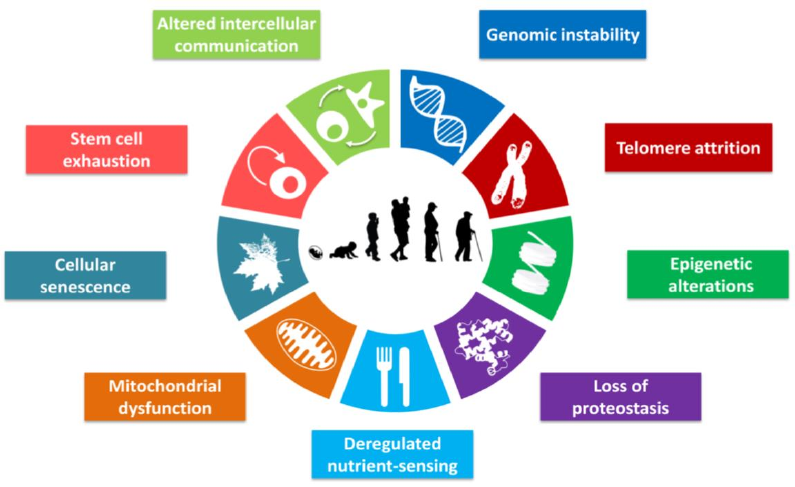 Explicar as bases biológicas e fisiológicas do envelhecimento ➜ Com o estudo do envelhecimento, tentaram identificar e categorizar as características celulares e moleculares do envelhecimento. ➜ Proporam 9 marcas que geralmente são consideradas como contribuintes para o processo de envelhecimento e, juntas, determinam seu fenótipo. Cada "marca" deve cumprir os seguintes critérios: (I) deve se manifestar durante o envelhecimento normal; (II) seu agravamento experimental deve acelerar o envelhecimento; (III) sua melhoria experimental deve retardar o processo normal de envelhecimento e, aumentar a vida útil saudável. ➜ Essas marcas são: instabilidade genômica, atrito de telômeros, alterações epigenéticas, perda de proteostase, desregulação de nutrientes, disfunção mitocondrial, senescência celular, exaustão de células-tronco e alteração da comunicação intracelular INSTABILIDADE GENÔMICA ➜ Um denominador comum do envelhecimento é o acúmulo de danos genéticos. Muitas doenças do envelhecimento prematuro, como síndrome de Werner e de Bloom, são consequência do aumento do acúmulo de danos ao DNA. ➜ Integridade e estabilidade do DNA são continuamente desafiadas por agentes físicos, químicos e biológicos exógenos, e endógenas, incluindo erros de replicação, reações hidrolíticas espontâneas e espécies reativas de oxigênio (ROS). ➜ As lesões genéticas decorrentes de danos extrínsecos ou intrínsecos são diversas e incluem mutações pontuais, translocações, ganhos e perdas cromossômicas, encurtamento de telômeros e interrupção gênica. Para minimizar essas lesões, os organismos desenvolveram uma rede complexa de mecanismos de reparo de DNA que são capazes de lidar com a maioria dos danos infligidos ao DNA nuclear. Os sistemas de estabilidade genômica também incluem mecanismos específicos para manter comprimento e funcionalidade apropriados dos telômeros e garantir integridade do DNA mitocondrial (mtDNA). Além dessas lesões diretas no DNA, defeitos na arquitetura nuclear, conhecidos como laminopatias, podem causar instabilidade do genoma e resultar em síndromes de envelhecimento prematuro DNA Nuclear � Mutações somáticas se acumulam dentro de células de humanos idosos. Outras formas de danos ao DNA, como aneuploidias cromossômicas e variações de número de cópias, também foram associadas a envelhecimento. Todas, podem afetar genes essenciais e vias transcricionais, resultando em células disfuncionais que se não eliminadas por apoptose/senescência, podem comprometer a homeostase do tecido e do organismo. Ainda mais relevante quando danos ao DNA afetam a competência funcional das células-tronco, comprometendo seu papel na renovação �Evidências para ligações propostas entre aumento ao longo da vida no dano genômico e envelhecimento surgiram mostrando que deficiências nos mecanismos de reparo de DNA causam envelhecimento acelerado em camundongos e estão subjacentes a várias síndromes progeroidianas humanas. Camundongos transgênicos que superexpressam BubR1 (ponto de verificação mitótico= segregação dos cromossomos) exibem maior proteção contra aneuploidia e câncer e prolonga a vida útil saudável. DNA mitocondrial � O mtDNA tem sido alvo para mutações somáticas associadas ao envelhecimento devido ao microambiente oxidativo das mitocôndrias, falta de histonas protetoras e eficiência limitada dos mecanismos de reparo do mtDNA �Devido a multiplicidade de genomas mitocondriais, permite coexistência de genomas mutantes e normais dentro da mesma célula (heteroplasma). No entanto, análises unicelulares revelaram que, apesar do baixo nível geral de mutações do mtDNA, a carga mutacional das células em envelhecimento individuais se torna significativa e pode atingir um estado de homoplasma (mutante domina o normal). A maioria das mutações de mtDNA em células adultas ou envelhecidas parece ser causada por erros de replicação no início da vida, e não por danos oxidativos. Arquitetura nuclear � Além dos danos genômicos que afetam o nuclear ou mtDNA, defeitos na lâmina nuclear também podem causar instabilidade do genoma, essas, participam da manutenção do genoma, fornecendo um andaime para amarrar complexos de cromatina e proteínas que regulam a estabilidade genômica. Mutações em genes que codificam componentes proteicos dessa estrutura, ou fatores que afetam sua maturação e dinâmica, causam síndromes de envelhecimento acelerado. Alterações da lâmina nuclear e produção de uma forma de prelamina A aberrante chamada progerina também foram detectadas durante o envelhecimento normal. ATRITO DE TELÔMEROS ➜ Acúmulo de danos ao DNA com a idade, afeta o genoma aleatoriamente, mas algumas regiões cromossômicas, como telômeros, são particularmente suscetíveis à deterioração relacionada à idade. As polimerases de DNA replicativas não têm capacidade de replicar completamente as extremidades terminais de moléculas lineares de DNA, função da telomerase. Mas, a maioria das células somáticas não expressa telomerase e isso leva à perda progressiva e cumulativa de sequências de proteção de telômeros das extremidades cromossômicas. A exaustão de telômero explica a capacidade proliferativa limitada de alguns tipos de células, chamada senescência replicativa. A expressão ectópica da telomerase é suficiente para imortalidade a células mortais, sem transformação oncogênica ➜ Telômeros podem ser considerados quebras de DNA que são tornadas invisíveis para maquinaria reparo de DNA através da formação de complexo especializado de nucleoproteína conhecido como shelterina. Não apenas telômeros são progressivamente encurtados na ausência de telomerase, mas, mesmo na presença, danos exógenos ao DNA às telômeros torna-se invisível para as máquinas de reparo devido à presença de shelterinas. Portanto, dano do DNA em telômeros causa