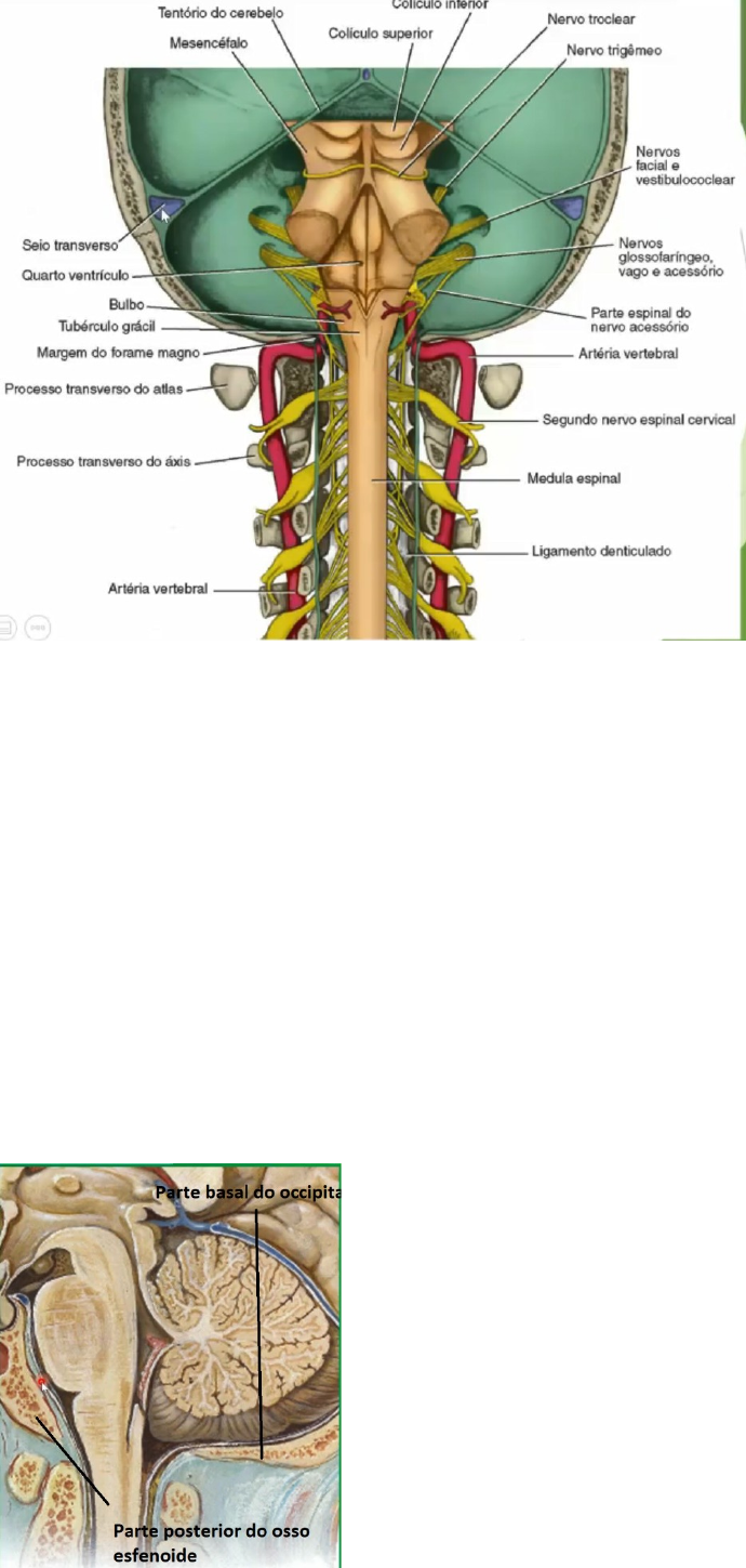 Bulbo A imagem mostra a fossa posterior do crânio. Vemos o TE na vista posterior. Nessa figura foi removido o cerebelo. Podemos observar o pedúnculo cerebelar médio, o pedúnculo cerebelar superior e o pedúnculo cerebelar inferior. Foi removido o cerebelo. Permitiu enxergar o IV ventrículo e seu assoalho que fica principalmente na parte posterior da ponte. Sabemos que a parte do assoalho do IV ventrículo é a ponte. Onde estão os colículos (lamina quadrigêmea) é o mesencéfalo. Logo abaixo da ponte, passando “quase”pelo forame occipital temos o bulbo. O Bulbo é a porção inicial da ME. Ou a porção final. O bulbo tem um limite superior muito claro sulco bulbo-pontino. O bulbo não tem um limite inferior muito claro pensamos que o limite inferior do bulbo É O PRIMEIRO NERVO CERVICAL QUE ESTÁ NA MARGEM DE C1. O bulbo vai até a parte espinal do nervo acessório (XI – par); O limite anatômico são as primeiras ramificações de C1. A ARTÉRIA VERTEBRAL TEM BASTANTE RELAÇÃO COM O BULBO!. A artéria vertebral segue subindo pelos forames interventebrais, tem uma porção que dá uma volta no ATLAS e vai ter uma porção cerebral que entra pelo forame magno e vai ter relação com o bulbo. O BULBO VAI TER BASTANTE RELAÇÃO COM A ARTÉRIA VERTEBRAL. GENERALIDADES O bulbo situa-se sobre a parte basal do osso occipital. Perceber que os ossos que formam a base do crânio tem bastante relação com o Tronco encefálico (Bulbo, ponte, mesencéfalo). OS OSSOS SÃO OSSO ESFENOIDE E OCCIPITAL. O TRONCO ENCEFALICO SE EXTENDE DA MEDULA ATÉ O DIENCEFALO. O TE é dividido em BULBO, PONTE e MESENCEFALO e é onde vamos encontrar os 10 pares de nervos cranianos. BULBO ANATOMIA EXTERNA •O limite inferior Forame magno ou o primeiro nervo cervical •O limite superior Sulco bulbo pontinho (sulco entre bulbo e ponte) ÁREA ANTERIOR: Sulcos que delimitam vão delimitar o bulbo: SÃO PRATICAMENTE OS MESMOS QUE SE ENCONTRAM NA MEDULA ESPINAL. TEMOS A FISSURA MEDIANA ANTERIOR conhecemos desde a medula espinal; O bulbo tem correspondência interna e externa com medula espinal, PRINCIPALMENTE NA PARTE BAIXA! FISSURA MEDIANA ANTERIOR TERMINA NO SULCO BULBO-PONTINO (NA VERDADE TEM O FORAME CEGO ALI – PONTO LIMITE DA FISSURA MEDIANA ANTERIOR). LATERALMENTE A FISSURA MEDIANA ANTERIOR TEMOS 2 MASSAS PIRAMIDE BULBAR. FICA ENTRE A FISSURA MEDIANA ANTERIOR, QUASE NO FINALZINHO DO FORAME CEGO. OBS: AS PIRAMIDES DEMARCAM A POSIÇÃO DO TRATO CORTICO-ESPINAL. ONDE ENCONTRAMOS AS PIRAMIDES ENCONTRAMOS O TRATO CORTICO-ESPINAL. Logo abaixo das pirâmides (aquelas proeminências em verde, em volta da fissura anterior), encontramos a decussação das pirâmides. NA ÁREA LATERAL: Temos o sulco lateral anterior QUE FICA ENTRE A PIRAMIDE E A OLIVA. Esse sulco é chamado de PRÉ-OLIVAR. Nesse sulco VAMOS ENCONTRAR OS FILAMENTOS RADICULARES DO NERVO HIPOGLOSSO. Que é o 12 par de nervo craniano. SULCO LATERAL POSTERIO PÓS OLIVAR TEM OS FILAMENTOS RADICULARES DO GLOSSOFARINGEO, E OS FILAMENTOS QUE FORMAM O NERVO VAGO. TAMBÉM ENCONTRAMOS A RAIZ CRANIANA DO NERVO ACESSÓRIO. Obs: nervo acessório tem uma raiz craniana e tem uma raiz espinal que é mais ventral; ÁREA POSTERIOR O bulbo não tem limite muito claro na face posteiror, mas podemos dizer que ele vai mais ou menos até o ponto em que vemos outras estruturas como nucleo do nervo vago e nervo hipoglosso. Então dizemos que na face posterior do bulbo ele tem uma face fechada que é onde vai estar entre as linhas azuis e a parte aberta que é a parte mais dorsal. Internamente sabemos o limite do bulbo que é onde começam as estruturas da ponte. Na face posterior, tem o sulco mediano posterior que é o mesmo da medula espinal. E TEMOS O SULCO INTERMÉDIO POSTERIOR (Aquele mesmo que separa o fascículo grácil do cuneiforme). OBS: ACIMA DO TORAX ALTO JÁ TMEOS O FASCICULO CUNEIFORME então teremos o sulco intermédio posterior dali pra cima. Temos o fascículo grácil na ME toda. Ambos os fascículos são divididos pelo sulco intermédio posterior que acaba no bulbo. Ele separa o fascículo grácil e cuneiforme. O FASCICULO GRÁCIL E CUNEIFORME TERMINA NO TUBERCULO GRÁCIL E NO TUBERCULO CUNEIFORME. ONDE ENCONTRAREMOS OS NUCLEOS GRÁCIL E CUNEIFORME. O que o fascículo grácil e cuneiforme faz? eles levam aferencia de PROPRIOCEPÇÃO DO TIPO CONSCIENTE E TATO EPICRÍTICO FINALIZAM ALI. Sulco lateral posterior também está ali Obs: no pedúnculo cerebelar inferior tem fibras aferentes ao cerebelo. ##CONSIDERAÇÕES INICIAIS: ESTRUTURA DO TRONCO ENCEFÁLICO No tronco encefálico como um todo vamos ENCONTRAR UMA SUBSTANCIA CINZENTA QUE É HOMOLOGA A DA MEDULA ESPINAL. EXISTEM ESTRUTURAS QUE TEM AS MESMAS CARACTERÍSTICAS DE POSIÇÃO DOS NUCLEOS MOTORES E DOS NUCLEOS SENSITIVOS QUE TEM UMA HOMOLOGIA A MEDULA ESPINAL. SÃO CHAMADOS DOS NUCLEOS DO NERVOS CRANIANOS ELES SÃO HOMOLOGOS A ESTRUTURA DA MEDULA ESPINAL. Existe uma substancia própria do TRONCO ENCEFÁLICO NÃO TEM RELAÇÃO COM OS NUCLEOS DO NERVOS CRANIANOS, MAS TEM RELAÇÃO COM OS OUTROS TRATOS. >> não tem relação com a substancia cinzenta da medula; Este possui a disposição que segue o plano geral do SNC. Geralmente os núcleos motores são mais anteriores enquanto que os sensitivos são mais posteriores (ISSO É UM PADRÃO). FORMAÇÃO RETICULAR vai preencher espaço entre núcleos (motores e sensitivos) e os tratos. A FORMAÇÃO RETICULAR É UMA ESTRUTURA COMPLEXA E TEM PARTICIPAÇÃO MUITO GRANDE EM REFLEXOS PRÓPRIOS DO TE. ALEM DISSO, ENCONTRAREMOS SUBSTANCIA BRANCA QUE TRAFEGA DE MODO DESCENDENE, ASCENDENTE OU PARA ASSOCIAÇÃO. Alguns tratos iniciam no TE e vao para região inferior ou superior ou tratos de outras regiões que vão passar pelo TE. TEM FIBRAS TRANSVERSAIS E LONGITUDINAIS. EX: O TRATO CORTICO-ESPINAL DESCE DO CORTEX MOTOR PRIMARIO ONDE TEM AS CELULAS PIRAMIDAIS GIGANTES E POSSUEM AXONIO QUE TRAFEGAM PELO PROSENCEFALO ATÉ CHEGAR NO TRONCO ENCEFALICO, NA ALTURA DO BULBO