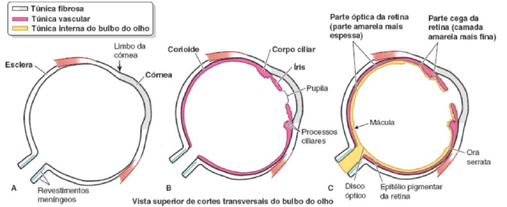 Descrever a anatomia e histologia do olho Bulbo do olho ➜ O bulbo do olho contém o aparelho óptico do sistema visual. Ocupa a maior parte da porção anterior da órbita, suspenso por 6 músculos extrínsecos que controlam seu movimento e por um aparelho suspensor da fáscia. Tem diâmetro aproximado de 25 mm. ➜ Todas as estruturas anatômicas no bulbo do olho têm disposição circular ou esférica. O bulbo do olho propriamente dito tem 3 túnicas; entretanto, há outra camada de tecido conjuntivo frouxo que circunda o bulbo do olho, sustentando-o dentro da órbita. A camada de tecido conjuntivo é composta pela bainha do bulbo do olho, que forma a verdadeira cavidade para o bulbo do olho, e pela túnica conjuntiva do bulbo. A bainha do bulbo do olho é a parte mais substancial do aparelho suspensor. Uma lâmina de tecido conjuntivo frouxo, o espaço episcleral situa-se entre a bainha do bulbo do olho e a túnica externa do bulbo do olho, facilitando os movimentos do bulbo do olho na bainha. ➜ As três túnicas do bulbo do olho são: Túnica fibrosa (camada externa), formada por esclera e córnea Túnica vascular (camada intermédia), formada por corioide, corpo ciliar e íris Túnica interna (camada interna), formada por retina, que tem partes óptica e não visual. TÚNICA FIBROSA DO BULBO DO OLHO ➜ A túnica fibrosa do bulbo do olho garante a forma e a resistência. A esclera é a parte opaca resistente da túnica fibrosa do bulbo do olho. É o local de inserção dos músculos extrínsecos (extraoculares) e intrínsecos do bulbo do olho. A parte anterior da esclera é visível através da túnica conjuntiva do bulbo transparente como “a parte branca do olho”. ➜ A córnea é a parte transparente da túnica fibrosa. A convexidade da córnea é maior do que a da esclera e, ela parece protrair-se do bulbo do olho quando vista lateralmente. ➜ As camadas diferem em termos da regularidade da organização das fibras colágenas e do grau de hidratação de cada uma. Enquanto a esclera é relativamente avascular, a córnea é totalmente avascular e nutrida por leitos capilares periféricos e líquidos existentes sobre suas faces externa e interna (líquido lacrimal e humor aquoso, respectivamente). O líquido lacrimal também provê oxigênio absorvido do ar. ➜ A córnea é muito sensível ao toque; sua inervação é realizada pelo nervo oftálmico. Mesmo corpos estranhos muito pequenos (partículas de poeira) levam a pessoa a piscar, ao fluxo de lágrimas e, às vezes, à dor intensa. Sua nutrição provém dos leitos capilares em sua periferia, o humor aquoso e o líquido lacrimal. O líquido lacrimal também provê oxigênio absorvido do ar. O ressecamento da superfície da córnea pode causar ulceração. ➜ O limbo da córnea é o ângulo formado pela interseção das curvaturas da esclera e da córnea na junção corneoescleral. A junção é um círculo translúcido, cinza, com 1 mm de largura que inclui várias alças capilares que participam da nutrição da córnea avascular. TÚNICA VASCULAR DO BULBO DO OLHO ➜ A túnica vascular do bulbo do olho (úvea) é formada pela corioide, corpo ciliar e íris. A corioide, uma camada marrom-avermelhada escura, está situada entre esclera e a retina. Forma a maior parte da túnica vascular do bulbo do olho e reveste a maior parte da esclera. Nesse leito vascular denso, os vasos maiores estão localizados externamente. Os vasos mais finos são mais internos, adjacentes à camada fotossensível avascular da retina, que supre com oxigênio e nutrientes. A corioide é ingurgitada com sangue, é responsável pelos “olhos com reflexo vermelho” observados em fotografias com flash. A corioide insere-se firmemente no estrato pigmentoso da retina, mas pode ser arrancada da esclera com facilidade. A corioide é contínua anteriormente com o corpo ciliar ➜ O corpo ciliar é um espessamento anular da camada posterior ao limbo da córnea, que é muscular e vascular. Une a corioide à circunferência da íris. Pregas na face interna do corpo ciliar, os processos ciliares, secretam humor aquoso. O humor aquoso, um líquido transparente, ocupa o segmento anterior do bulbo do olho, o interior do bulbo anterior à lente, ao ligamento suspensor e ao corpo ciliar. ➜ A íris, é um diafragma contrátil fino com uma abertura central, a pupila, para dar passagem à luz. Quando uma pessoa está acordada, o tamanho da pupila varia continuamente para controlar a luz que entra no olho. Dois músculos controlam o tamanho da pupila: esfíncter da pupila circular, estimulado pelo sistema parassimpático, diminui seu diâmetro (miose pupilar), e o músculo dilatador da pupila, radial e estimulado pelo sistema simpático, aumenta seu diâmetro (dilata a pupila). As respostas parassimpáticas costumam ser mais lentas do que as respostas simpáticas, porém a constrição pupilar estimulada pelo sistema parassimpático normalmente é imediata. TÚNICA INTERNA DO BULBO DO OLHO ➜ A túnica interna do bulbo do olho é a retina. É a camada neural sensitiva do bulbo do olho. Macroscopicamente, é formada por 2 partes funcionais com localizações distintas: parte óptica e parte cega. A parte óptica da retina é sensível aos raios luminosos visuais e tem dois estratos: estrato nervoso estrato pigmentoso. O estrato nervoso é sensível à luz. O estrato pigmentoso é formado por uma camada de células, que reforça a propriedade de absorção da luz pela corioide para reduzir a dispersão da luz no bulbo do olho. A parte cega da retina é uma continuação anterior do estrato pigmentoso e uma camada de células de sustentação. A parte cega da retina estende-se sobre o corpo ciliar (parte ciliar) e a face posterior da íris (parte irídica) até a margem pupilar. ➜ Clinicamente, a face interna da parte posterior do bulbo do olho, onde é focalizada a luz que entra no bulbo do olho, é denominada fundo do olho. A retina do fundo inclui uma áre
