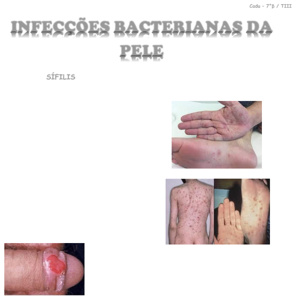 Cadu – 7°β / TIII SÍFILIS • IST causada pela espiroqueta Treponema pallidum. PRIMÁRIA - Cancro duro. - Sem tratamento, resolução em 1 – 8 semanas sem cicatriz. - 10 – 90 dias pós infecção. • Pequena lesão ulcerada única. • Fundo limpo. • Bordas bem delimitadas. • Indolor. - DIAGNÓSTICOS DIFERENCIAIS • Cancro mole. • Carcinoma espinocelular. SECUNDÁRIA - 3 – 10 semanas pós infecção. - Disseminação bacteriana máxima. - Erupções difusas de pele e mucosa. • Pequenas placas vermelho – pálidas com fina descamação. - Roséola sifilítica. • Sem prurido. • Poliadenomegalia indolor. - DIAGNÓSTICO DIFERENCIAL • Pitiríase rósea. • Psoríase. • Farmacodermia. - LATENTE • Secundária não tratada. • Regressão espontânea das lesões. • Recente - < 1 ano de duração. • Tardia - > 1 ano de evolução. INFECÇÕES BACTERIANAS DA PELE Cadu – 7°β / TIII TERCIÁRIA • Placas e nódulos infiltrativos ulcerados. - Gomas sifilíticas. - DIAGNÓSTICOS DIFERENCIAIS • Hanseníase. • Leishmaniose. • Tumor de partes moles. • Carcinoma espinocelular e basocelular. DIAGNÓSTICO • Clínico. - LABORATÓRIO • Demonstração direta do agente etiológico - Exame de campo escuro. - Biópsia. • Sorologia - Teste não treponêmico: VDRL - Teste treponêmico: FTA – abs. TRATAMENTO - PRIMÁRIA, SECUNDÁRIA E LATENTE RECENTE • Penicilina benzatina 2,4 milhões UI, IM, dose única. - Metade em cada nádega. - TERCIÁRIA E NÃO SABE PERÍODO DE EVOLUÇÃO • Penicilina benzatina 2,4 milhões UI, IM, 3 doses, sendo 1 / semana. - Metade em cada nádega. SEGMENTO • VDRL quantitativo - Sucesso do tratamento: redução de 2 diluições em 3 meses e de 3 diluições em 6 meses após a conclusão do tratamento. - Cicatriz sorológica: VDRL não zera, mas apresenta títulos baixos. IMPETIGO - Infecção piogênica primária e superficial. • Staphylococcus aureus (principal) ou Streptococcus pyogenes. • Preferencialmente face e MMSS. • Comum na infância. NÃO BOLHOSO • Nariz, boca e extremidades. • Pele apresenta solução de continuidade para que ocorra a infecção. • Há o desenvolvimento de traumatismos locais. - APRESETAÇÃO CLÍNICA • Mácula eritematosa que evolui para bolha ou vesícula que rompe. • Crosta melicérica. Cadu – 7°β / TIII BOLHOSO • Face, períneo, nádegas e extremidades. • Não precisa de solução de continuidade para que ocorra infecção. - APRESENTAÇÃO CLÍNICA • Vesículas evoluem para bolhas grandes que pustulizam. • Crostas finas e acastanhadas. DIAGNÓSTICOS DIFERENCIAIS • Herpes simples. • Candidíase. • Dermatofitose. • Miliária. TRATAMENTO • Limpeza local com água e sabão. - Remoção da crosta. - LIMITADA E SEM SINAIS SISTÊMICOS • ATB tópico. - Mupirocina pomada 2%. - Ác. fusídico. - LESÕES MÚLTIPLAS E / OU SINAIS SISTÊMICOS • Penicilina resistente à beta – lactamase. • Macrolídeos. • Cefalosporina de primeira ou segunda geração. FOLICULITE BACTERIANA - Infecção superficial ou profunda do folículo piloso. • S. aureus mais envolvido. FATORES PREDISPONENTES • Oclusão. • Fricção. • Lâminas. • Depilação. • Corticoide tópico. • Climas quentes e úmidos. • DM. TRATAMENTO • Limpeza. - Clorexidina ou triclosan. • Pomada antibacteriana. - Mupirocina ou bacitracina. • Epilação com laser. ABSCESSO, FURÚNCULO E CARBÚNCULO • S. aureus. FURÚNCULOS - Infecção do folículo piloso e do tecido circundante. • Nódulo eritematoso e doloroso. Cadu – 7°β / TIII • Áreas pilosas. CARBÚNCULOS • Quando furúnculos se conectam profundamente e disseminam. ABSCESSOS • Coleção maior e mais profunda de pus em uma cavidade. - FATORES PREDISPONENTES • Portadores crônicos de S. aureus. • DM. • Obesidade. • Imunossupressão. • Higiene precária. TRATAMENTO • Cuidados locais. • Compressas mornas. • Drenagem, quando a lesão se tornar flutuante. • ATB. - Sistêmica quando furúnculo próximo a nariz, conduto auditivo, lesões grandes e recorrentes ou não responsiva aos cuidados locais. ERISIPELA • Infecção aguda da derme com comprometimento linfático. - Mais comum nos MMII. • S. pyogenes. APRESENTAÇÃO CLÍNICA • Placa eritematosa bem delimitada. • Edema doloroso. • Febre. • Mal estar. • Calafrios. DIAGNÓSTICOS DIFERENCIAIS • TVP. • Tromboflebite. TRATAMENTO • Penicilina. - 10 – 14 dias. • Macrolídeos. - Quando alergia à penicilina. CELULITE • Infecção profunda da derme e do tecido subcutâneo. • S. pyogenes e S. aureus. APRESENTAÇÃO CLÍNICA • Eritema sem delimitação. Cadu – 7°β / TIII • Área endurecida. • Sinais flogísticos. DIAGNÓSTICOS DIFERENCIAIS • Tromboflebite. • Angioedema. TRATAMENTO • Antibioticoterapia. - Penicilina. - Cefalosporina.