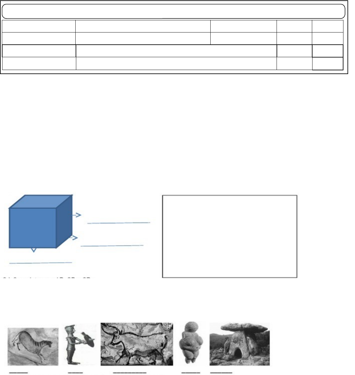 COLÉGIO ESTADUAL _________________ENSINO FUNDAMENTAL E MÉDIO DISCIPLINA PROFESSOR(A) RECUPERAÇÃO SÉRIE VALOR ARTE 7º ALUNO (A) Nº NOTA 2º TRIMESTRE ARTE TRIDIMENSIONAL 1- COMPLETE AS LACUNAS Algo bidimensional recebe este nome por possuir apenas ________ dimensões: comprimento e largura. Já os elementos tridimensionais, recebe este nome por possuir ________ dimensões: largura, comprimento e profundidade. 2- Preencha corretamente com o nome das dimensões que formam um objeto Tridimensional e depois desenhe dentro do quadro este mesmo cubo. 3- Um dos períodos mais fascinantes da história humana é a Pré-história. Classifique as imagens quanto as dimensões: Bidimensional ou Tridimensional.