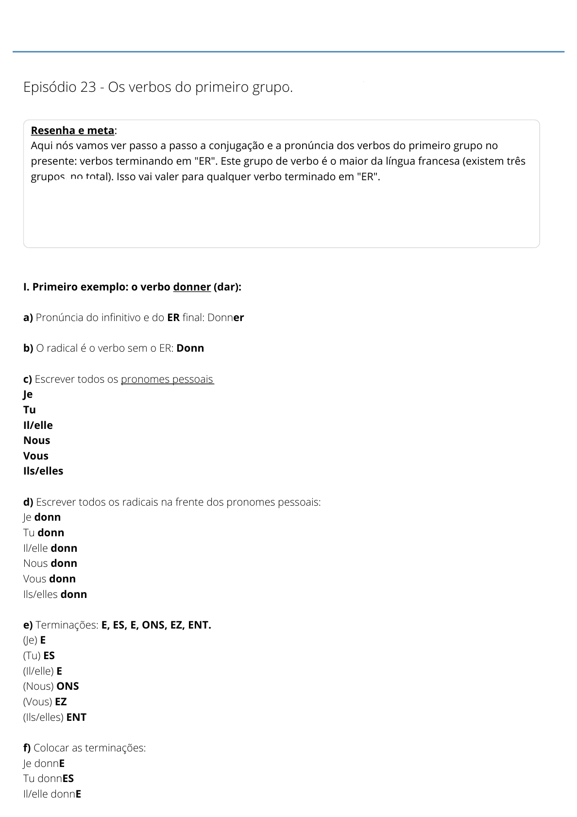 Episódio 23 - Os verbos do primeiro grupo. "Carré VIP" Resenha e meta: Aqui nós vamos ver passo a passo a conjugação e a pronúncia dos verbos do primeiro grupo no presente: verbos terminando em "ER". Este grupo de verbo é o maior da língua francesa (existem três grupos, no total). Isso vai valer para qualquer verbo terminado em "ER". I. Primeiro exemplo: o verbo donner (dar): a) Pronúncia do in眷nitivo e do ER 眷nal: Donner b) O radical é o verbo sem o ER: Donn c) Escrever todos os pronomes pessoais (/licao-01-os-pronomes-pessoais.html): Je Tu Il/elle Nous Vous Ils/elles d) Escrever todos os radicais na frente dos pronomes pessoais: Je donn Tu donn Il/elle donn Nous donn Vous donn Ils/elles donn e) Terminações: E, ES, E, ONS, EZ, ENT. (Je) E (Tu) ES (Il/elle) E (Nous) ONS (Vous) EZ (Ils/elles) ENT f) Colocar as terminações: Je donnE Tu donnES Il/elle donnE (http://www.franceszero.com.br) 00:00 / 17:23 Nous donnONS Vous donnEZ Ils/elles donnENT g) A pronúncia das terminações: Primeira pessoa do singular E │ Segunda pessoa do singular ES │MESMA PRONÚNCIA !!! Terceira pessoa do singular E │ Terceira pessoa do plural ENT │ Primeira pessoa do plural ONS Segunda pessoa do plural EZ (mesma pronúncia do VERBO NO INFINITIVO). h) Leitura do verbo Je donne Tu donnes Il/elle donne Nous donnons Vous donnez (mesma pronúncia do in眷nitivo). Ils/elles donnent (atenção: essa conjugação tem o mesmo som que as três primeiras). II. Segundo exemplo: o verbo rester (៍car): a) Pronúncia do in眷nitivo e do ER 眷nal: Rester b) O radical é o verbo sem o ER: rest c) Escrever todos os pronomes pessoais (/licao-01-os-pronomes-pessoais.html): Je Tu Il/elle Nous Vous Ils/elles d) Escrever todos os radicais na frente dos pronomes pessoais: Je rest Tu rest Il/elle rest Nous rest Vous rest Ils/elles rest e) Terminações: E, ES, E, ONS, EZ, ENT. (Je) E (Tu) ES (IL/elle) E (Nous) ONS (Vous) EZ (Ils/elles) ENT f) Colocar as terminações: Je restE Tu restES Il/elle restE Nous restONS Vous restEZ Ils/elles restENT g) Leitura do verbo Je reste Tu restes Il/elle reste Nous restons Vous restez (mesma pronúncia do in眷nitivo). Ils/elles restent(atenção: essa conjuagação tem o mesmo som que as três primeiras). PS: Na verdade existe uma única exceção: o verbo "aller". Ele termina em "ER", mas sua conjugação é completamente diferente. Fazer os 10 exercícios de retenção da matéria. (/00-verbos-do-primeiro-grupo-exercicio- 01.html) Imprimir (/23-os-verbos-do-primeiro-grupo/Print.html) Tirar dúvida Fazer tarefa Comentários Pessoas nesta conversa (/pro眷l e.html) Deixa suas dúvidas aqui, os professores irão te responder. Você pode também treinar sua pronúncia mandando sua gravação de voz pelo WhatsApp no +33 6 0250 0330.