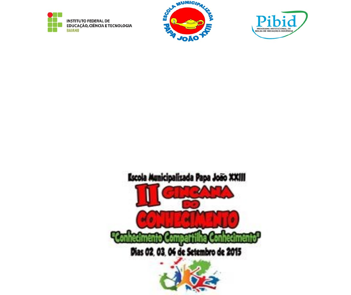 PROJETO DE INTERVENÇÃO: GINCANA DO CONHECIMENTO Santa Inês-Ba 2015 Ana Cristina S. Cavalcanti Cremilda Silva Santos Eduardo Santos de Souza Leandro Santos Rodrigues Maria Aparecida Mota dos Santos Manoelito Reis Nascimento Junior Thassio Vinicios da Silva Almeida Vanessa Souza Rotondano PROJETO DE INTERVENÇÃO- GINCANA DO CONHECIMENTO SANTA INÊS/BA 2015 TITULO Conhecimento Compartilha Conhecimento JUSTIFICATIVA Baseando-se em uma educação escolar focada nos pressupostos de que o aluno é o protagonista das ações, as quais proporcionam a construção do conhecimento, a Escola Municipalizada Papa João XXIII junto ao Programa Institucional de Bolsas de Iniciação à Docência – PIBID do Instituto Federal Baiano Campus – Santa Inês, propõem a realização da II GINCANA DO CONHECIMENTO. Esta ação visa atender ao Projeto Político Pedagógico da Escola, bem como, às orientações do projeto do PIBID, que tem como título: A formação do professor: (re) pensando a prática pedagógica em Geografia na educação básica em escolas do Vale do Jiquiriçá. Diante disso, acredita-se que a GINCANA DO CONHECIMENTO, tendo como tema: CONHECIMENTO COMPARTILHA CONHECIMENTO, ao contemplar o cotidiano do aluno, promoverá o conhecimento através de atividades lúdicas e jogos dotando-se das influências exercidas pelas novas tecnologias e seus objetos. Igualmente, tais atividades serão relevantes para que haja troca de experiências e socialização entre alunos, professores e demais colaboradores da escola, promovendo assim um ambiente de respeito, interação, integração e aprendizagem. As atividades propostas nesta ação visam atender aos seguintes objetivos: OBJETIVO GERAL Promover o conhecimento e socialização de saberes a partir da e revisão dos conteúdos estudados de forma lúdica contemplando a integração da comunidade escolar. OBJETIVOS ESPECÍFICOS Promover integração, união, diversão, entretenimento, companheirismo e espírito esportivo entre os participantes do evento; Oferecer desafios diferentes nos eventos de animação, com variadas provas que envolvem habilidades, criatividade, raciocínio, agilidade, conhecimento, estratégia e baseando nos quatro pilares da educação: a) Aprender a ser; b) Aprender a conhecer; c) Aprender a conviver; d) Aprender a fazer; Integrar os alunos, professores e equipe pedagógica; Despertar o espírito de competição sadia; Avaliar os alunos de forma interdisciplinar. INTERVENÇÃO JUNTO AOS PROFESSORES E DEMAIS INTEGRANTES DA COMUNIDADE ESCOLAR: Sensibilizar o grupo sobre a questão das drogas em sua vida, na sala de aula, na escola e arredores. Ajudar o grupo a repensar sua atitude no dia-a-dia, reconhecendo a importância da escola como um espaço de formação humana. Participar de ações educativas que visam melhorar o comportamento de todos com relação à diversidade. Facilitar a percepção do grupo acerca de mitos e preconceitos. Sensibilizá-los para a participação direta da família na escola mantendo uma relação que possibilite a realização de uma educação de qualidade. PUBLICO ALVO Todas as turmas do Ensino fundamental II DATA DE REALIZAÇÃO: 02,03,04/09/2015 PARTICIPAÇÃO: Pibidianos Coordenador/Diretor Comunidade no geral RECURSOS Jogos educativos diversos; vários tipos de papeis; Caixa de som/microfone; Materiais recicláveis; Troféus. RESULTADOS ESPERADOS A integração dos participantes, o aprendizado com as provas aplicadas e a contribuição junto à sociedade. REGULAMENTO PROJETO DE INTERVENÇÃO- GINCANA DO CONHECIMENTO Baseando-se em uma educação escolar focada nos pressupostos de que o aluno é o protagonista das ações, as quais proporcionam a construção do conhecimento, a Escola Municipalizada Papa João XXIII junto ao Programa Institucional de Bolsas de Iniciação à Docência – PIBID do Instituto Federal Baiano Campus – Santa Inês, propõem a realização da II GINCANA DO CONHECIMENTO. Esta ação visa atender ao Projeto Político Pedagógico da Escola, bem como, às orientações do projeto do PIBID, que tem como título: A formação do professor: (re) pensando a prática pedagógica em Geografia na educação básica em escolas do Vale do Jiquiriçá. Diante disso, acredita-se que a GINCANA DO CONHECIMENTO, tendo como tema: CONHECIMENTO COMPARTILHA CONHECIMENTO, ao contemplar o cotidiano do aluno, promoverá o conhecimento através de atividades lúdicas e jogos dotando-se das influências exercidas pelas novas tecnologias e seus objetos. Igualmente, tais atividades serão relevantes para que haja troca de experiências e socialização entre alunos, professores e demais colaboradores da escola, promovendo assim um ambiente de respeito, interação, integração e aprendizagem. 1. DISPOSIÇÕES GERAIS Este documento dispõe sobre os critérios e regulamentação da GINCANA DO CONHECIMENTO, tendo como tema: CONHECIMENTO COMPARTILHA CONHECIMENTO, a ser realizada entre os dias 2,3 e 4 de setembro de 2015. 1.1 - Este Regulamentofoi elaborado pela equipe coordenadora desta gincana, especialmente instituída pela direção da escola. O mesmo será publicado no mural da escola e em sua página na rede social Facebook para que todos os envolvidos tenham ciência. 1.2 - Todas as pessoas que participarem do evento estarão sujeitas às condições deste Regulamento. 1.3 - Não serão aceitas alegações de desconhecimento deste documento, já que será dada a necessária e suficiente publicidade do mesmo, com o apoio imperioso das equipes. 1.4 - É de responsabilidade do coordenador e líder da equipe a ampla divulgação junto aos integrantes de sua equipe. 1.5 - O regulamento desta gincana deverá ser lido por todos os líderes na presença da equipe coordenadora e posteriormente assinado como forma de afirmação e concordância dos mesmos aos critérios estabelecidos. 1.6 - Ao concordarem com este regulamento as equipes se comprometerão a cumprir todos os critérios deste re