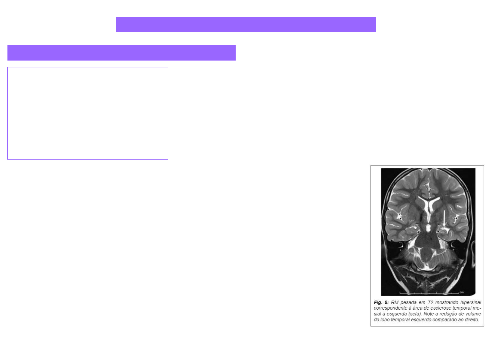 Isadora Pedreira- Problema 04 Fechamento. Módulo XX A Epilepsia do Lobo Temporal Mesial (ELTM) é um tipo de epilepsia focal que apresenta grande relevância clínica em razão de alta incidência e gravidade. Pacientes com ELTM apresentam crises focais simples ou complexas que se originam em estruturas mesiais do lobo temporal, geralmente precedidas por auras. Auras correspondem a manifestações sensitivo-sensoriais, vegetativas ou psíquicas puramente subjetivas e que ocorrem em 20% a 90% dos pacientes com epilepsia do lobo temporal. Em geral são de curta duração, não excedendo 1 ou 2 minutos. São exemplos: aura epigástrica (sensação de náusea, mal-estar); medo; depressão e angústia (frequentemente ocorre no período interictal mas pode ocorrer antes da crise); déjà-vu, jamais vu; e pensamento forçado (impressão de estar vivenciando algo que já aconteceu antes – déjà-vu, ou que parece totalmente estranho – jamais vu, ou pensamento que ocorre repetidamente mesmo quando se tenta concentrar em outro fato); alucinações gustativas, olfativas, auditivas, somestésicas e visuais. A epilepsia do lobo temporal (ELT) é a síndrome epiléptica parcial mais comumente diagnosticada em adultos. A síndrome da epilepsia mesial do lobo temporal (EMLT) se expressa por meio de crises epilépticas originadas em estruturas mesiais do lobo temporal, geralmente na formação hipocampal e, ocasionalmente, na amígdala. O substrato patológico mais comum da EMLT é a esclerose mesial temporal (EMT). Este pode ser visibilizado principalmente em cortes coronais de ressonância magnética do encéfalo, como atrofia hipocampal, hiperintensidade de sinal em FLAIR e T2 e perda da estrutura interna do hipocampo. Pacientes com EMLT e EMT têm probabilidade elevada de ter crises refratárias ao tratamento clínico e podem ser candidatos a tratamento cirúrgico; a EMLT associada à EMT constitui a indicação mais frequente de cirurgia de epilepsia em adolescentes e adultos. O tratamento cirúrgico – lobectomia temporal anterior (LTA) – é superior ao tratamento medicamentoso nos pacientes com EMLT, no que diz respeito ao controle de crises e à qualidade de vida É a principal causa de crise focal com alterações discognitivas. Apresenta uma lesão estrutural característica, evidenciada pela RM: esclerose do hipocampo (porção “mesial” do lobo temporal). O lobo temporal costuma ter seu volume globalmente reduzido. No EEG observa-se pontas epileptiformes na porção anterior do lobo temporal, uni ou bilateralmente. Exames de imagem funcionais (ex.: PET-scan, SPECT) revelam hipometabolismo e hipoperfusão na área de esclerose. Responde mal aos fármacos anticonvulsivantes, porém, pode ser CURADA por neurocirurgia, através da ressecção do foco das crises. A crise costuma ter um curso clínico estereotipado: inicialmente o paciente experimenta alguma forma de aura (crise focal não motora, p. ex.: desconforto epigástrico, sensação súbita e inexplicável de medo), para logo em seguida evoluir com parada comportamental, perda da consciência e amnésia anterógrada, podendo apresentar automatismos complexos nesse momento (ex.: Condutas e Tratamento para Epilepsia Esclerose Mesial Temporal • A doença epiléptica mais comum • Inicio na 2ª década de vida • História de crise febril • Crises focais perceptivas e disperceptivas • Sensação epigástrica ascendente, medo • Comprometimento da consciência com automatismos oroalimentares. Isadora Pedreira- Problema 04 Fechamento. Módulo XX expressão facial de emoções, correr, movimento de “pinçar” pequenos objetos com os dedos das mãos). Recobrada a consciência é comum haver desorientação pós-ictal. Se o foco estiver no lado dominante (geralmente o esquerdo), pode haver disfasia pós- ictal. A abordagem diagnóstica deve ser direcionada a partir de uma anamnese completa e dos exames clínico e neurológico realizados na chegada. A investigação deve ocorrer simultaneamente ao manejo terapêutico e, posteriormente, ser aprofundada após a estabilização clínica do paciente. Inicialmente poderão ser realizados exames laboratoriais como glicose, eletrólitos, gasometria, creatinina, nível sérico de medicação antiepiléptica, punção lombar, hemograma, plaquetas e exame qualitativo da urina. Após a estabilização do paciente, continua-se a abordagem diagnóstica com provas hepáticas, triagem toxicológica, eletroencefalograma (EEG) e exames de neuroimagem, como TC de crânio ou ressonância magnética de encéfalo. É importante ressaltar que cada caso deverá ser individualizado de acordo com o quadro clínico apresentado. A forma mais comum de crise convulsiva infantil é a apresentada em vigência de um quadro febril, e assim, não há necessidade de investigação extensa. Do mesmo modo, crianças com diagnóstico prévio de epilepsia e com uso de medicação anticonvulsivante normalmente dispensam investigação aprofundada. É de suma importância relembrar que a punção lombar só poderá ser realizada com o paciente já estabilizado e com os sinais vitais estáveis, sendo contraindicada quando houver suspeita de hipertensão intracraniana ou herniação cerebral, situações nas quais se faz necessária a realização prévia de TC de crânio. As crises convulsivas febris são as mais comuns, afetando 2 a 5% das crianças na faixa etária de 6 meses a 5 anos. Na maior parte dos casos ocorre um único episódio de apresentação benigna. Na crise convulsiva febril simples não é necessário solicitar EEG, exame de neuroimagem, eletrólitos, cálcio, fósforo, magnésio, hemograma ou glicemia. Se a crise convulsiva febril tornar-se recorrente ou prolongada, com duração maior que 5 minutos, é obrigatória a realização de investigação adicional para buscar a sua etiologia, iniciando o tratamento de forma semelhante às crises afebris. • Se houver sinais ou sintomas de meningite ou in