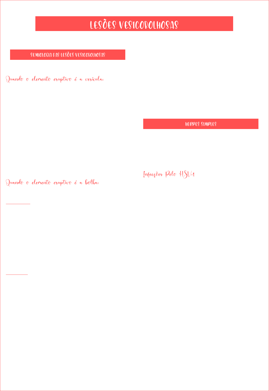 Isadora Pedreira. Módulo XXII. Problema 04 Intermed. • pruriginosas e inúmeras, confluentes, acompanhadas de eritema -eczema • com prurido discreto ou sensação de queimação, reunidas em pequenos aglomerados (em torno de 10 elementos) herpes simples • sem prurido, com hiperestesia e com disposição metamérica -herpes-zóster • erupção generalizada assestando-se em outra dermatose preexistente -erupção variceliforme de Kaposi • erupção aguda ao nível das regiões palmares e plantares - disidrose • erupção vesiculopustulosa acompanhada, em geral, de lesões eritematoescamosas sem prurido -psoríase pustulosa. Hereditária • bolhas tensas, sanguinolentas, em áreas de traumatismo- epidermólise bolhosa simples • idem, com involução atrófica e cistos epidérmicos - epidermólise bolhosa distrófica • idem, com êxito letal in utero ou até 4 meses de idade - epidermólise bolhosa letal • em bebês do sexo feminino, precedendo o aparecimento de lesões verrucosas ou hipercrômicas - incontinência pigmentar. Adquirida • bolhas não tensas (acantolíticas) com lesões de mucosa oral -pênfigo vulgar • bolhas rasas (acantolíticas), sem lesões orais e tendência ao estado foliáceo -pênfigo foliáceo • bolhas praticamente inaparentes; lesões eritematoescamosas em região centrofac ial, esternal e/ ou interescapular pênfigo eritematoso (Senear- Usher) • início por bolhas (acantolíticas) orais, com evolução para lesões vegetantes -pênfigo vegetante • vesículas, bolhas, placas urticadas e prurido - dermatite de Duhring-Brocq • bolhas tensas subepidérmicas, às vezes comprometendo a mucosa oral, em pessoas idosas - penfigoide bolhoso • vesículas, bolhas, lesões urticadas e prurido em gestantes herpes gestationis • bolhas tensas com formação sniequiante de mucosas (ocular, oral) -penfigoide cicatricial • lesões eritematopapulosas e vesiculobolhosas de morfologia variada, algumas em íris ou alvo - eritema multiforme. • lesões eritematopapulosas e vesiculobolhosas, com nitenso comprometimento de mucosas e estado geral grave - síndrome de Stevens-Johnson • bulose generalizada com intenso descolamento epidérmico (como grande queimado) - necrólise epidérmica tóxica. Há dois tipos de vírus herpes-simplex: tipo 1 (HSV-1), responsável principalmente por infecções na face e no tronco, e o tipo 2 (HSV-2), relacionado especialmente às infecções genitais. Entretanto, ambos podem infectar qualquer parte da pele ou das mucosas. A transmissão do HSV-1 é por contato pessoal, próximo ou íntimo. Por não resistir à secagem e à temperatura ambiente, a transmissão por fômites ou aerossol é difícil. Os indivíduos portadores do HSV-1 transmitem o vírus pela saliva ou qualquer outra secreção infectada, ou ainda pelo contato direto com as lesões. Cerca de 70% dos adultos com mais de 40 anos são soropositivos para o HSV-1 e muitos o excretam de forma intermitente na saliva ou secreções, mesmo quando assintomáticos. As partículas virais (vírions) penetram facilmente as mucosas e pequenas soluções de continuidade da pele (abrasões). Uma vez adquirido, o HSV- -1 penetra nas células da epiderme e derme, multiplicando-se e atingindo terminações nervosas locais. A maioria (cerca de 75% dos casos) não desenvolve sintomas e a infecção permanece subclínica. A principal característica do vírus é a sua persistência no organismo do hospedeiro: ele simplesmente não é eliminado. Ao invés disso, caminha pelos axônios neurais e ganha os corpos celulares dos neurônios do gânglio do trigêmio (gânglio de Nasser), onde o seu genoma permanece em estado latente incorporado no genoma celular. A qualquer momento, por mecanismos ainda não conhecidos, o vírus pode voltar a se replicar nos neurônios do gânglio e descer pelos nervos periféricos e terminações nervosas para novamente atingir a pele e causar lesões. As manifestações clínicas são distintas e estão relacionadas ao estado imunológico do paciente. Na primoinfecção herpética, pela imaturidade do sistema imunológico específico contra o vírus, as manifestações clínicas, quando ocorrem, são floridas e mais prolongadas. Na reativação herpética, o quadro clínico é mais brando, pelo uso da memória imunológica. Isadora Pedreira. Módulo XXII. Problema 04 Intermed. Embora o HSV-1 esteja mais relacionado à gengivoestomatite, ao herpes orolabial e ao herpes cutâneo, e o HSV-2 mais ao herpes genital, ambos os vírus podem causar qualquer das manifestações! O sexo oral é geralmente o responsável pelo herpes oral por HSV-2 e pelo herpes genital pelo HSV-1. Gengivoestomatite herpética (primoinfecção) Afeta principalmente crianças. O período de incubação entre a exposição e o aparecimento dos sintomas é de 3-10 dias (média de 6-8 dias). O quadro inicia-se abruptamente com febre alta, dor de garganta, mialgia, adenopatia cervical e aparecimento de lesões vesiculares dolorosas múltiplas envolvendo lábios, região perioral e cavidade bucal. As lesões clássicas do herpes simples são vesículas com base eritematosa que posteriormente podem se romper, evoluindo para pequenas lesões ulceradas, por vezes formando-se pequenas crostas. Pode haver acometimento do palato e da faringe, provocando dificuldade para deglutir alimentos e odinofagia. O principal diagnóstico diferencial é com a herpangina (enterovirose por coxsackie A que produz vesículas no palato, mas poupa a mucosa anterior da cavidade oral e a região labial). A síndrome do HSV-1 é autolimitada, durando cerca de 10- 14 dias, mas pode se estender por até seis semanas. A desidratação é uma complicação comum e deve ser evitada. Alguns quadros de primoinfecção herpética podem ser brandos, com poucas vesículas e sem febre ou comprometimento do estado geral. Herpes orolabial (reativação herpética) Esta forma é mais comum em adultos. Pode ser desencadeada 