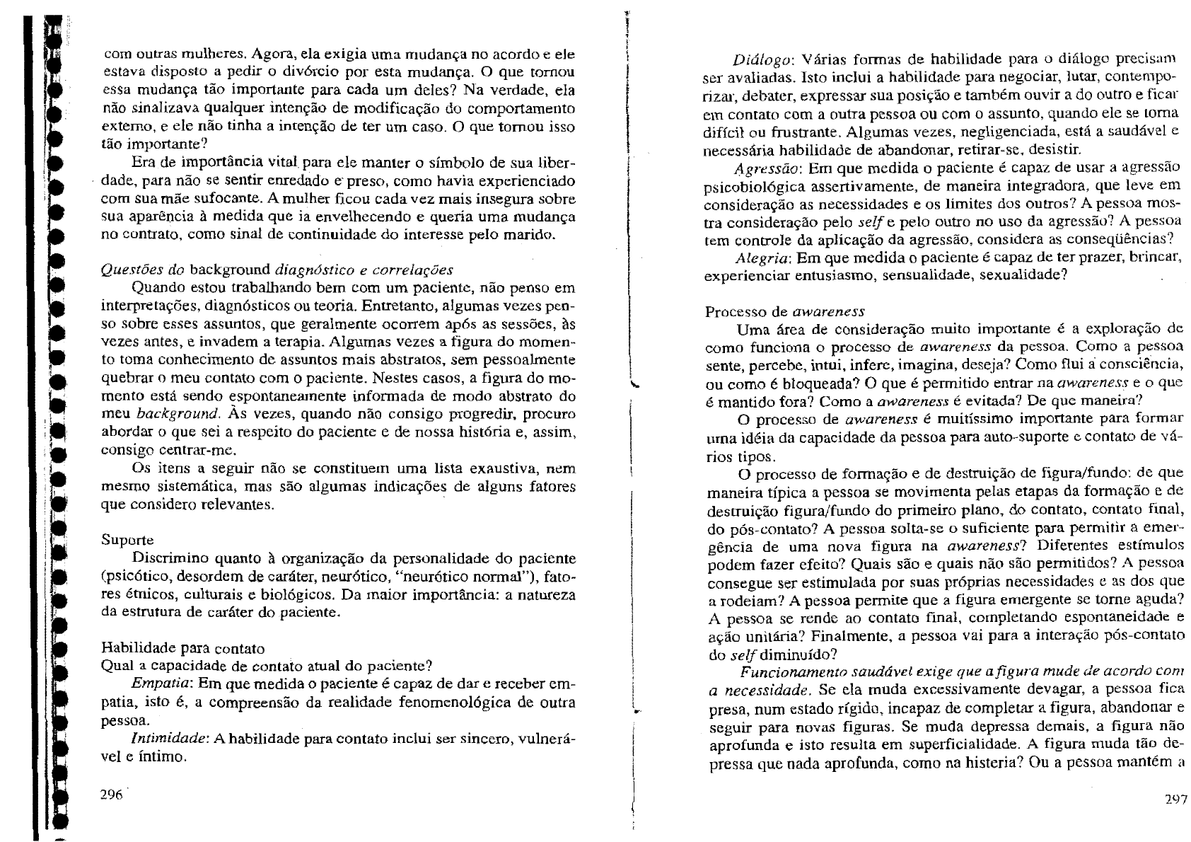 com outras mulheres. Agora, ela exigia uma mudança no acordo e ele estava disposto a pedir o divórcio por esta mudança. O que tornou essa mudança tão importante para cada um deles? Na verdade, ela não sinalizava qualquer intenção de modificação do comportamento externo, e ele não tinha a intenção de ter um caso. O que tomou isso tão importante? Era de importância vital. para ele manter o símbolo de sua liber- dade, para não se sentir enredado e· preso, como havia experienciado com sua mãe sufocante. A mulher ficou cada vez mais insegura sobre sua aparência à medida que ia envelhecendo e queria uma mudança no contrato, como sinal de continuidade do interesse pelo marido. Questões do background díagnóstico e correlações Quando estou trabalhando bem com um paciente, não penso em interpretações, diagnósticos ou teoria. Entretanto, algumas vezes pen- so sobre esses assuntos, que geralmente ocorrem após as sessões, às vezes antes, e invadem a terapia. Algumas vezes a figura do momen- to toma conhecimento de assuntos mais abstratos, sem pessoalmente quebrar o meu contato com o paciente. Nestes casos, a figura do mo- mento está sendo espontaneamente informada de modo abstrato do meu background. Às vezes, quando não consigo progredir, procuro abordar o que sei a respeito do paciente e de nossa história e, assim, consigo centrar-me. Os itens a seguir não se constituem uma lista exaustiva, nem mesmo sistemática, mas são algumas indicações de alguns fatores que considero relevantes. Suporte Discrimino quanto à organização da personalidade do paciente (psicótíco, desordem de caráter, neurótico, "neurótico normal"), fato- res étnicos, culturais e biológicos. Da maior importância: a natureza da estrutura de caráter do paciente. Habilidade para contato Qual a capacidade de contato atual do paciente? Empatia: Em que medida o paciente é capaz de dar e receber em- patia, isto é, a compreensão da realidade fenomenológica de outra pessoa. Intimidade: A habilidade para contato inclui ser sincero, vulnerá- vel e íntimo. 296 '!,' l 1 ! 1 ' l .... Diálogo: Várias formas de habilidade para o diálogo precisam ser avaliadas. Isto inclui a habílídade para negociar, lutar, contempo- rizar, debater, expressar sua posição e também ouvir a do outro e ficar em contato com a outra pessoa ou com o assunto, quando ele se toma difícil ou frustrante. Algumas vezes, negligenciada, está a saudável e necessária habilidade de abandonar, retirar-se, desistir. Agressão: Em que medida o paciente é capaz de usar a agressão psicobiológica assertivamente, de maneira integradora, que leve em consideração as necessidades e os limites dos outros? A pessoa mos- tra consideração pelo self e pelo outro no uso da agressão? A pessoa tem controle da aplicação da agressão, considera as conseqüências? Alegria: Em que medida o paciente é capaz de ter prazer, brincar, experienciar entusiasmo, sensualidade, sexualidade? . Processo de awareness Uma área de consideração muito importante é a exploração de como funciona o processo de awareness da pessoa. Como a pessoa sente, percebe, intui, infere, imagina, deseja? Como flui a consciência, ou como é bloqueada? O que é permitido entrar na awareness e o que é mantido fora? Corno a awareness é evitada? De que maneira? O processo de awareness é muitíssimo importante para formar uma idéia da capacidade da pessoa para auto-suporte e contato de vá- rios tipos. O processo de formação e de destruição de figura/fundo: _de que maneira típica a pessoa se movimenta pelas etapas da formaçao ~ de destruição figura/fundo do primeiro plano, do contato, co_n~ato fmal, do pós-contato? A pessoa solta-se o suficiente para perm1tlr a emer- gência de uma nova figura na awareness? Diferentes estímulos podem fazer efeito? Quais são e qua!s ~ão são p~rmitidos? A pessoa consegue ser estimulada por suas propnas necessidades e as dos que a rodeiam? A pessoa permite que a figura emergente se tome aguda? A pessoa se rende ao contato final, completando espontaneidade e ação unitária? Finalmente, a pessoa vai para a interação pós-contato do self diminuído? Funcionamento saudável exige que afigura mude de acordo com a necessidade. Se ela muda excessivamente devagar, a pessoa fica presa, num estado rígido, incapaz de completar a flg~ra, abandonar_ e seguir para novas figuras. Se muda depressa demais, a figm~ .. ª nao aprofunda e isto resulta em superficialidade. A figura muda ta°. de- pressa que nada aprofunda, como na histeria? Ou a pessoa mantem a 297 graciele bullerjan graciele bullerjan graciele bullerjan graciele bullerjan graciele bullerjan graciele bullerjan graciele bullerjan graciele bullerjan graciele bullerjan graciele bullerjan graciele bullerjan graciele bullerjan graciele bullerjan graciele bullerjan figura inalterada por tanto tempo que o contato final ou pós-contato é evitado? Habilidade de discriminar: A pessoa discrimina com precisão? Quão finamente? A pessoa discrimina apenas as categorias distintas ou-ou ( competente/necessitado; bom/mau; maravilhoso/porcaria?). Ou faz distinções tão sutis e deliberadas que não flui nenhuma ação? A pessoa consegue discriminar entre seus pais e seus outros signifi- cativos atuais? A pessoa sabe distinguir entre autoridade legítima e controle autoritário? Entre liberdade e abuso? Entre responsabilidade e culpa? Entre o saboroso, o insípido e o horrível? Entre importância? Entre o possível e o sem esperança? Aceitação e sentimento: A pessoa reconhece suas próprias ações, sentimentos e pensamentos? A pessoa, de fato, sente isto ou apenas observa intelectualmente, ou infere a auto-responsabilidade? Em quais distúrbios de fronteira a pessoa se engaja mais comumente (por exem- plo, projeção?). Expressando a awareness: A pessoa informa a energia emocional e o significado associado ao sentimento, ao desejo ou ao pensamen- to, ou simplesmente a