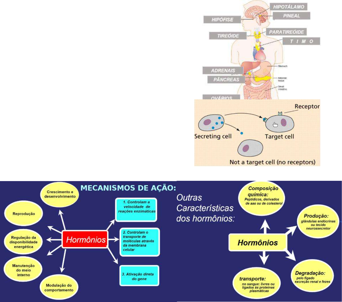 1 SISTEMA ENDÓCRINO (p. 01 até 05) *As glândulas endócrinas produzem HORMÔNIOS *Hormônios são responsáveis por funções contínuas, e geralmente de longo prazo, no organismo. *Os hormônios são mensageiros químicos, secretados no sangue. *Atuam em órgãos “distantes” (órgão alvo), e são efetivos em concentrações muito baixas (secretados na ordem de pico/nano gramas, por isso dificuldade de diagnóstico) *As células alvo possuem receptores específicos para esses hormônios. Agem em alvos diferentes com funções distintas. *Ex: crescimento, metabolismo, homeostase, reprodução *Funções gerais e mecanismos de ação (cobra na prova) 1.Quando desencadeia cascata, geram resposta mais rápidas. Ex.: cortisol. 2. Centro do hormônio é insulina, faz com que sejam inseridos transportadores de insulina na célula, para que transportem glicose para dentro da célula. 3. Ex.: hormônios tireoides *Os hormônios agem nas suas células-alvo de três maneiras básicas: (1) controlando a taxa de reações enzimáticas, (2) controlando o transporte de íons ou moléculas através de membranas celulares ou (3) controlando a expressão gênica e a síntese proteica. *Hidrossolúveis pode encontrar na forma livre e também com a proteína transportadora (mais rápido) *Hidrofóbicos encontramos na corrente sanguínea apenas com proteína transportadora. *A forma ativa dos hormônios é livre. A maioria dos hormônios é excretada via renal. 2 - HORMÔNIOS PEPTÍDICOS - • Formados por cadeias de diferentes tipos de aminoácidos • São a maioria dos hormônios corporais. • Os hormônios peptídicos são hidrossolúveis. • Tamanho: variam de 3 a 200 aminoácidos. • Exemplos: hormônios da adeno-hipófise e neuro-hipófise, insulina, glucagon. SÍNTESE: *Sintetizados no RE das células endócrinas, geralmente como pró- hormônios clivados no próprio RE até pró-hormônios menores. *Pró-hormônios são transferidos para o Aparelho de Golgi *Empacotamento em vesículas secretoras *Enzimas clivam os pró-hormônios até moléculas menores, biologicamente ativas. *Os hormônios são liberados por exocitose. *Estímulo para a liberação é da concentração citosólica de Ca. - HORMÔNIOS DERIVADOS DE AMINOÁCIDOS - *São hormônios derivados do aminoácido tirosina. I. TIREOIDE (T3 E T4) *Os hormônios da tireóide são sintetizados e armazenados (único hormônio que fica armazenado) incorporados a macromoléculas da proteína tireoglubulina. *Na tireoide, a tireoglobulina é clivada nas células da glândula, e os hormônios livres são secretados no sangue *Região medular da Adrenal (catecolaminas: epinefrina e norepinefrina. II. CATECOLAMINAS *Catecolaminas: epinefrina e norepinefrina. *As catecolaminas são sintetizadas na medula adrenal (A epinefrina é secretada 4x mais do que a norepinefrina) *Os hormônios da adrenal são armazenados em vesículas e liberados por exocitose, de maneira similar a liberação dos hormônios peptídicos *São neuro-hormônios que se ligam a receptores na membrana das células, assim como ocorre com os hormônios peptídicos. 3 - HORMÔNIOS ESTEROIDES - *São hormônios derivados de um único lipídio: colesterol. *Diferentemente dos hormônios peptídicos, que são produzidos em tecidos distribuídos por todo o corpo, os hormônios esteroides são produzidos apenas em alguns órgãos. • O córtex da glândula suprarrenal, a porção externa da glândula suprarrenal, produz diversos tipos de hormônios esteroides. *Os esteroides são lipofílicos e se difundem facilmente através de membranas, tanto para fora da sua célula secretora quanto para dentro das células-alvo. Essa propriedade também indica que as células que secretam esteroides não podem armazenar esses hormônios em vesículas secretoras. *Por essa razão, a maioria das moléculas de hormônios esteroides encontrados no sangue estão ligadas a proteínas carreadoras - COMPARAÇÃO DOS HORMÔNIOS - - REGULAÇÃO DOS RECEPTORES - *Os hormônios determinam a sensibilidade do tecido alvo através da regulação do número e sensibilidade dos receptores. 4 *FAZ COM OS PRÓPRIOS RECEPTORES. A. INFRARREGULAÇÃO (DOWNREGULATION) DOS RECEPTORES: *Se a secreção de um hormônio é anormalmente alta por um período, as células-alvo podem regular para baixo (diminuir o número de) os receptores desse hormônio, em um esforço para diminuir sua resposta ao hormônio em excesso *Exemplo: A progesterona infrarregula o seu próprio receptor e o receptor de estrogênios no útero. *Exemplo 02: Na hiperinsulinemia, os altos níveis sustentados de insulina no sangue fazem as células-alvo removerem seus receptores de insulina da membrana celular. Pacientes que apresentam hiperinsulinemia podem apresentar sinais de diabetes, apesar de seus altos níveis de insulina no sangue B. SUPRARREGULAÇÃO (UPREGULATION) DOS RECEPTORES: *Um hormônio aumenta o número ou a afinidade dos receptores para ele próprio ou para outro hormônio. *Exemplo: O estrogênio suprarregula, no ovário, o seu próprio receptor e o receptor de LH. - MECANISMO DE AÇÃO HORMONAL - - CONTROLE DA SECREÇÃO HORMONAL - 5 a) RITMO CIRCADIANO: *Reflexos aparentemente espontâneos que acontecem de maneira previsível são denominados “Ritmos Biológicos”. Aqueles que coincidem com o ciclo dia-noite são conhecidos como ritmo circadiano. *Maneira pela qual nosso organismo se adapta à duração do período claro (dia) e do período escuro (noite), de forma a sincronizar as funções fisiológicas, como a secreção hormonal, com a duração de um dia (aproximadamente 24 horas) *FUNCIONAMENTO: Núcleo supraquiasmático usa as informações captadas por um “fotorreceptor” localizado na retina capaz de identificar a luz e a ausência dela. b) RETROALIMENTAÇÃO NEGATIVA: *Quando uma determinada resposta é detectada, são elaborados comandos para que os órgãos efetores (neste caso, as glândulas) contrabalancem
