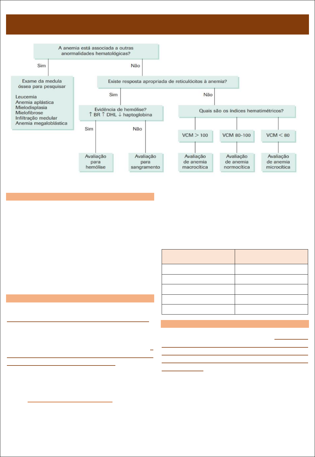 @anab_rs | Ana Beatriz Rodrigues Dra. Luciana Cardoso (cardiologista) 1 Anemia Roteiro de questões para avaliação inicial de um paciente com anemia2 â: diminuição; VCM: volume corpuscular médio. INTRODUÇÃO A anemia é uma condição muito comum, especialmente em determinadas faixas etárias. Raramente é uma doença por si só, sendo, quase sempre, consequência de alguma anormalidade genética ou adquirida. A maioria das doenças encontradas na prática clínica pode cursar com anemia. A deficiência de ferro é a causa mais frequente de anemia, seguida pela anemia de doenças crônicas. DEFINIÇÃO A anemia ocorre quando a massa de glóbulos vermelhos é insuficiente para oxigenar adequadamente os tecidos. Teoricamente, qualquer uma das 3 medidas de concentração que quantificam a série vermelha poderia ser usada para estabelecer a presença de anemia: a hemoglobina (g/gL), o hematócrito (%) ou o número de glóbulos vermelhos (quantidade/mm3). No entanto, existem limitações para a consideração de todos esses parâmetros, sendo o pior o número de glóbulos vermelhos, cuja concentração depende do tamanho deles. − A Hb é a medida mais utilizada. A Organização Mundial da Saúde (OMS) define anemia como uma redução na concentração de hemoglobina. Definir níveis normais de hemoglobina não é fácil, porque cada indivíduo tem a quantidade de hemoglobina adequada à sua massa muscular ou ao tecido metabolicamente ativo. Apesar disso, são necessários parâmetros para estudar populações e servir de referência na prática clínica. NÍVEIS DE HEMOGLOBINA INDICATIVOS DE ANEMIA AO NÍVEL DO MAR Grupos por faixa etária/gênero Hemoglobina (g/dl) 6 meses a 5 anos < 11 6 anos a 14 anos < 12 Homens adultos < 13 Mulheres adultas < 12 Mulheres gravidas < 11 EFEITOS CLÍNICOS Os sintomas de anemia devem-se à redução da capacidade de transportar oxigênio do sangue e à alteração do volume sanguíneo total, associadas à capacidade compensatória dos sistemas pulmonar e cardiovascular. A velocidade de desenvolvimento das alterações é crucial para a intensidade dos sintomas. Quanto mais abrupta for a queda no volume sanguíneo e/ou nos níveis de hemoglobina, mais intensos serão os sintomas. Assim, nas hemorragias agudas ou nas crises hemolíticas, os pacientes apresentam sintomas mais intensos do que nos quadros de instalação lenta e de longa duração. @anab_rs | Ana Beatriz Rodrigues Dra. Luciana Cardoso (cardiologista) 2 São sintomas proeminentes nos casos agudos ou de instalação rápida dispneia, palpitações, tontura e fadiga extrema. Nas anemias crônicas, sejam constitucionais ou de instalação lenta, como por exemplo acontece na anemia ferropênica, o paciente pode permanecer assintomático ou pouco sintomático, mesmo com níveis muito baixos de hemoglobina. De modo geral, nas anemias crônicas, ocorre apenas dispneia moderada ou palpitações, embora, em alguns pacientes, insuficiência cardíaca congestiva ou angina pectoris possa ser a primeira manifestação. A doença de base ou as doenças associadas, particularmente cardiopulmonares, também interferem na intensidade das manifestações clínicas e na adaptação do paciente à anemia. Outros sintomas de anemia são cefaleia, vertigem, hipotensão postural e fraqueza muscular. Palidez é um sinal de anemia, embora vários fatores além da hemoglobina interfiram na coloração da pele. A palidez relacionada à anemia é mais bem detectada nas mucosas da boca, das conjuntivas e do leito ungueal. Icterícia associada à palidez sugere anemia hemolítica. Glossite e alterações das papilas linguais podem ocorrer nas anemias carenciais. Úlceras de perna podem estar presentes nas anemias hemolíticas constitucionais, especialmente na anemia falciforme. Sopros cardíacos são comuns, geralmente sistólicos, de intensidade moderada e mais audíveis no bordo esternal esquerdo. Algumas anemias, especialmente as hemolíticas, podem cursar com esplenomegalia. Várias alterações oftalmológicas têm sido descritas acompanhando as anemias, incluindo hemorragia em chama de vela, exsudatos e tortuosidade venosa afetando a retina. CLASSIFICAÇÃO Existem muitos modos de classificar as anemias, mas, provavelmente, a maneira mais útil para uma abordagem clínica eficiente é a associação da classificação fisiopatológica e da morfológica, porque elas são facilmente aplicáveis a partir dos dados do hemograma e da contagem de reticulócitos. CLASSIFICAÇÃO FISIOPATOLÓGICA Baseia-se na contagem de reticulócitos, o qual é um marcador da produção de eritrócitos. Além disso, reticulócitos são hemácias mais jovens que ainda possuem restos de RNA. A contagem pode ser expressa: − Como porcentagem ou como contagem absoluta (mm3); − Se expressa em porcentagem, e na presença de anemia, deve ser corrigida pelo número total de eritrócitos presentes. Do ponto de vista fisiopatológico, as anemias classificam- se em: − Anemias por falta de produção ou hiporregenerativas; − Anemias por excesso de destruição ou regenerativas; − Anemias por perdas sanguíneas. ANEMIAS POR FALTA DE PRODUÇÃO OU HIPORREGENERATIVAS São caracterizadas por contagem absoluta de reticulócitos (porcentagem de reticulócitos vezes o número de eritrócitos) abaixo de 50.000/mm3 ou < 1%. São sempre decorrentes de produção deficiente de glóbulos vermelhos por acometimento primário ou secundário da medula óssea ou por falta de fator estimulante da eritropoese (eritropoetina) ou ainda pela carência de elementos essenciais à eritropoese (ferro, vitamina B12 e ácido fólico). Podem também acompanhar doenças inflamatórias, infecciosas e neoplásicas (anemia de doenças crônicas, muitas vezes denominada anemia da inflamação). ANEMIAS POR EXCESSO DE DESTRUIÇÃO OU REGENERATIVAS As anemias regenerativas são definidas como anemias com contagens elevadas de reticulócitos (acima de 100.000/ mm3 ou > 1,