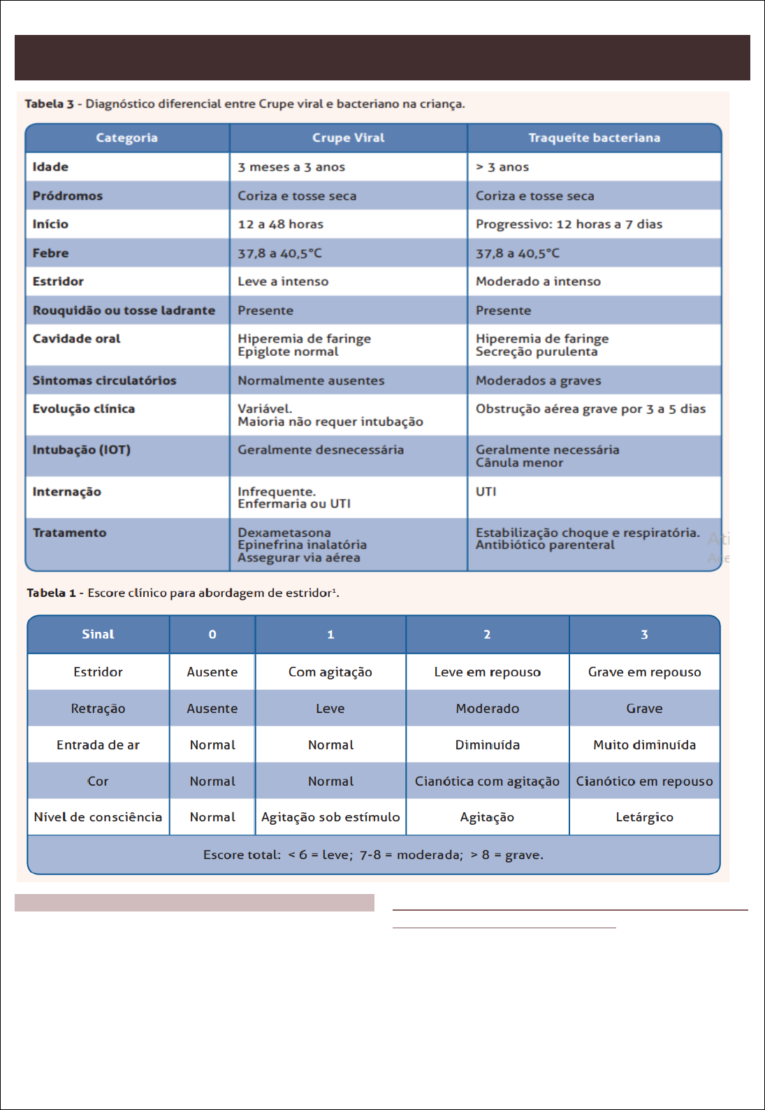 @anab_rs | Ana Beatriz Rodrigues 1 Crupe ANATOMIA Estridor é o som respiratório produzido pela passagem de ar em uma via aérea de grosso calibre estreitada. Ocorre nas vias aéreas superiores, que se estendem da faringe aos brônquios principais. Anatomicamente, as vias aéreas superiores estão divididas em três áreas principais: via aérea supraglótica (acima das cordas vocais), via aérea glótica e subglótica e via aérea intratorácica. Diferentes partes das vias aéreas podem sofrer colapso com maior facilidade que outras, o que explica as diferentes apresentações clínicas das doenças das vias aéreas superiores. Por exemplo, o tecido supra glótico não contém cartilagem e sofre colapso mais facilmente na inspiração. Por outro lado, a glote e a traqueia, são compostas por cartilagem e sofrem menos colapso, mas quando apresentam obstrução geram estridor durante a inspiração e a expiração. @anab_rs | Ana Beatriz Rodrigues 2 VIA AÉREA SUPRAGLÓTICA A via aérea supraglótica compreende as vias aéreas do nariz até justamente acima das cordas vocais. Esta parte das vias aéreas se distende e sofre colapso facilmente, por não possuir cartilagem. Devido à presença de múltiplos planos de tecidos, infecções localizadas neste segmento podem se disseminar e formar abscessos, rapidamente. Exemplos de infecções da via aérea supraglótica incluem abscesso retrofaríngeo, supraglotite infecciosa e difteria. Estridor a partir de obstrução supraglótica, geralmente produz um som ouvido primariamente durante a inspiração, pois há colapso deste segmento da via aérea durante a pressão negativa exercida na inspiração. Na expiração, a via aérea insufla-se, e há melhora da obstrução. A salivação pode estar presente, se a obstrução ocorrer acima do esôfago, impedindo a deglutição. A voz abafada, ou de “batata quente” é característica, e é gerada por obstrução acima das cordas vocais, que geralmente, não estão envolvidas. Doenças que causam obstrução supraglótica têm potencial de obstruir rapidamente as vias aéreas, por ser esta região de fácil colapso, tornando-as letais. VIAS AÉREAS GLÓTICA E SUBGLÓTICA As vias aéreas glótica e subglótica estendem-se das cordas vocais à traqueia, antes de entrar na cavidade torácica. Esta parte da via aérea não sofre tanto colapso quanto a via aérea supraglótica, porque é sustentada por cartilagem na maior parte de seu trajeto: cartilagem cricoide e anéis cartilaginosos da traqueia. A causa mais comum de obstrução desta região é a síndrome do crupe. A inflamação ou obstrução da glote gera rouquidão, devido ao comprometimento das cordas vocais, e não abafamento da voz, como nas doenças da região supraglótica. O estridor ocorre durante a inspiração, ou durante a inspiração e a expiração. VIA AÉREA INTRATORÁCICA A via aérea intratorácica compreende a traqueia alojada dentro da cavidade torácica e os brônquios principais. Obstrução desta porção da via aérea gera estridor mais audível durante a expiração. Na expiração a pressão intratorácica aumenta e causa o colapso da via aérea intratorácica. Na inspiração, a via aérea intratorácica tende a expandir-se, diminuindo a ausculta dos ruídos respiratórios. CRUPE VIRAL INTRODUÇÃO O termo “síndrome do crupe” caracteriza um grupo de doenças que variam em envolvimento anatômico e etiologia, e se manifestam clinicamente com os seguintes sintomas: rouquidão, tosse ladrante, estridor predominantemente inspiratório e graus variados de desconforto respiratório. Quando a etiologia desta síndrome é viral, denomina-se crupe viral. Outras etiologias para síndrome do crupe incluem traqueíte bacteriana e difteria. A doença também pode ser classificada de acordo com o grau de extensão do acometimento das vias aéreas pelos vírus respiratórios. − Assim, se a doença se restringir à laringe, denomina-se laringite, sendo caracterizada principalmente por rouquidão e tosse ladrante. − Se a inflamação comprometer laringe e traqueia, é denominada laringotraqueíte, com sintomas característicos de síndrome do crupe. − Se houver comprometimento de bronquíolos associado ao de laringe e traqueia, além dos sintomas de crupe, haverá tempo expiratório prolongado e sibilos, caracterizando laringotraqueobronquite. Quando a criança com crupe tem quadros recorrentes da doença, outras etiologias devem ser afastadas, como refluxo gastroesofágico, papilomatose recorrente de laringe, estenose laringotraqueal e anormalidades congênitas. ETIOLOGIA E EPIDEMIOLOGIA Laringotraqueobronquite é a causa mais comum de obstrução de vias aéreas superiores em crianças, respondendo por 90% dos casos de estridor. A doença responde por 1,5% a 6% das doenças do trato respiratório na infância. A etiologia viral de crupe é a mais comum, sendo os principais agentes os vírus parainfluenza (tipos 1,2 e 3), influenza A e B e vírus respiratório sincicial. Em crianças maiores de 5 anos tem importância etiológica Mycoplasma pneumoniae. Acomete crianças de 1 a 6 anos de idade, com pico de incidência aos 18 meses, predominantemente no gênero masculino (1,4 a 2 vezes mais comum que no feminino). Embora a maioria dos casos ocorra no outono e inverno, o crupe viral se manifesta durante todo o ano. PATOGÊNESE A infecção viral inicia na nasofaringe e se dissemina através do epitélio respiratório da laringe, traqueia e árvore bronco-alveolar. De acordo com o grau de extensão da lesão do epitélio respiratório, teremos diferentes achados no exame físico. Há inflamação difusa, eritema e edema das paredes da traqueia e alteração de mobilidade das cordas vocais. A mucosa da região subglótica é pouco aderente, permitindo a formação de um edema significante com potencial comprometimento das vias aéreas. Em lactentes, 1 mm de edema na região subglótica, causa 50% de diminuição do calibre d