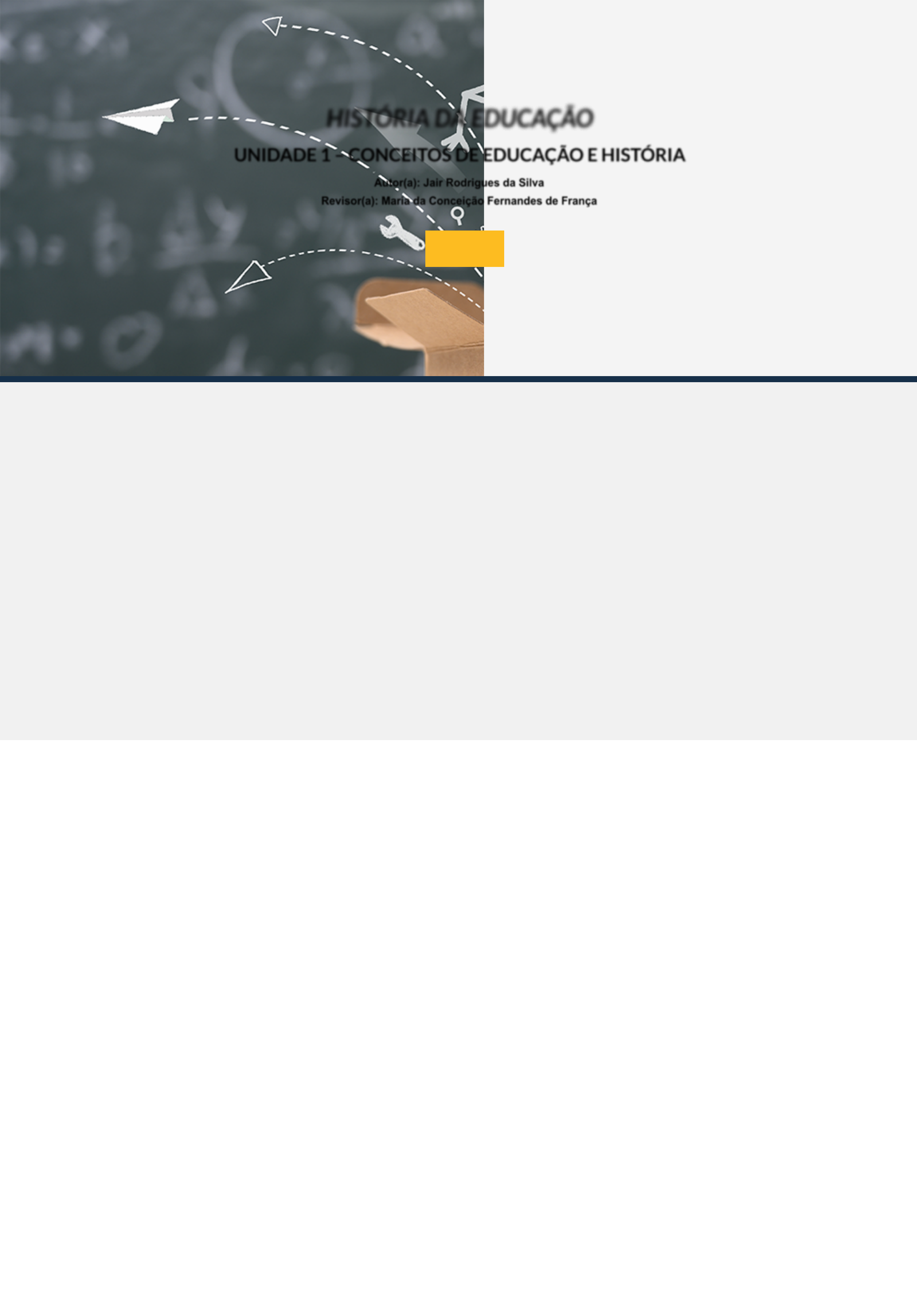 HISTÓRIA DA EDUCAÇÃOHISTÓRIA DA EDUCAÇÃO UNIDADE 1 – CONCEITOS DE EDUCAÇÃO E HISTÓRIAUNIDADE 1 – CONCEITOS DE EDUCAÇÃO E HISTÓRIA Autor(a): Jair Rodrigues da SilvaAutor(a): Jair Rodrigues da Silva Revisor(a): Maria da Conceição Fernandes de FrançaRevisor(a): Maria da Conceição Fernandes de França INICIAR 1.1 Conceitos de educação e história e a importância de estudar a história da Educação para a ação dos futuros educadores Nessa primeira seção, vamos abordar os conceitos de educação e, posteriormente, de história. Conceituar esses termos têm grande significado para a formação de educadores e educadoras. Abordaremos, em seguida, a importância do estudo da história da educação, sendo esse nosso objetivo maior em toda a disciplina: realizar a reflexão sobre como os processos históricos influenciam nos modos como concebemos a educação. Acreditamos que é por meio da consciência crítica, tanto do que é educação, quanto do que é história e, principalmente, sobre a importância de estudar a história da educação, que futuros docentes podem exercer sua prática em sala de aula de modo efetivo. 1.1.1 Conceituando educação Quais os significados para o termo educação ? A palavra permite diversas interpretações e significados a depender do contexto em que se utiliza. De modo geral, educação se refere ao ensino . Seja esse desenvolvido em instâncias formais ou não formais. De fato, é regra geral o entendimento que educação não se restringe apenas à escola. Esse conceito de educação, que não é restrito à escola, é o que vamos discutir na seção. Pensando nas sociedades pré-históricas, ou seja, nas sociedades tribais, não havia uma organização de escola tal como conhecemos atualmente e nem parecida. Todavia podemos dizer seguramente que a educação era presente no cotidiano dessas sociedades. Isso porque as pessoas passavam o conhecimento sobre a vida como modo de sobrevivência. O conhecimento era passado a partir das interações familiares e em comunidade. Os mais novos aprendiam lições importantes para sua própria sobrevivência. Lições referentes aos alimentos, perigos etc. Sendo assim, a educação era exercida como atividade fundamental para a manutenção da vida. Nesse contexto, não havia um lugar privilegiado para a atividade de ensino-aprendizado, assim, podemos entender Introdução Caro(a) estudante, Nesta unidade, vamos conhecer e debater os conceitos de educação e história. Nosso objetivo maior nesta primeira unidade será o de refletir sobre a história da educação. Como futuros educadores, é de fundamental importância conhecermos os principais processos históricos que fizeram a educação ser constituída como vemos hoje. Portanto vamos abordar períodos históricos da evolução educacional e, ao longo da disciplina, nos deteremos na história da educação brasileira. Inicialmente, é necessário que nos identifiquemos como seres históricos que somos. Isso porque produzimos e vivenciamos história durante nossa ação de ser e estar no mundo. Somos sujeitos históricos à medida que nos relacionamos em sociedade e dela participamos. Conhecer a história da educação é uma importante etapa de formação dos professores. É necessário ter consciência crítica dos processos evolutivos e dos diferentes momentos históricos da educação, o que sem dúvidas nos conduziu aos sistemas de ensino e os modos de conceber as atividades de ensino-aprendizagem como conhecemos e praticamos na atualidade. Bons estudos! que se tratava de uma educação não formal, como ainda é comum nos dias de hoje. Ainda sobre sociedades tribais, Aranha (2006) disse: Estamos tão acostumados com a escola que às vezes nos parece estranho o fato de que essa instituição não existiu sempre, em todas as sociedades. Nos demais capítulos, veremos as condições do aparecimento da escola, as transformações ao longo do tempo, e também a relação indissolúvel entre ela e o modo pelo qual os indivíduos interagem para produzir a sua existência (ARANHA, 2006, p. 32). É possível entender que, de modo geral, as sociedades primitivas não possuíam um Estado, sem correr risco de cair no etnocentrismo, que é o risco de julgar uma sociedade tendo como referência a cultura, como menciona Aranha (2006). Dizemos que as sociedades antigas não tinham necessidade de instituições como bancos, hospitais, escolas etc. Diante dessa perspectiva, essas sociedades não se ressentiam da falta dessas instituições, incluindo a escola. Quando se tratava da educação das crianças, o modo de ensino era por meio do exemplo, da atividade prática. Em um ambiente assim, não havia um ente especial destinado à tarefa de ensinar. Aranha (2006) ressalta que: Nas comunidades tribais as crianças aprendem imitando os gestos dos adultos nas atividades diárias e nos rituais. Tanto nas tribos nômades como naquelas que já se sedentarizaram, para se ocupar com a caça, a pesca, o pastoreio ou a agricultura, as crianças aprendem “para a vida e por meio da vida”, sem que ninguém esteja especialmente destinado para a tarefa de ensinar (ARANHA, 2006, p. 35). Entretanto, como foi dito, não é por isso que a relação de ensino e aprendizado deixava de existir no cotidiano dessas comunidades. A educação estava presente como uma atividade permanente. Como uma ação de se constituir um sujeito histórico e de produzir história. Essas sociedades eram prioritariamente orais, mas, ainda assim, deixaram registradas ao longo de séculos seus conhecimentos. Seus registros eram feitos por meio da pintura rupestre, pintadas em cavernas que, ainda hoje, preservam suas marcas, conforme exemplo da Figura 1. Figura 1 – Pintura rupestre: Curva de las manos, Argentina. Fonte: Adobe Stock. Acesso em: 30/10/2020. #PraCegoVer : Fotografia da pintura rupestre “Cueva de las manos”, feita há aproximadamente 9.000 anos por indígenas locais, na