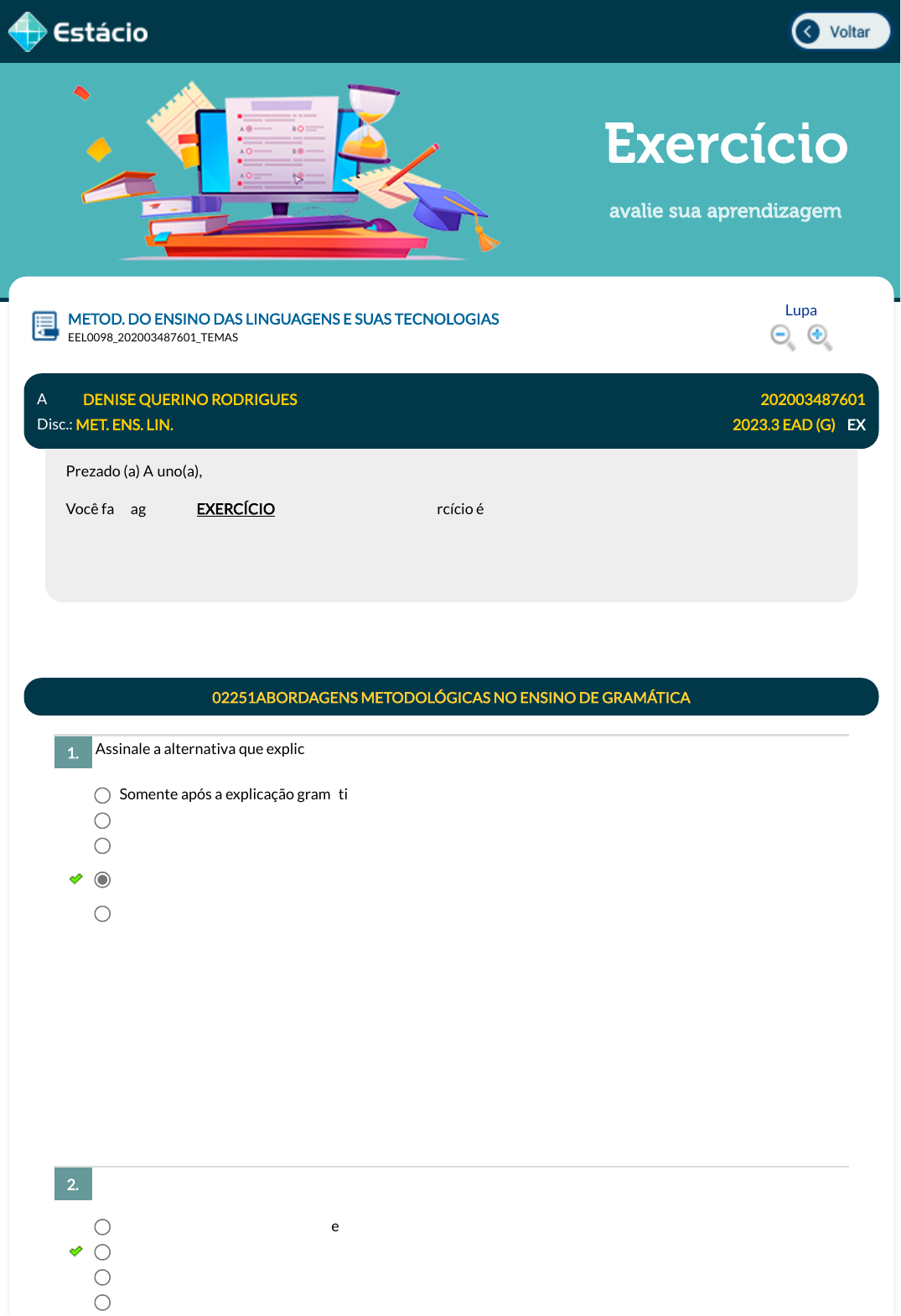 Exercício avalie sua aprendizagem Assinale a alternativa que explica a etapa de conceptualização na abordagem da gramática re�exiva: Sobre os conceitos de gramática, assinale a alternativa CORRETA: METOD. DO ENSINO DAS LINGUAGENS E SUAS TECNOLOGIAS Lupa EEL0098_202003487601_TEMAS Aluno: DENISE QUERINO RODRIGUES Matr.: 202003487601 Disc.: MET. ENS. LIN. 2023.3 EAD (G) / EX Prezado (a) Aluno(a), Você fará agora seu EXERCÍCIO! Lembre-se que este exercício é opcional, mas não valerá ponto para sua avaliação. O mesmo será composto de questões de múltipla escolha. Após responde cada questão, você terá acesso ao gabarito comentado e/ou à explicação da mesma. Aproveite para se familiarizar com este modelo de questões que será usado na sua AV e AVS. 02251ABORDAGENS METODOLÓGICAS NO ENSINO DE GRAMÁTICA 1. Somente após a explicação gramatical o aluno é capaz de conceptualizar o mecanismo linguístico em estudo. Trabalha-se a competência semântica do aluno. Nesta etapa, o aluno conhece a regra de funcionamento do mecanismo linguístico. O aluno é levado a criar uma representação do mecanismo linguístico em estudo a partir de uma situação de comunicação real. O aluno realiza atividades de sistematização a �m de conceptualizar o mecanismo linguístico. Data Resp.: 04/10/2023 20:08:07 Explicação: A gramática re�exiva parte das situações de comunicação e uso da língua para se chegar as regras dessa língua, assim, na conceptualização o aluno deve elaborar uma representação da regularidade ou do mecanismo linguístico que identi�cou. As demais alternativas não devem ser assinaladas porque não trazem a�rmações pertinentes à etapa de conceptualização. 2. O conceito de gramática é único e não admite abordagens diferentes. A gramática explícita possui uma �nalidade pedagógica e sempre esteve associada à linguagem escrita. A gramática não é um conceito, mas um manual que contém regras de uso da língua. O conhecimento inato das regras de construção de frases foi teorizado pelos behavioristas. javascript:voltar(); javascript:voltar(); javascript:voltar(); javascript:voltar(); javascript:diminui(); javascript:diminui(); javascript:aumenta(); javascript:aumenta(); Conforme a BNCC, a Língua Inglesa apresenta os seguintes eixos a serem considerados na produção de proposta curricular: oralidade, leitura escrita, conhecimentos linguísticos e dimensão intercultural. Relacione as colunas abaixo correspondentes às atividades para cada um destes eixos: 1) Oralidade. 2) Leitura. 3) Escrita. 4) Conhecimentos linguísticos. 5) Dimensão intercultural. ( ) Estratégias de leituras, práticas de leitura e construção de repertorio lexical, atitudes e disposições favoráveis do leitor. ( ) Estudo do léxico, gramática. ( ) Interação discursiva, compreensão oral, produção oral. ( ) A língua inglesa no mundo, a língua inglesa no cotidiano da sociedade brasileira/comunidade. ( ) Estratégias de escrita: pré-escrita, práticas de escrita. Assinale a alternativa que apresenta a sequência correta: A gramática internalizada é um conjunto de regras transmitidas aos falantes, para o desenvolvimento da expressão oral e escrita. Data Resp.: 04/10/2023 20:08:42 Explicação: A escrita sempre foi privilegiada na chamada gramática explícita, voltada para o estabelecimento e preservação da norma padrão. As demais alternativa estão incorretas porque a gramática internalizada não é transmitida, há diversas abordagens sobre a língua o que conduz também há diferentes conceitos de gramática, a gramática não se reduz a um manual de regras e os behavioristas não estão ligados ao conceito inatista de gramática. 03231LINGUAGENS EM PERSPECTIVA 3. 2, 3, 1, 5 e 4 1, 3, 2, 5 e 4 2, 3, 5, 1 e 4 1, 2, 3, 4 e 5 2, 3, 1, 4, e 5 Data Resp.: 04/10/2023 20:10:01 Explicação: Estes eixos são conceituados da seguinte forma: oralidade trata da interação discursiva, compreensão oral, produção oral; a leitura trata de estratégias de leituras, práticas de leitura e construção de repertorio lexical, atitudes e disposições favoráveis do leitor; já a escrita, trata das estratégias de leituras, práticas de leitura e construção de repertorio lexical, atitudes e disposições favoráveis do leitor; em relação aos conhecimentos linguísticos, o foco é nas estratégias de escrita: pré-escrita, práticas de escrita; �nalizando, a dimensão intercultural, discute a língua inglesa no mundo, a língua inglesa no cotidiano da sociedade brasileira/comunidade. As TICS são as tecnologias de informação e comunicação; já as NTICs são as novas tecnologias de informação e comunicação. Esta tecnologia instrumentaliza a mediação pedagógica para a construção de sujeitos multiletrados digitais. Sobre esta a�rmação, está(ão) correta(s) a(s) seguinte(s) alternativa(s). I. As NTICs chegaram para substituir as TICs. Já é obsoleto o uso de livros e cadernos, todo o registro é digital. II. A forma como os estudantes interagem com o conhecimento se tornou digital, mas a escola continua fazendo circular em seus espaços de mediação pedagógica, as notícias, crônicas, contos, texto publicitários e todo tipo de texto e gênero textual que possa contribuir na formação de sujeitos letrados e multiletrados. III. As diferentes linguagens transitam no espaço escolar e passam a fazer parte do cotidiano dos estudantes. Cabe aos educadores tornar os conhecimentos expressos por estas linguagens, experiências signi�cativas para a vida dos estudantes. Está(ão) correta(s) a(s) alternativa(s): A BNCC é um documento normativo que busca atuar sobre o conteúdo curricular. Para o ensino de língua portuguesa o estudante deve, por vezes, identi�car ou classi�car, além de produzir a produção. Qual ao domínio esperado do estudante, segundo a BNCC, para ensino de língua portuguesa? (ENADE / 2017) Nas sociedades contemp