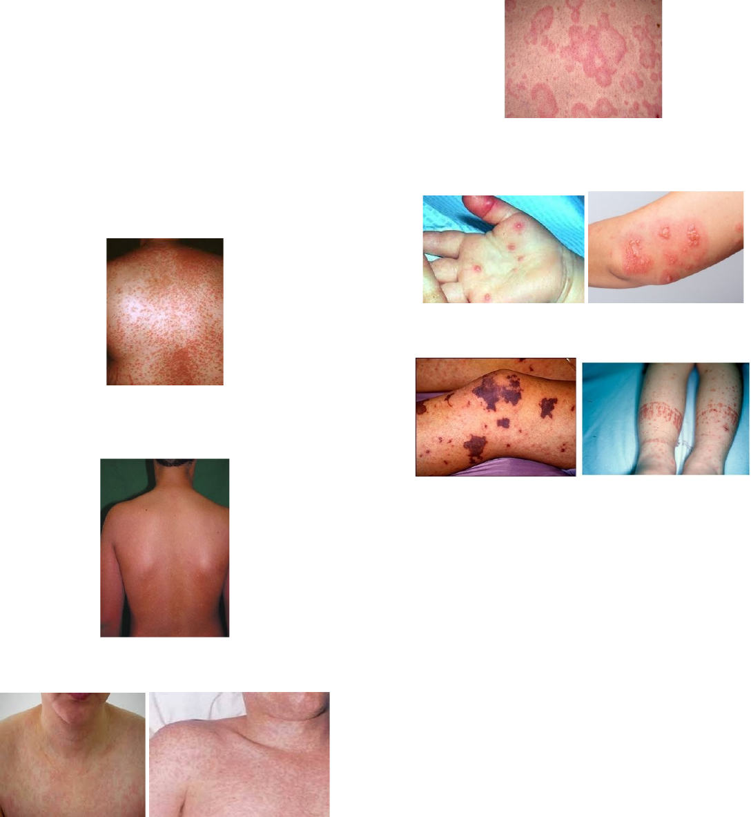 DOENÇAS EXANTEMÁTICAS: CLASSIFICAÇÃO DOS EXANTEMAS Maculopapular: máculas e pápulas, tem vários tipos: Morbiliforme: áreas de pele sã no meio das pápulas Escarlatiniforme: vermelhidão total, não vê aéreas sa no meio das manchas Rubeoliforme: mais claro Urticariforme: bordas elevadas, edema Papulovesicular: vesículas em cima das pápulas Petequial ou purpúrico: petéquias ou púrpuras ROSEOLA INFANTUM: (Exantema súbito): mais frequente na pediatria -Herpes virus, adenovirus, enterovirus... -6-24 meses ( 90%) -Febre alta 3-5 dias -Sintomas respiratórios leves: coriza, tosse, pulmão, ouvidos e faringe normais -Diarréia -Exantema de distribuição crâneo caudal após cessar a febre. Diagnóstico clínico. Tratamento sintomático: antitérmico, lavagem nasal exantema de distribuição crânio-caudal, após cessar a febre (3-5 dias), logo fica normal e curado ERITEMA INFECCIOSO: vermelhidão em bochechas - fácies esbofeteada Parvovírus Humano B19 (HPV B19), *mais comum em pré-escolares. *incubação é de 4 a 15 dias. *mal-estar e febre * “face esbofeteada” (lesões eritematosas nas regiões zigomáticas, poupando a região centrofacial) *Exantema reticulado nas extremidades e no tronco, é característico. *Pode haver prurido, artralgia ou artrite principalmente em adolescentes e recidiva do exantema após exercícios físicos e banhos quentes. *Lesões purpúricas-petequiais e manifestações hemorrágicas são menos frequentes, mas podem ocorrer. Diagnóstico clínico. Tratamento sintomático. Raríssimas complicações, exceto em pacientes imunocomprometidos. MÃO-PÉ-BOCA: *enterovirose ( Coxsackie A16, A10 e Enterovírus 71) *altamente contagiosa, incubação de 4-6 dias. *Pródromo frustro, com febre e mal-estar, *seguido de enantema oral e a seguir exantema. *Exantema caracterizado por vesículas em forma de losango - achatadas, em regiões palmo-plantares com halo eritematoso. *Lesões em área de fraldas são comuns. *Pré-escolares e escolares são os mais acometidos, mas pode ocorrer em adolescentes e adultos. Tem fome, mas não consegue comer TTO sintomático: dipirona, ibuprofeno, hexomedine, malvatricin, bromelin própolis aplicar antes das refeições, alimentação que evite sal, sucos não ácidos ESCARLATINA: -Streptococcus pyogenes - 2 a 10 anos - Febre alta, mal estar Faringoamigdalite membranosa concomitante Pele áspera – lixa Palidez peribucal ( Sinal de Filatov) tudo vermelho, poucas áreas claras linhas marcadas nas dobras cutâneas - SINAL DE PASTIA língua em framboesa descamação em mãos e pés, dedo de luva, inicia-se após 1 semana Tratamento 1ª escolha : Penicilina Benzatina IM 600.000 UI < 25 kg e 1200.000 UI > 25 kg 2ª escolha:* Amoxicilina ou Amoxicilina + clavulanato 50 mg/kg/dia por 10 dias *Eritromicina 50 mg/kg/dia por 7 dias *Cefalosporinas por 10 dias * Axetil cefuroxima 20 mg/kg/dia por 7 dias * Claritromicina 15 mg /kg/dia por 7 dias Complicações Agudas: Abscessos, fasciíte necrotizante, Bacteremia, síndrome do choque tóxico estreptocóccico, Endocardite Pioartrite, osteomielite, Peritonite, Meningite e abscesso cerebral, Tardias: Glomerulonefrite difusa aguda, Febre reumática, Eritema nodoso, eritema multiforme, Poliarterite nodosa, artrite reativa. A letalidade é alta nos casos de bacteremia estreptocóccica e choque séptico estreptocóccico. * NOTIFICAÇÃO NÃO COMPULSÓRIA RUBÉOLA: -Rubivirus -Faixa etária: todas não imunizadas Febre baixa + adenomegalia retroauricular, occipital, cervical posterior Após 5 dias: · Exantema craniocaudal · Curso Benigno · Tratamento sintomático. notificação compulsória Diagnóstico laboratorial : Sorologia 28 dias após o início do exantema. Importância Epidemiológica: SÍNDROME DA RUBÉOLA CONGÊNITA * Abortamento * Natimorto * Cardiopatia congênita * Surdez congênita * Catarata congênita VARICELA: catapora Vírus Varicela-Zoster(VVZ) Altamente contagiosa Predomínio na infância Imunidade duradoura Período de incubação 7-14 dias Febre, astenia, cefaléia Lesões em vários estágios *máculas *pápulas *vesículas *pústulas *crostas - Duração em torno de 10 dias COMPLICAÇÕES: * Infecção bacteriana secundária *Pneumonia viral *Afecções virais do SNC Tardiamente * Herpes zoster Tratamento · Cuidados de higiene · Loções/cremes calmantes da pele · Antihistamínicos · Antibióticos S/N · Diagnóstico laboratorial: PCR do liquido das vesículas * NOTIFICAÇÃO NÃO COMPULSÓRIA SARAMPO: Morbillivirus Faixa etária: Todas não imunizadas -Febre alta > 38.5 -Coriza, tosse -Lacrimejamento/ conjuntivite=> MANCHAS DE KOPLIK: Período de infecção em torno de 7 dias -Período prodrômico - 2 dias febre, tosse, coriza, conjuntivite, fotofobia -3º ao 4º dia Prostração, acentuação dos sintomas anteriores Exantema maculopapular, vermelho, retroauricular -Período toxêmico: Super Infecção viral ou bacteriana -Remissão Diminuição dos sintomas, exantema escurecido, descamação furfurácea EXANTEMA MACULOPAPULAR: Diagnóstico * Clínico * Laboratorial Anticorpos específicos 28 dias após o surgimento do exantema Tratamento * Sintomático Prevenção * vacinação *NOTIFICAÇÃO COMPULSÓRIA FEBRE MACULOSA BRASILEIRA: “Doença do carrapato” BACTÉRIA: Rickettsia rickettsii. Principais vetores: carrapatos do gênero Amblyomma Gravidade variável Quadro clínico: início abrupto, febre elevada, cefaleia, vômitos/diarréia/dor abdominal, mialgia intensa e/ou prostração, exantema maculopapular sem prurido, evolução centrípeta ( membros inferiores, regiões palmar e plantar) pode evoluir para petéquias, equimoses e hemorragias. Diagnóstico laboratorial: *Identificação de anticorpos por imunofluorescência indireta (RIFI) a partir do 7º dia do início dos sintomas *Imunohistoquímica. Identificação da bactéria a partir de amostras biopsiadas de pele. * Hemocultura. Tratamento - Medidas de suporte - Antibioticoterapia: *Doxiciclin